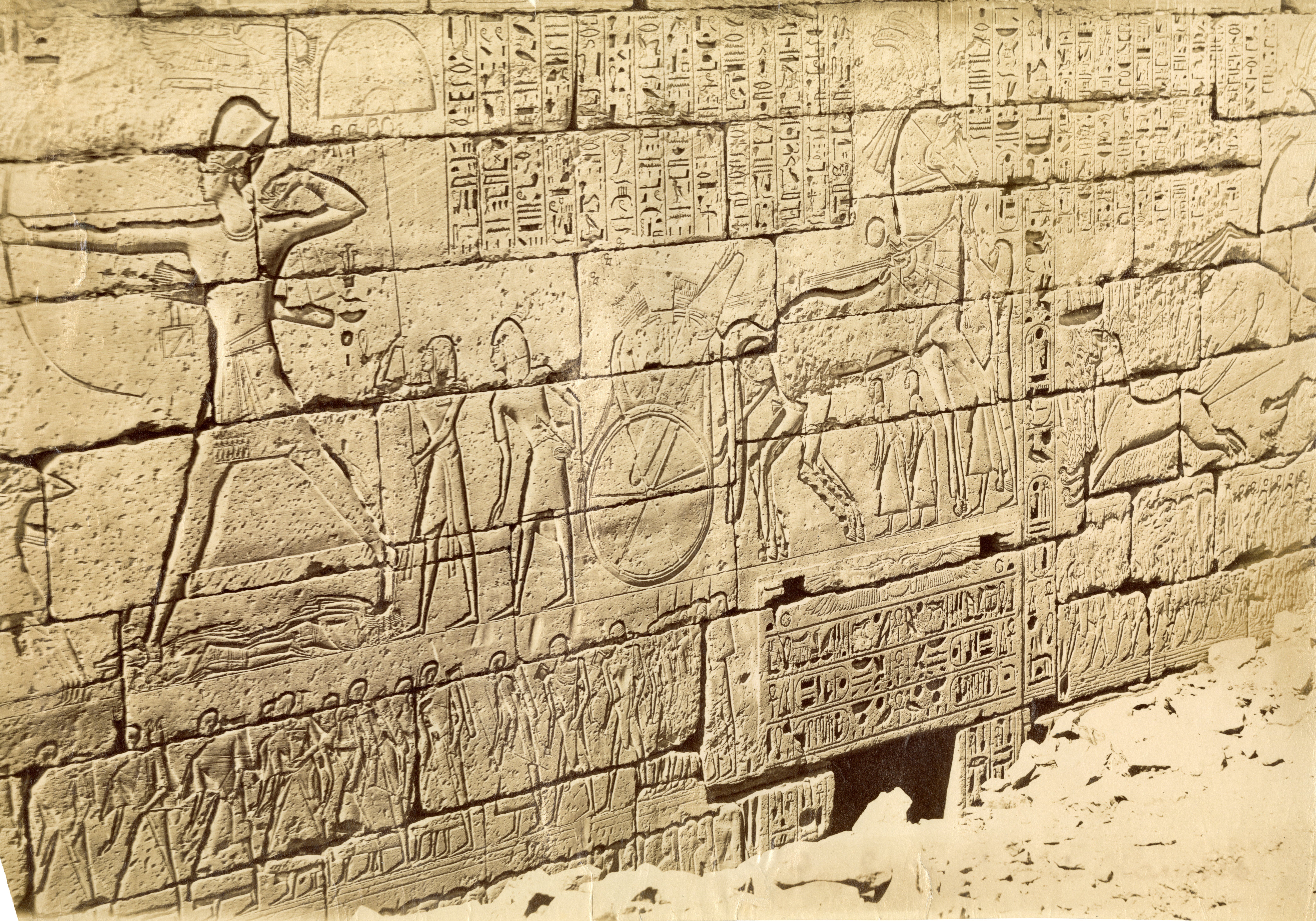 Lo scatto offre uno scorcio della decorazione parietale esterna settentrionale del tempio di Medinet Habu, costruito da Ramesse III, sulla Riva Occidentale di Tebe, a destra della battaglia navale. Tra i soggetti si vedono il re in tenuta da arciere nell'atto di scoccare una freccia (a sinistra) contro i Popoli del mare (non visibili in questo scatto), il carro reale con gli attendenti che si prendono cura dei cavalli (al centro) e un leone colpito dalle frecce nascosto nella vegetazione del deserto (a destra). La parte inferiore del muro è ancora da liberare, si trova sotto il livello del terreno. Si può attribuire lo scatto ad Antonio Beato.