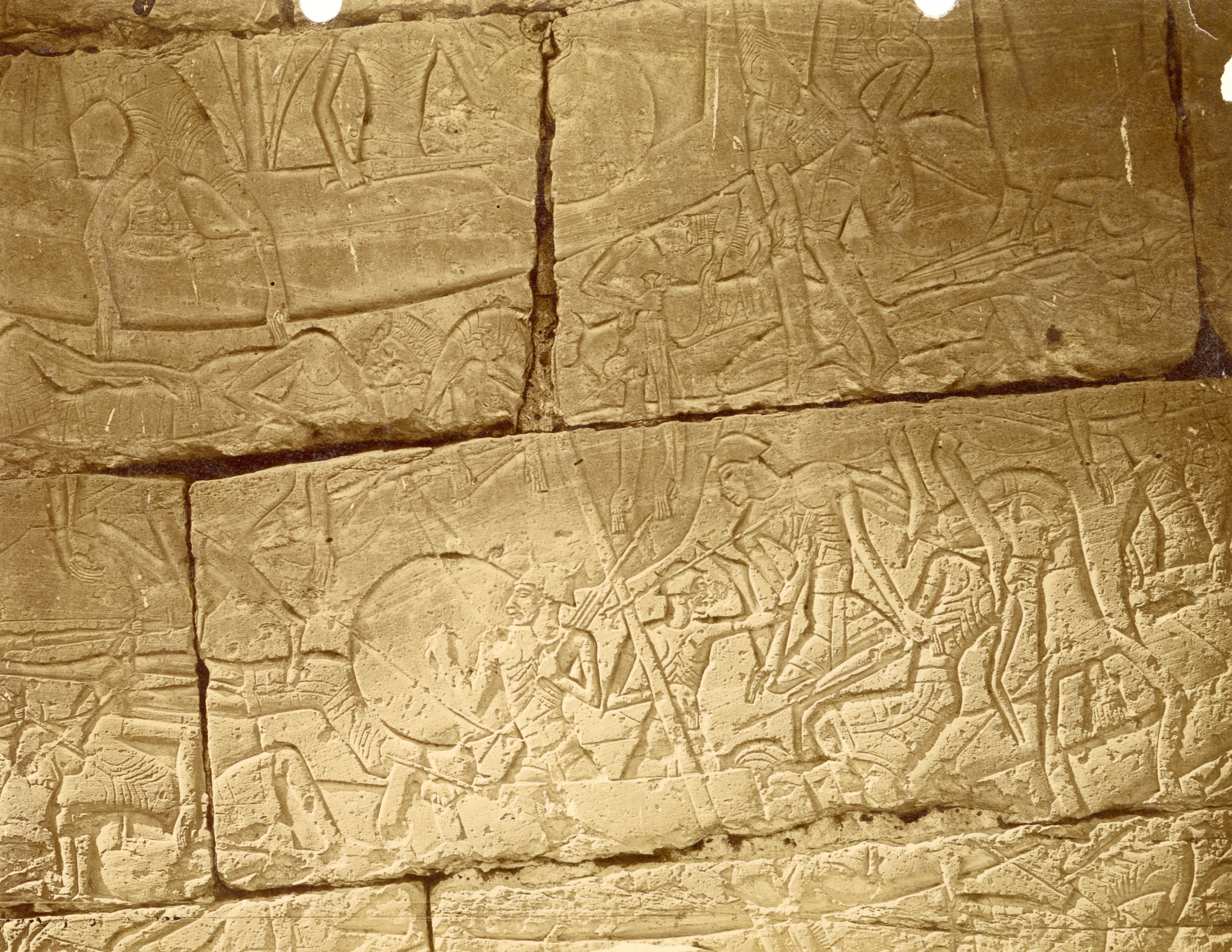 La fotografia presenta alcune scene scolpite a rilievo inciso dalle pareti esterne del Tempio di Medinet Habu, in cui il faraone Ramesse III rappresenta la sua vittoria contro i Popoli del mare.