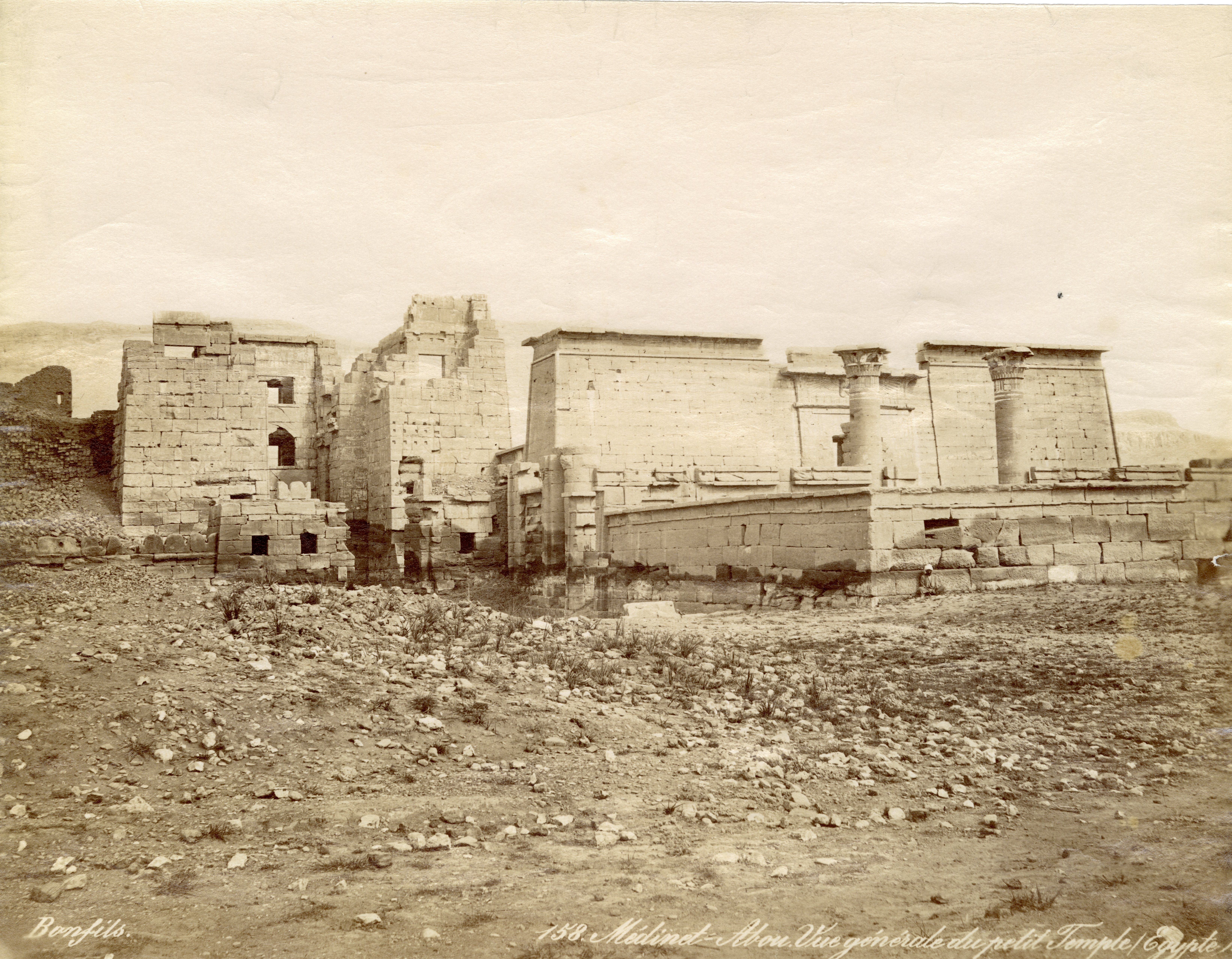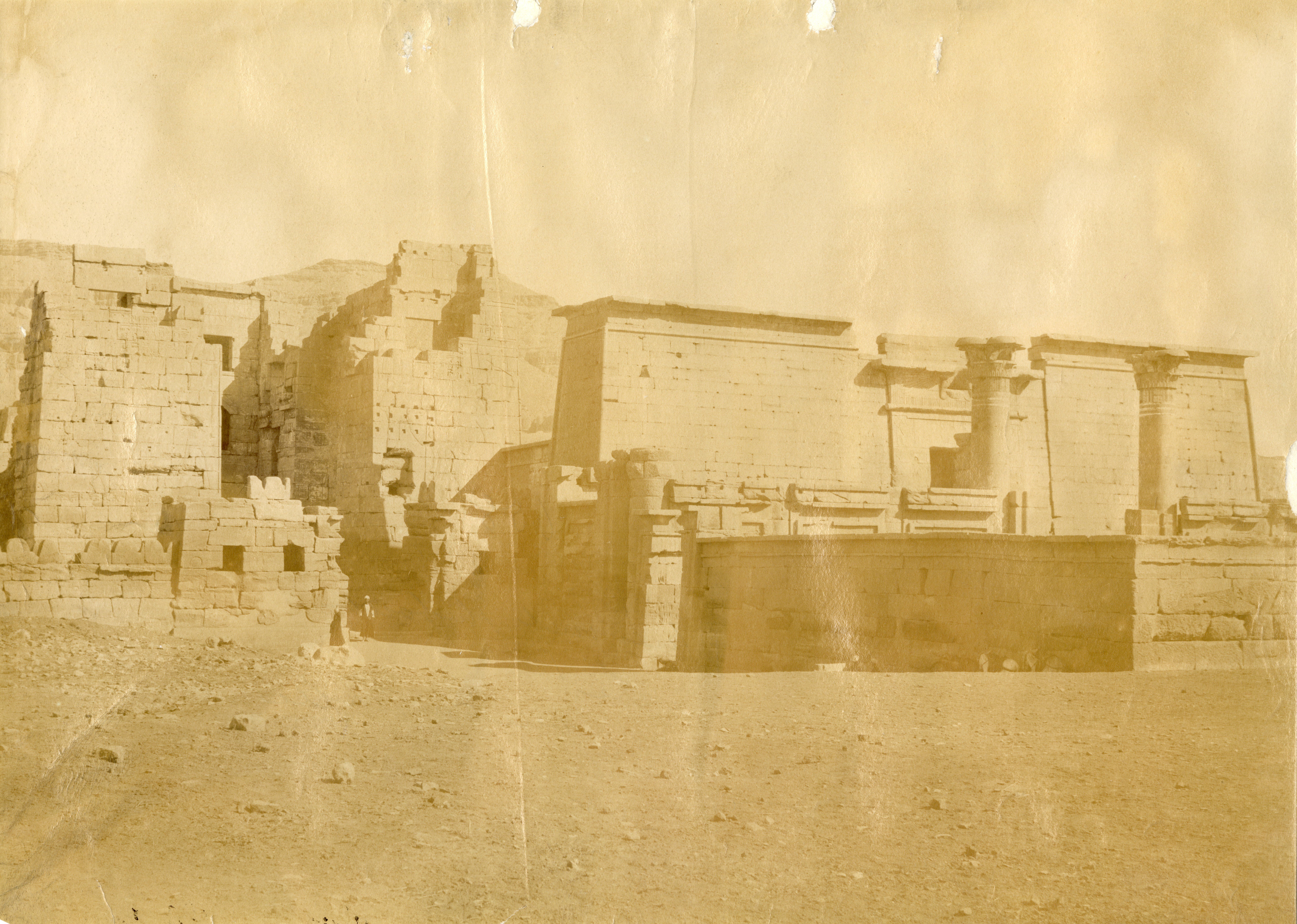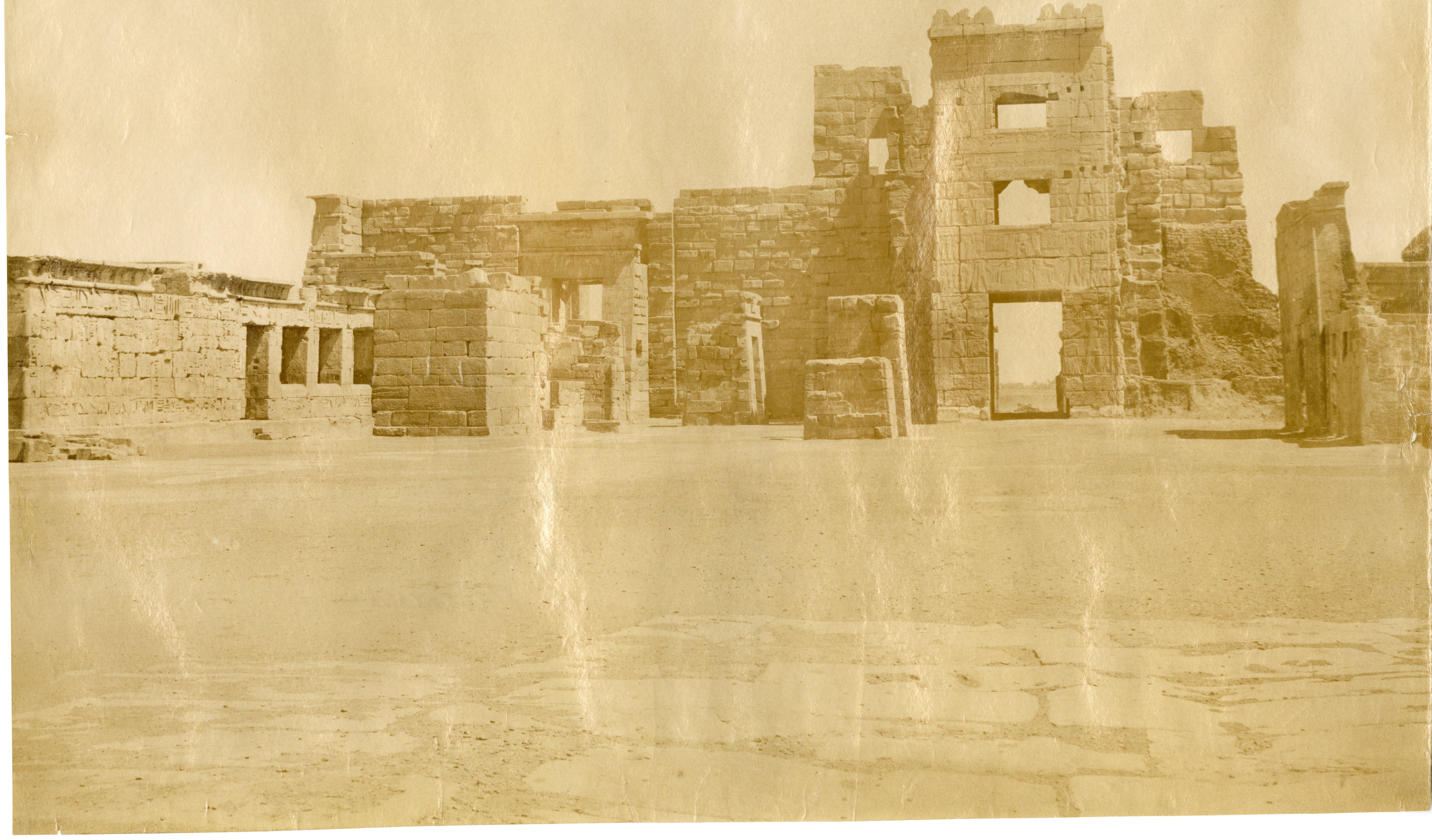 Veduta dell'angolo nord-ovest del primo cortile del tempio di Medinet Habu sulla riva occidentale di Tebe, costruito da Ramesse III, e facciata anteriore del secondo pilone. La fotografia presenta la firma dell’autore, in basso a destra, in maniera speculare e molto poco leggibile.