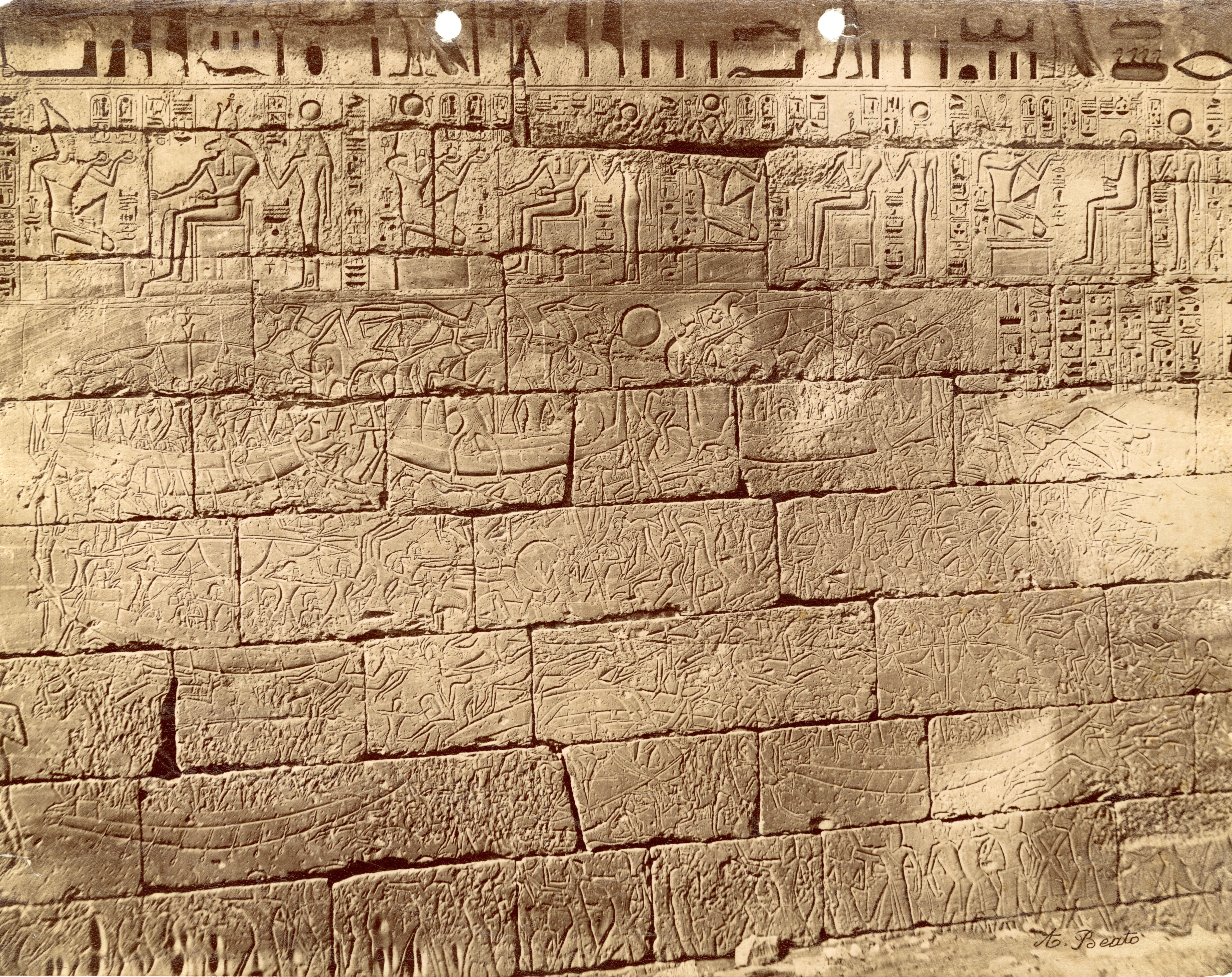 Nella fotografia è rappresentata una battaglia navale tratta dalla parete esterna settentrionale del tempio funerario del faraone Ramesse III a Medinet Habu. Si riconoscono i Popoli del mare, sconfitti dagli egiziani. Nel registro superiore, il faraone Ramesse III compie dei rituali d'offerta in onore di diverse divinità. La firma dell’autore è posta in basso a destra.