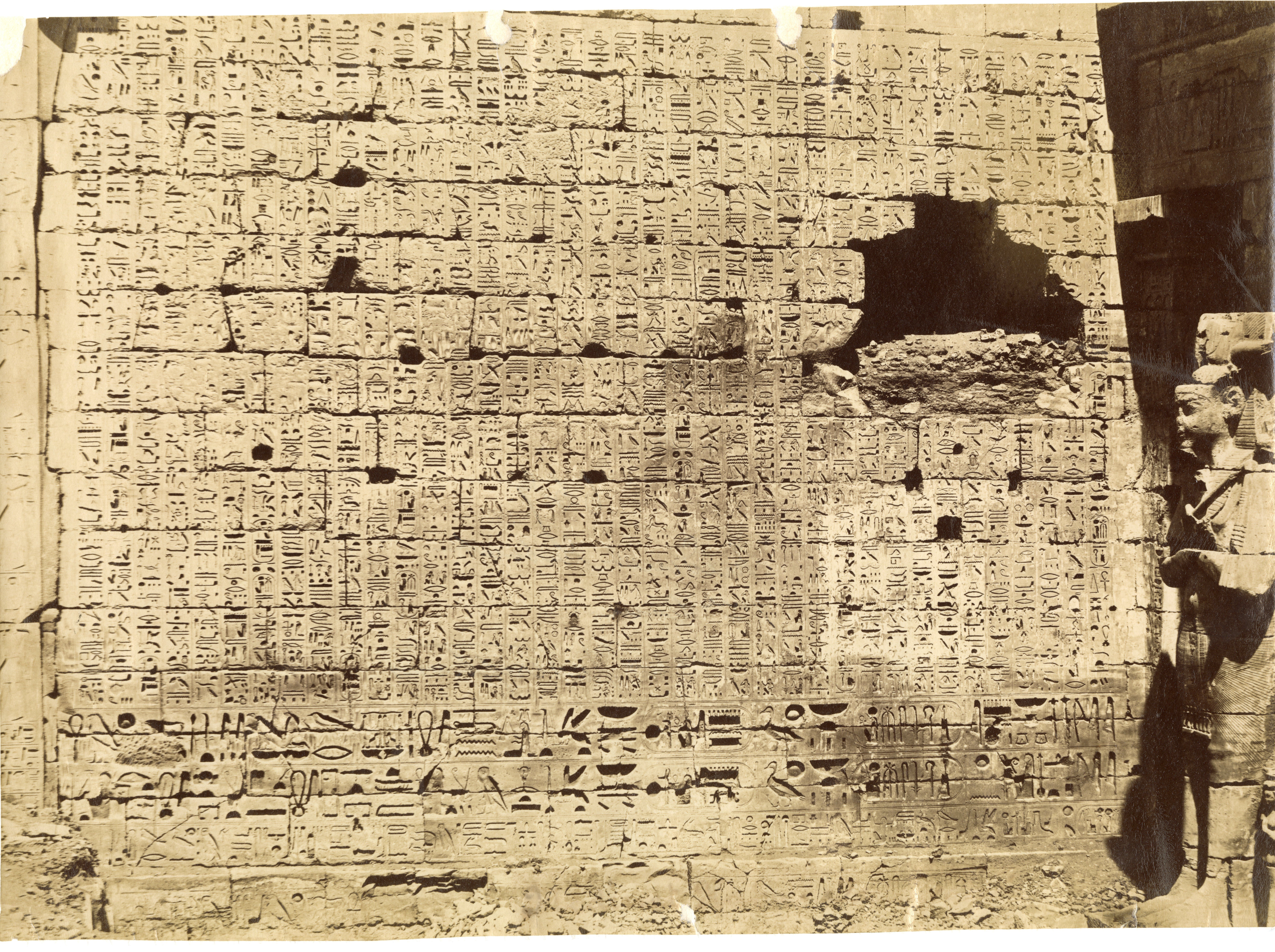 Nella foto è rappresentato un primo piano dei testi sul II pilone del tempio di Ramesse III a Medinet Habu, fotografato dal primo cortile. Sulla destra si scorge anche uno dei colossi osiriaci del colonnato a nord.