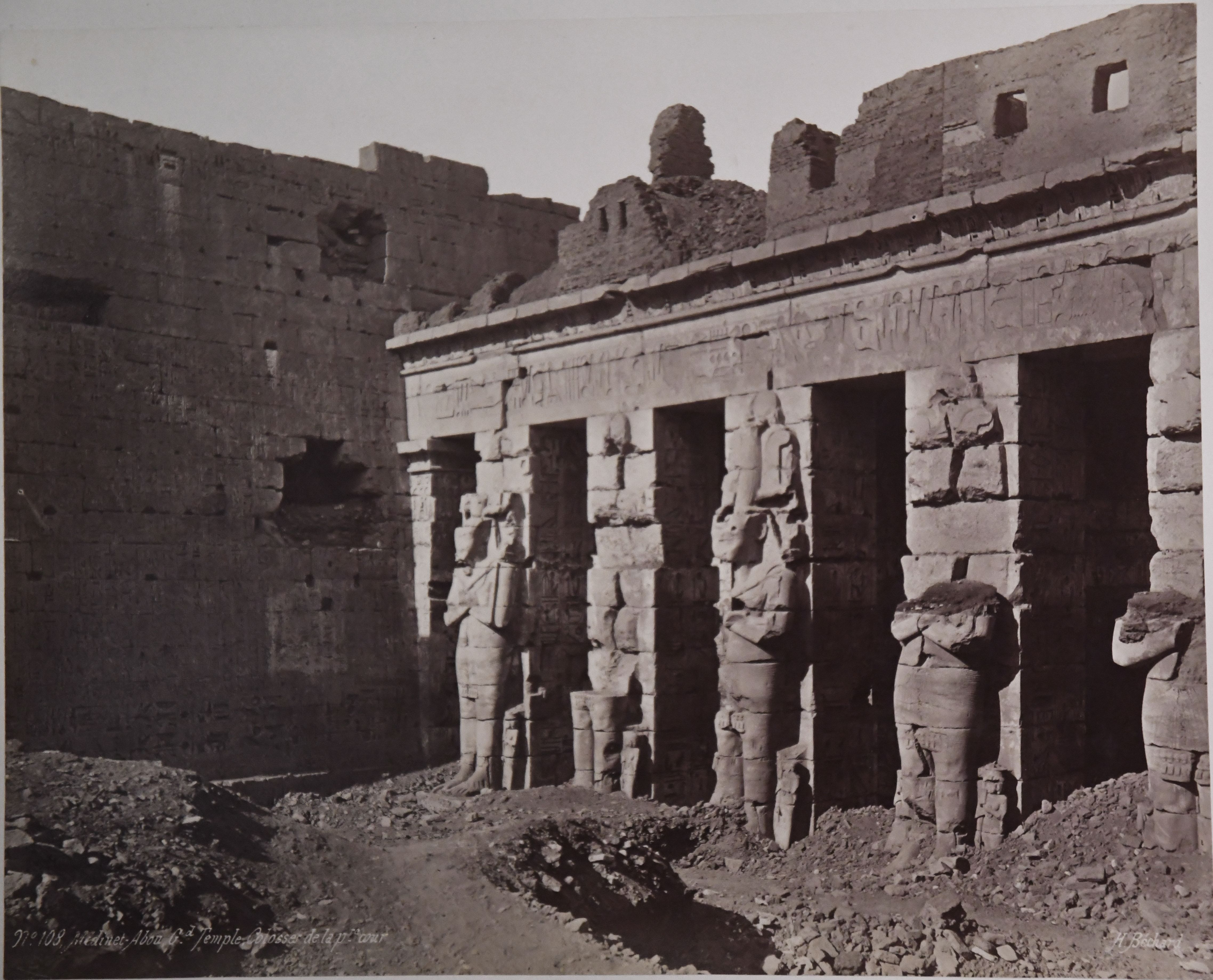 La fotografia mostra la facciata est (lato nord) del II pilone del tempio di Medinet Habu a Tebe Ovest, costruito da Ramesse III, e il primo cortile del tempio. Da notare che il livello del suolo originario è ancora ricoperto da sabbia e detriti, che coprono le basi delle statue e formano, nel cortile, una superficie irregolare. La firma dell'autore è apposta in basso a destra.