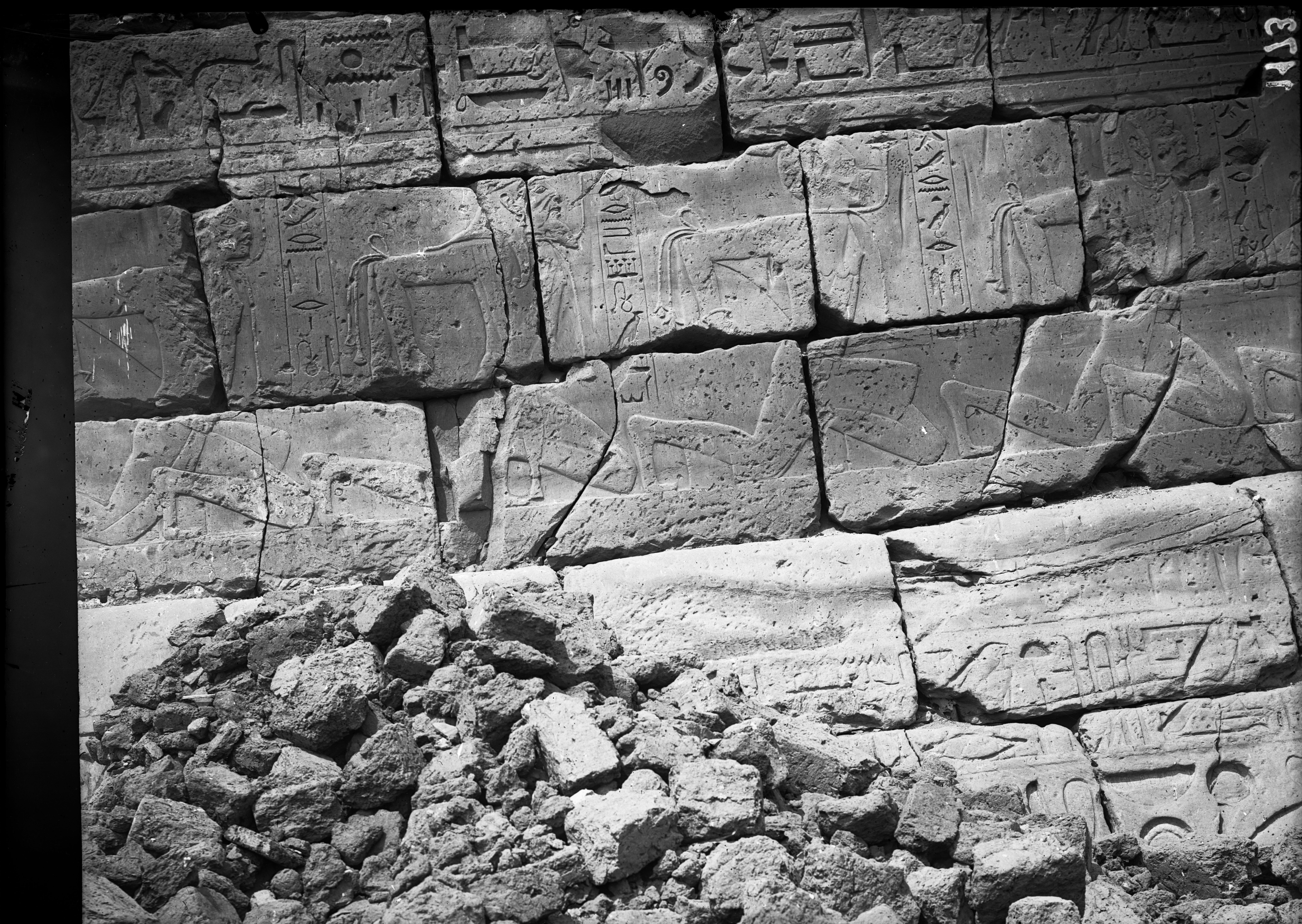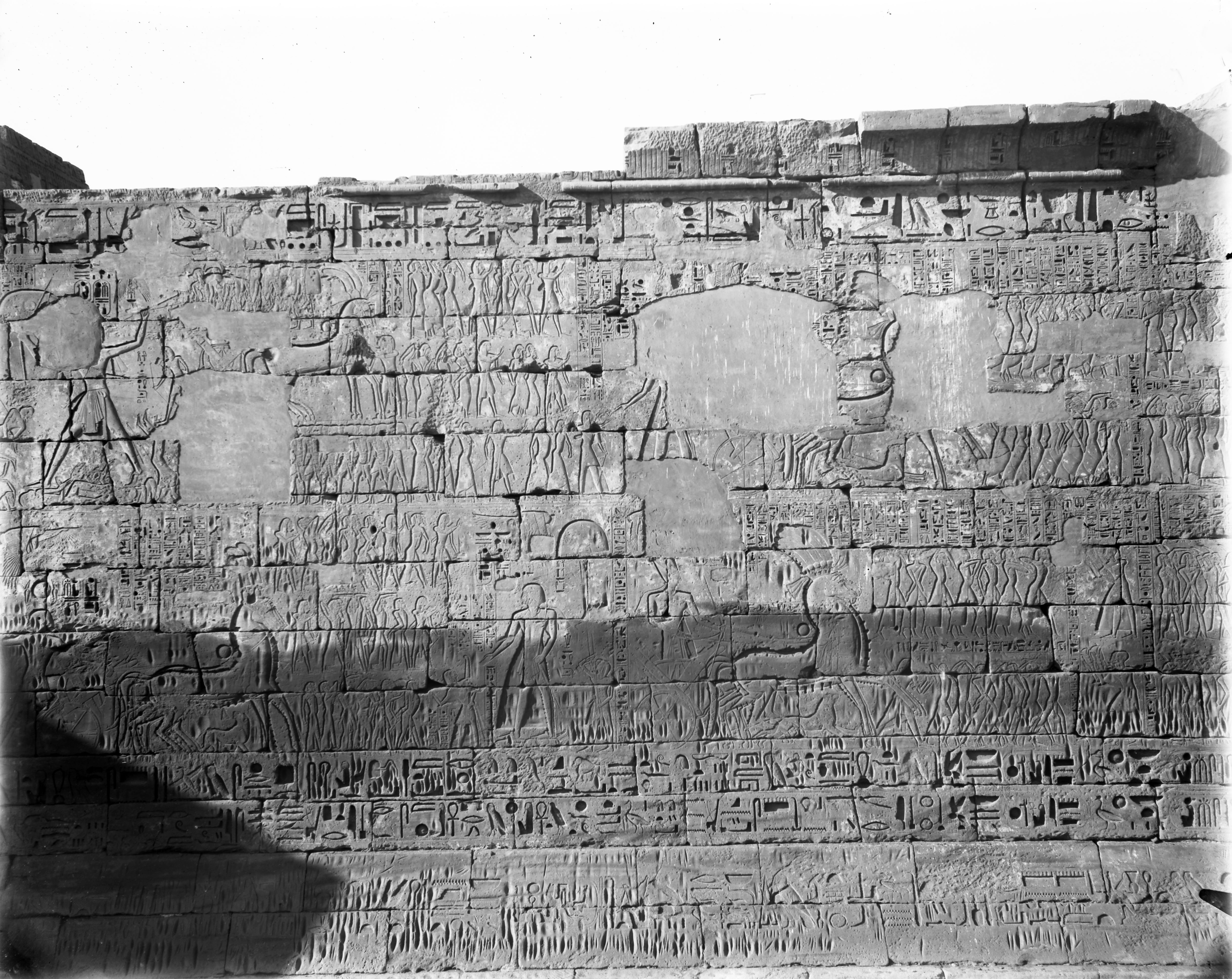 Facciata esterna del muro nord del tempio di Ramesse III, tra il I e il II pilone.