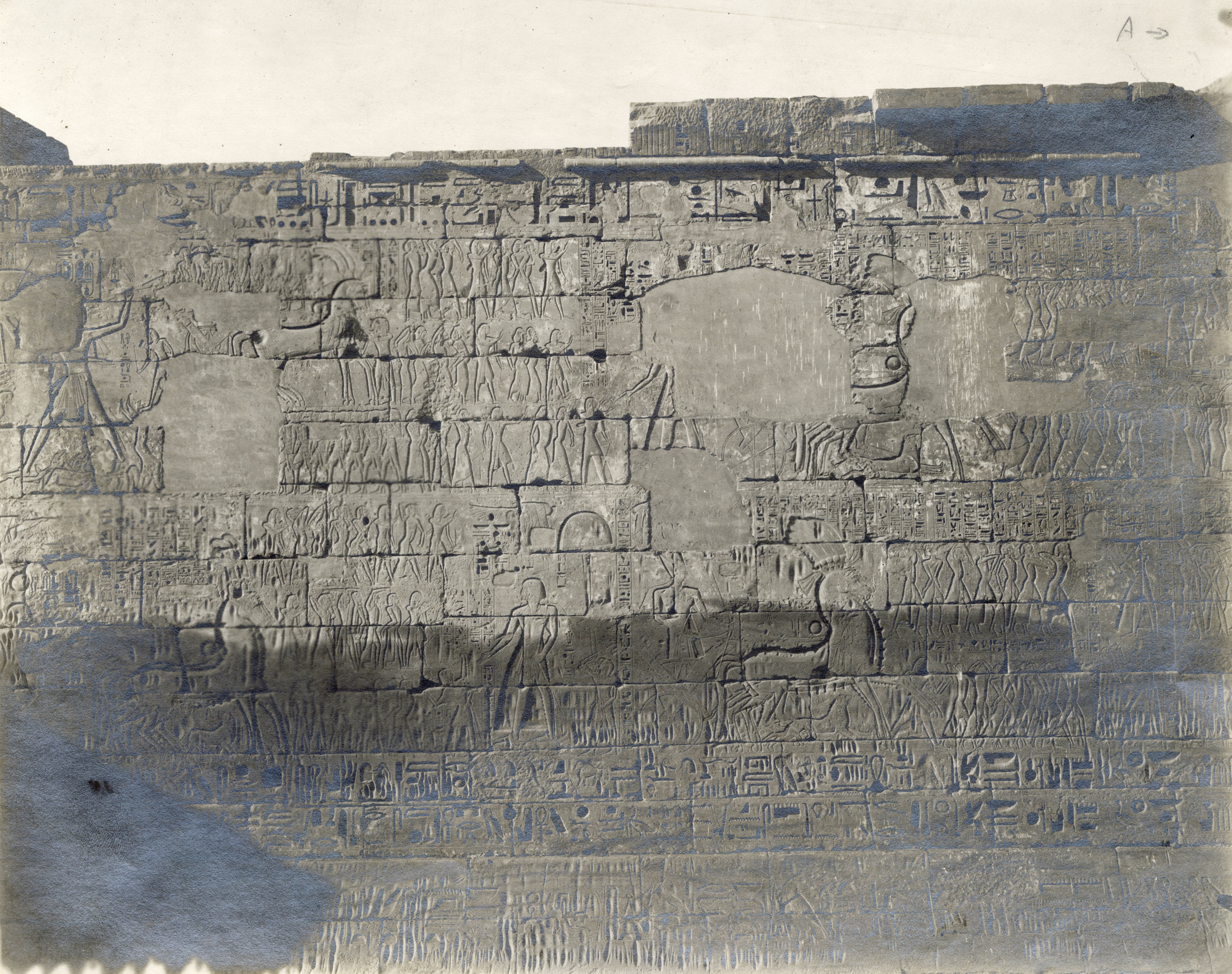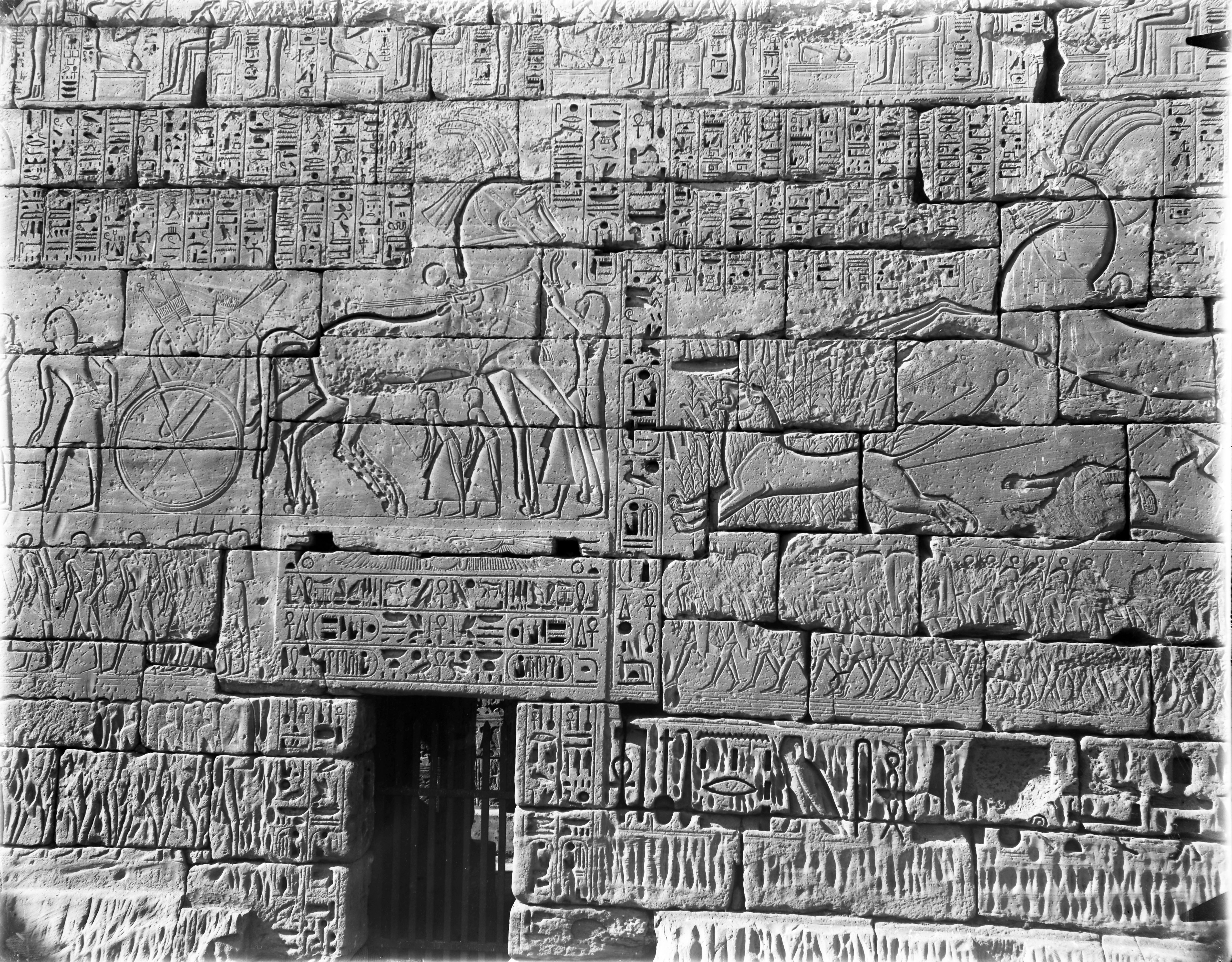 Facciata esterna del muro nord del tempio di Ramesse III, presso l‘accesso alla seconda corte. Nella scena principale, Ramesse III è rappresentato mentre caccia i leoni.