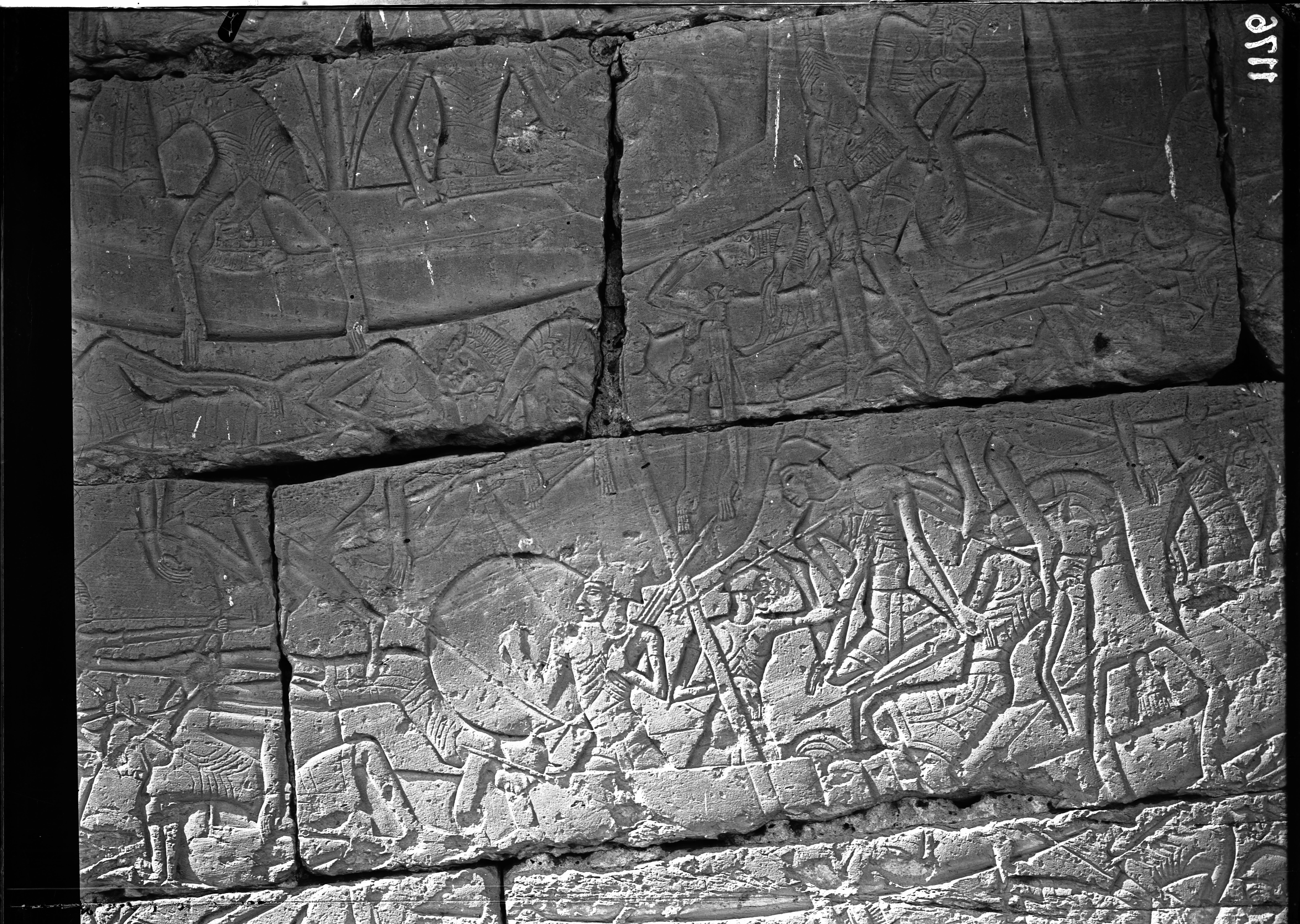 Scena di battaglia tra Ramesse III e i Popoli de mare sulla facciata esterna del muro nord del tempio di Ramesse III.