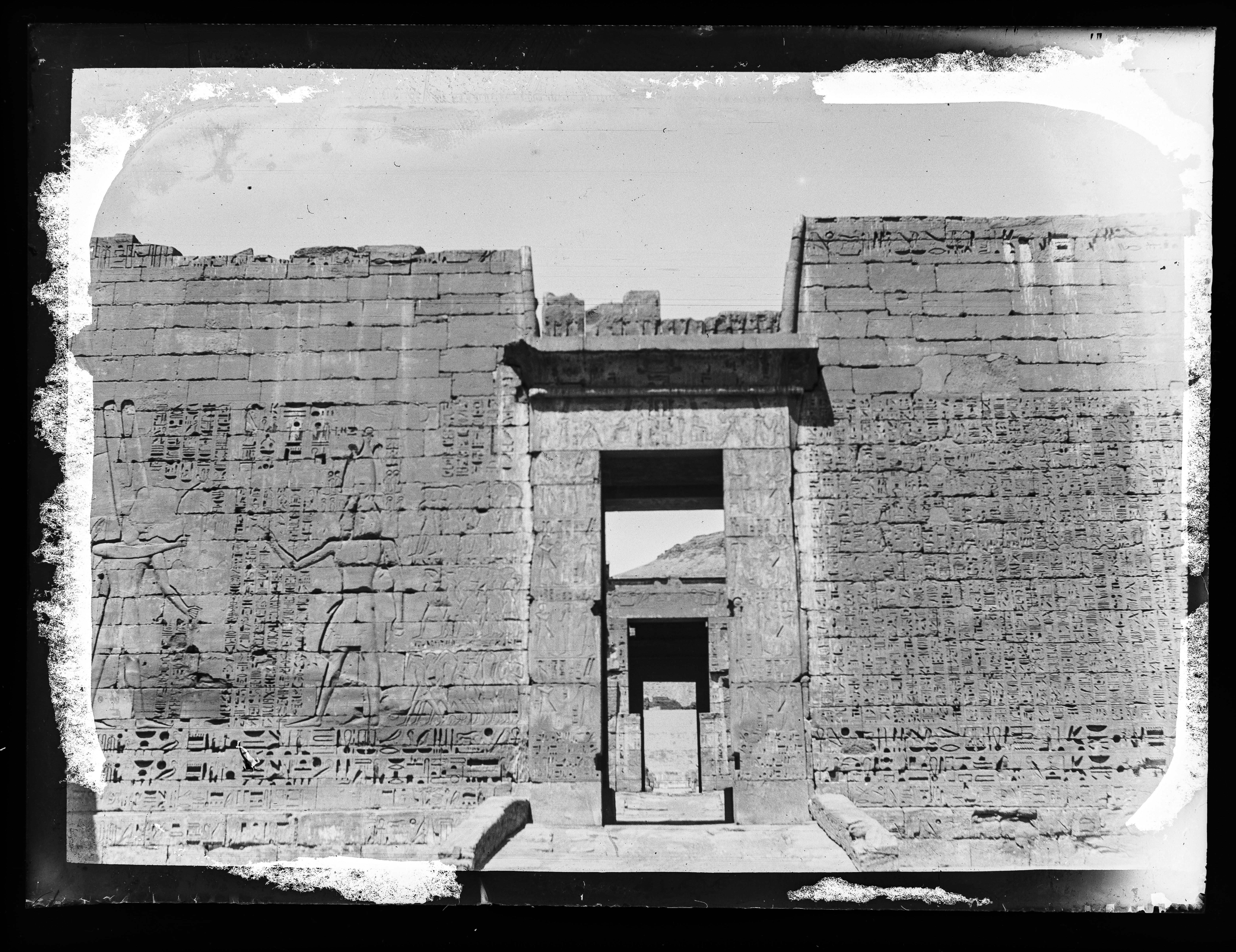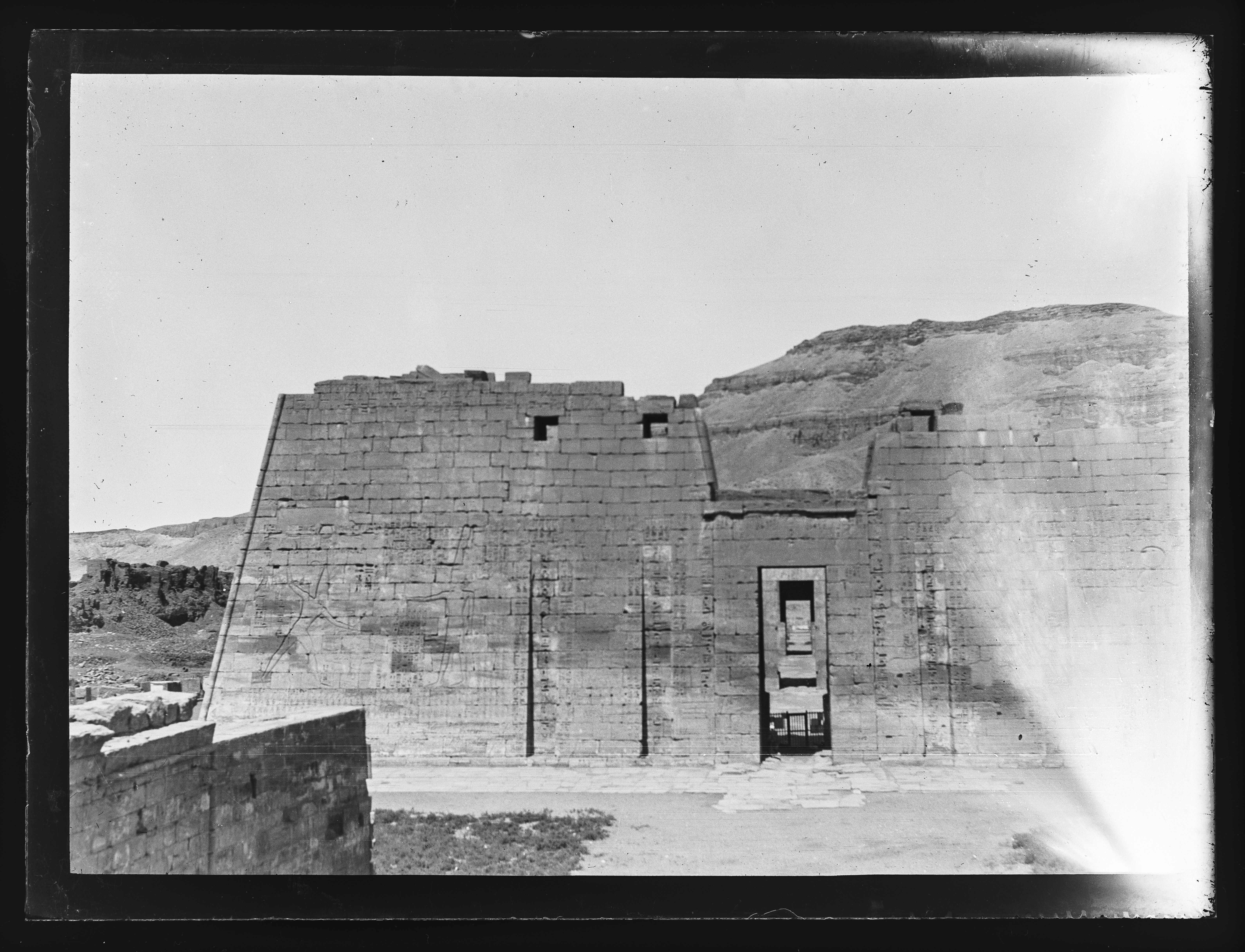 Pilone di accesso al tempio di Ramesse III a Medinet Habu. Dall'apertura si riconoscono il II pilone e gli ambienti più interni.