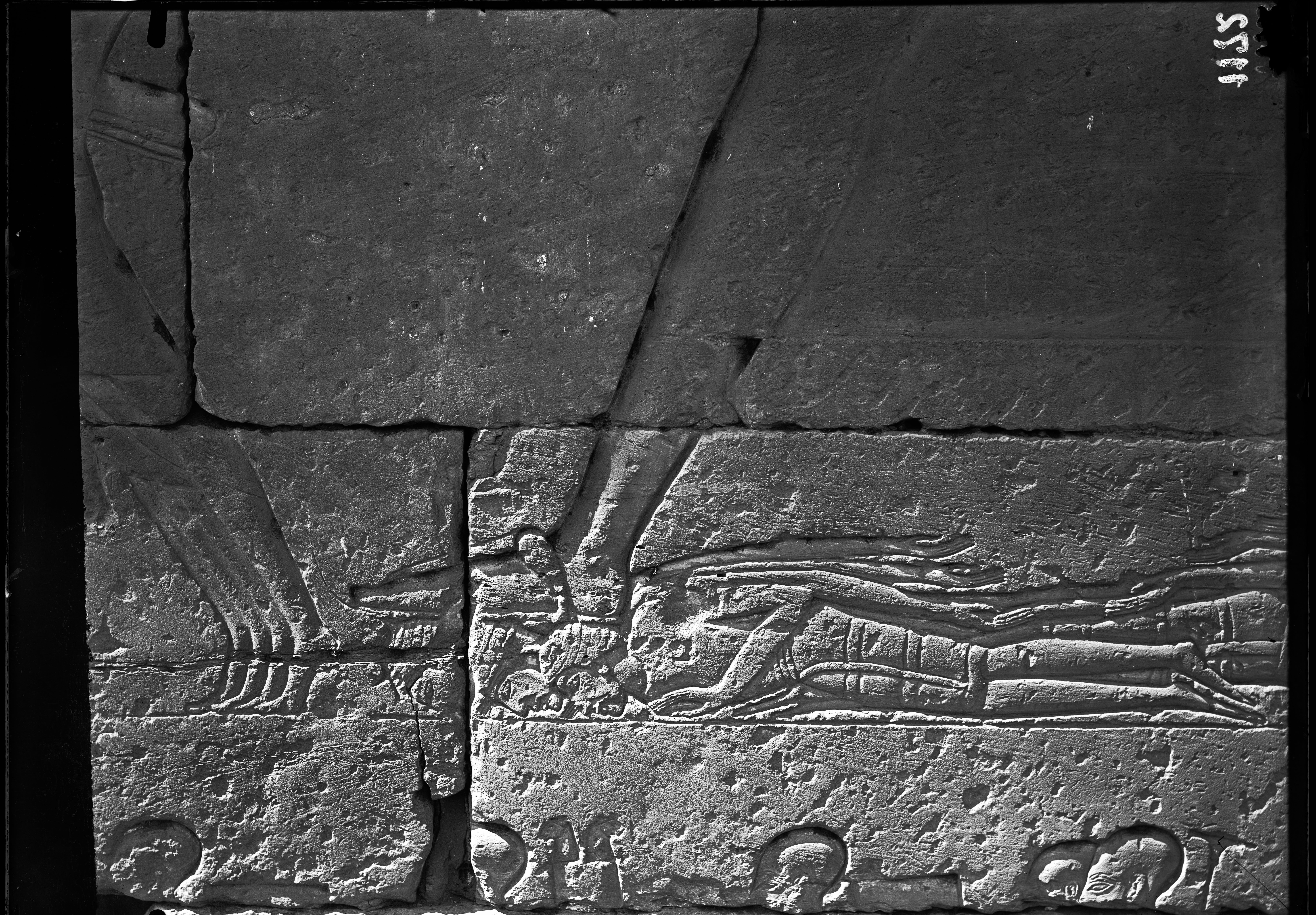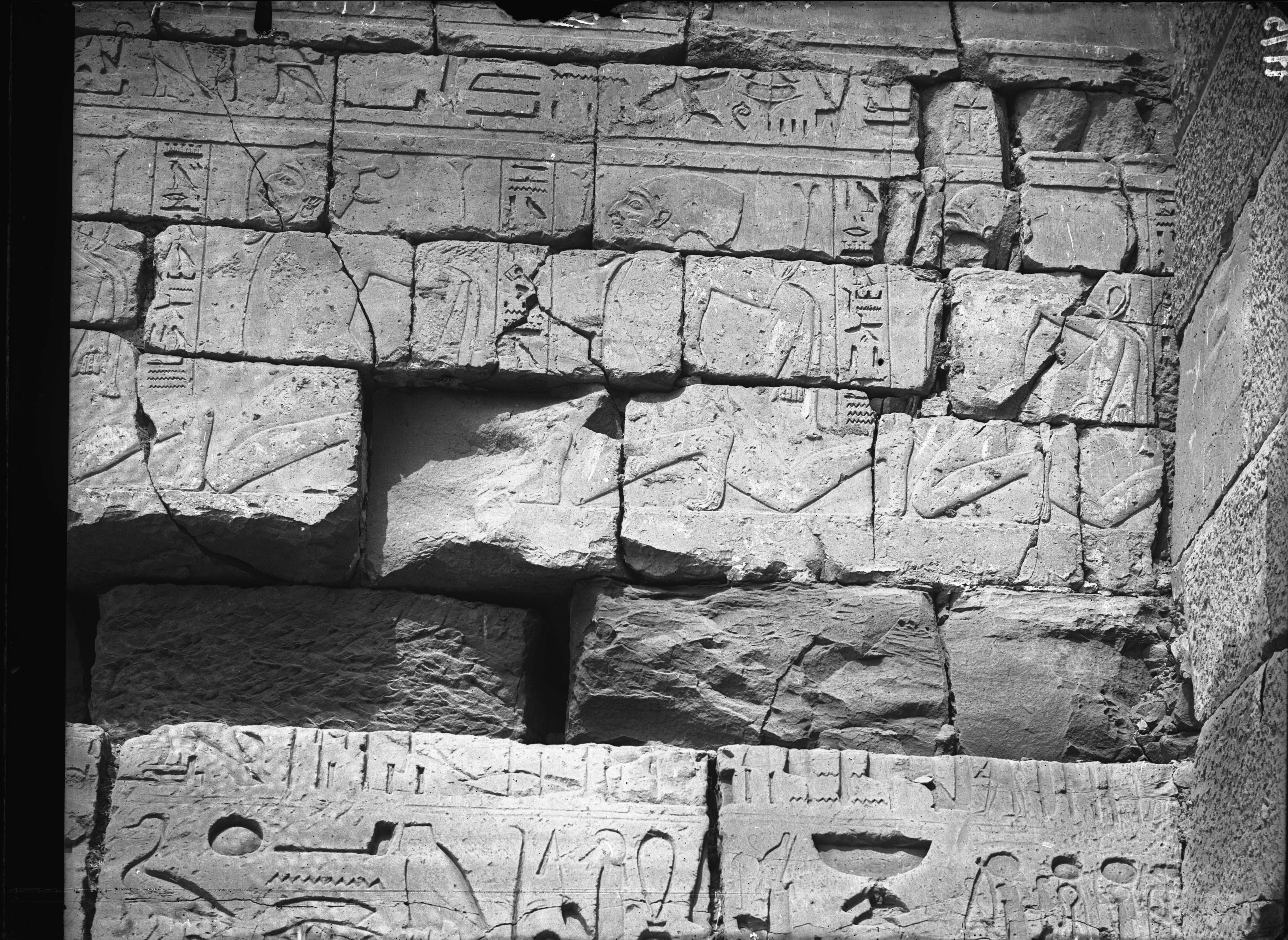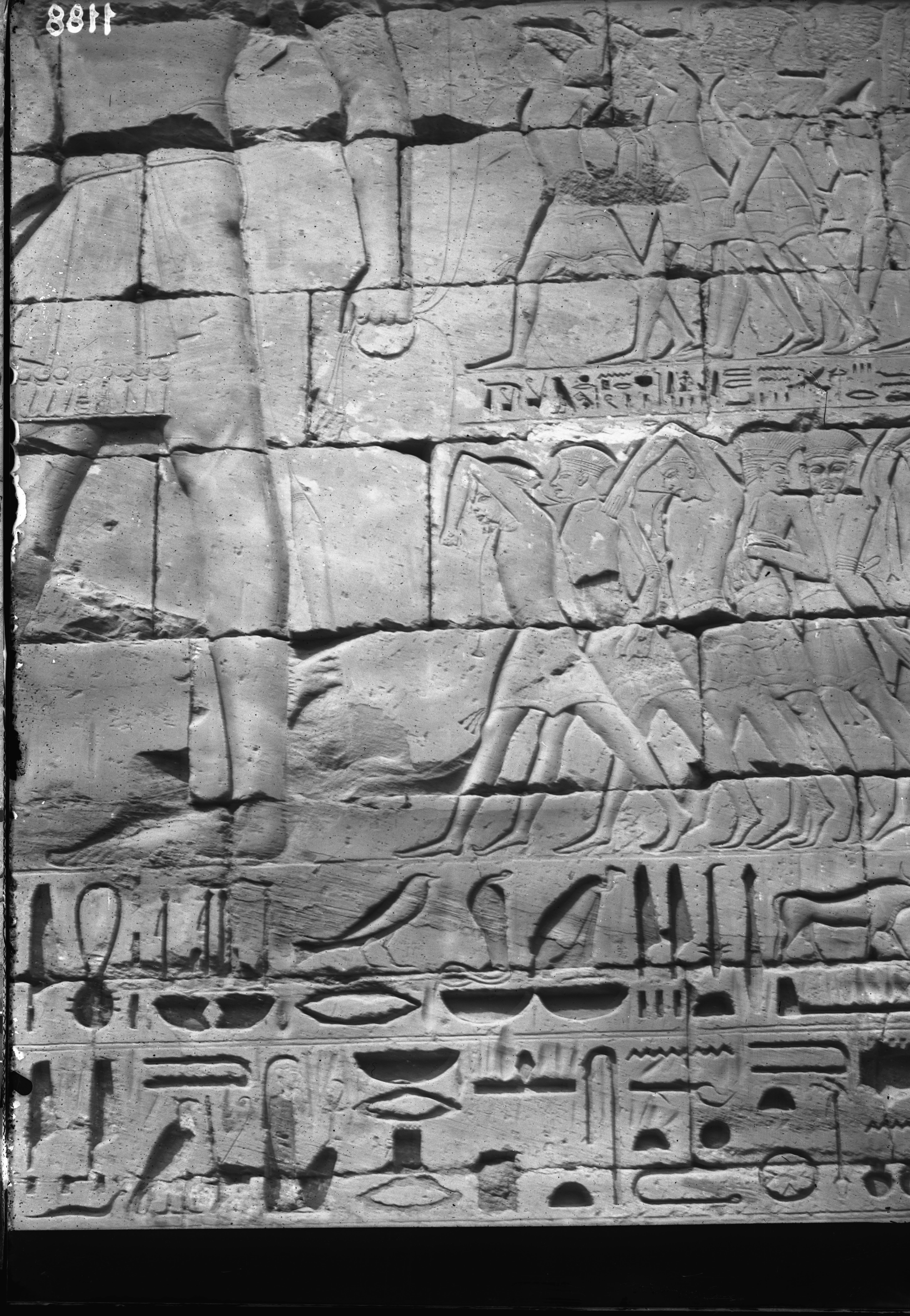Torre sud del portale d’ingresso fortificato (“migdol”), lato est, registro inferiore, del tempio di Ramesse III. Prigionieri delle terre meridionali in ginocchio.