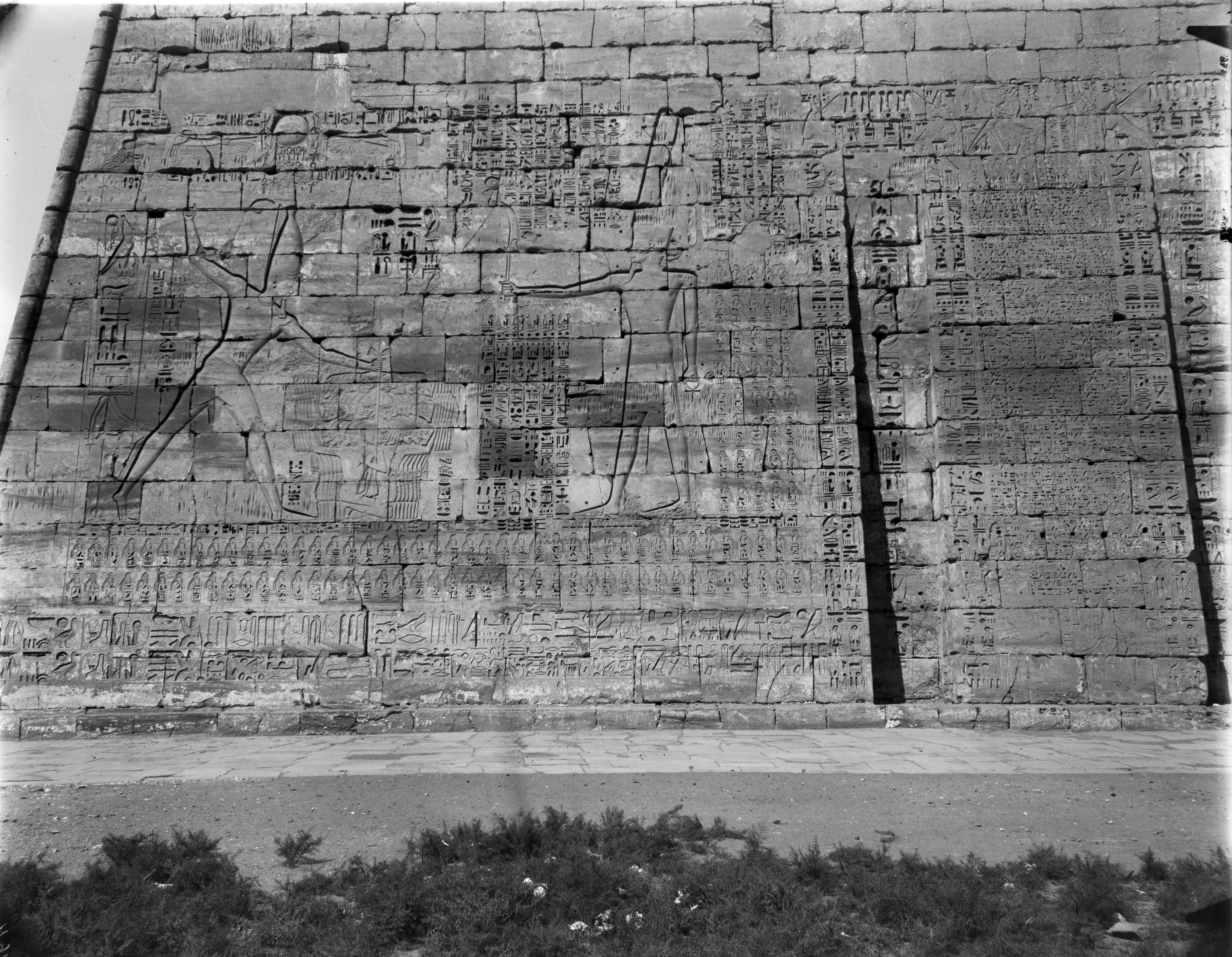 Veduta della facciata esterna, lato sud, del I pilone del tempio di Ramesse III.