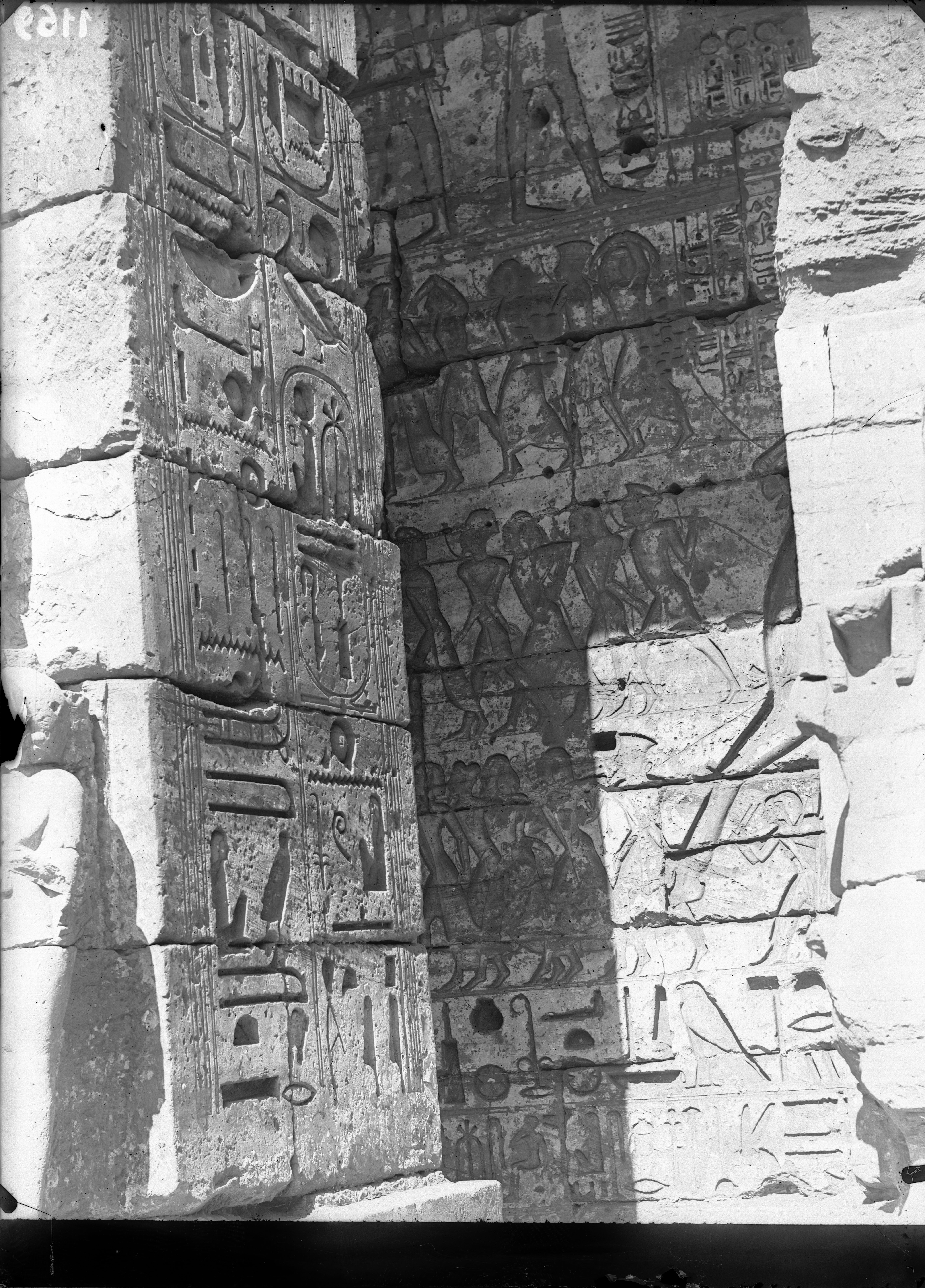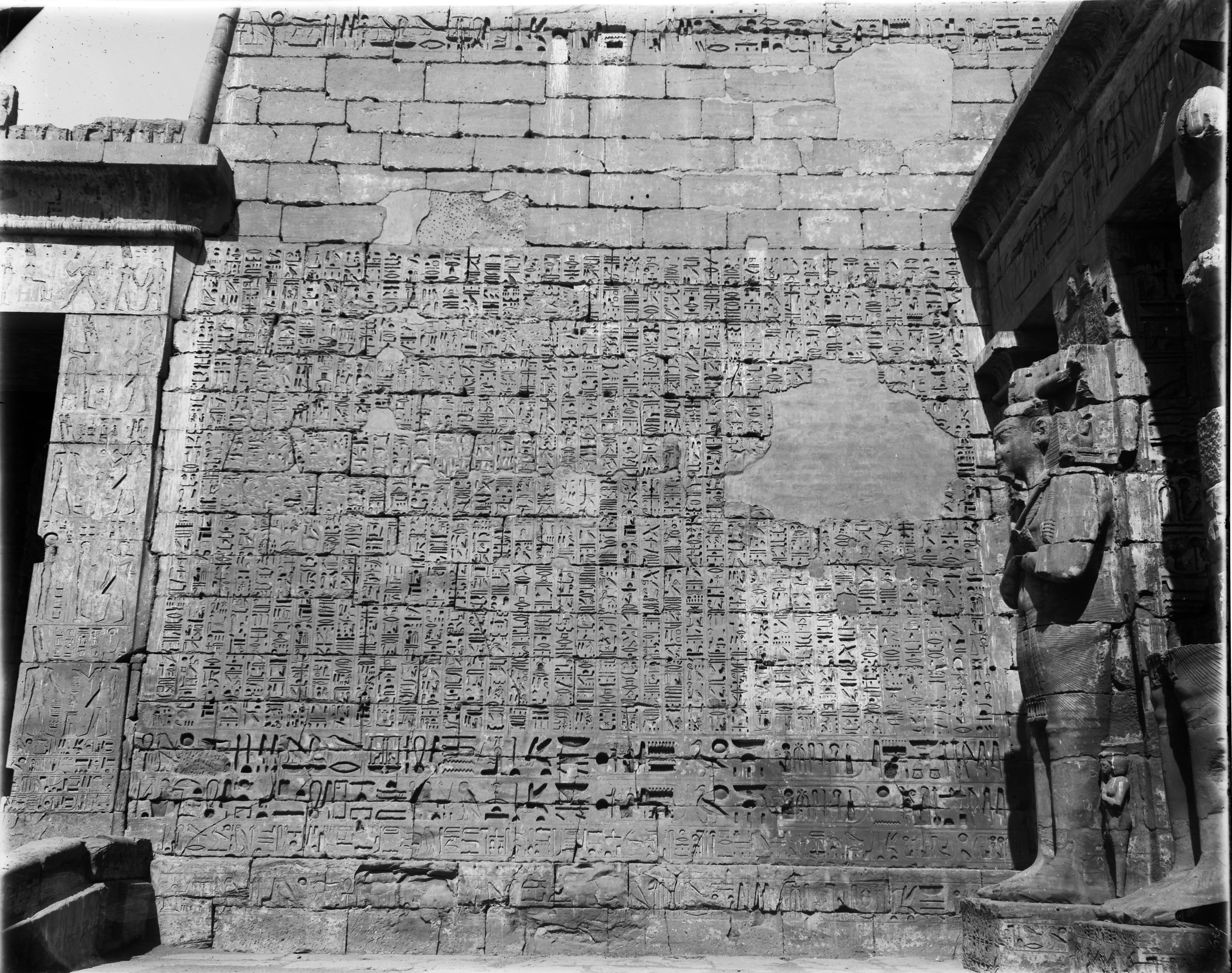 Veduta della facciata est, lato nord, del II pilone del tempio di Ramesse III.