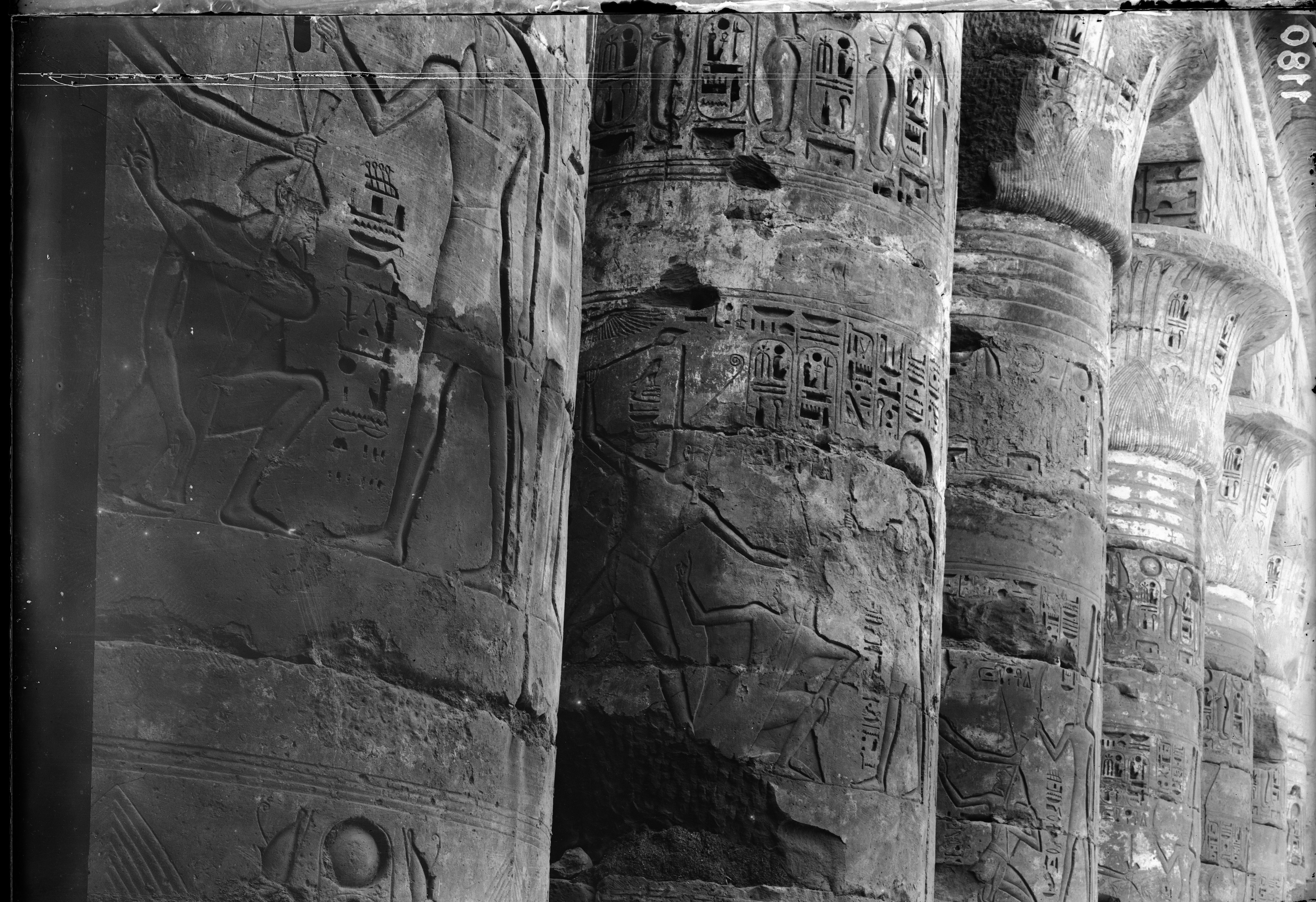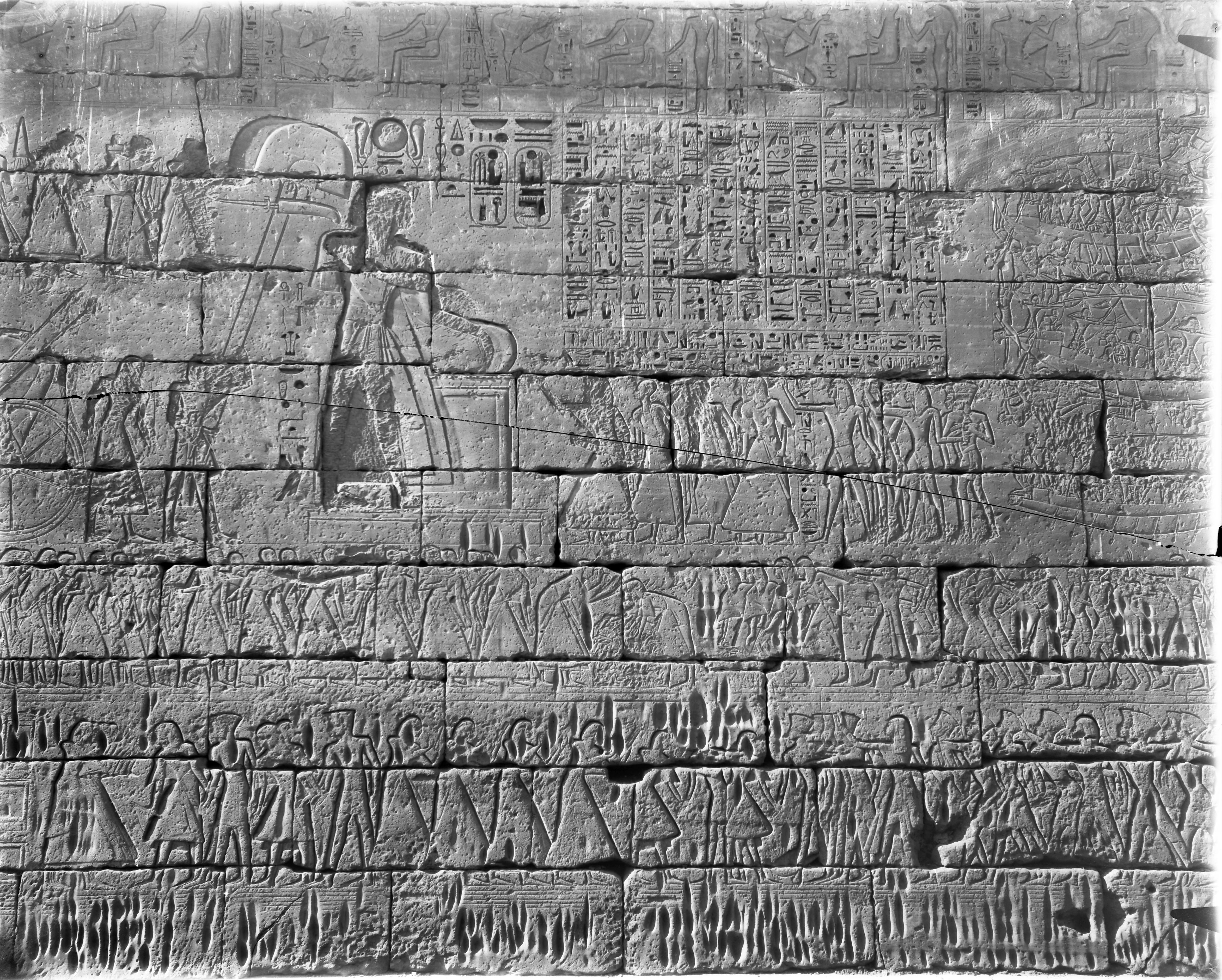 Veduta della parete sud della prima corte, del tempio di Ramesse III, facciata della finestra delle apparizioni. Ramesse III. Il re è rappresentato mentre giustizia alcuni prigionieri.