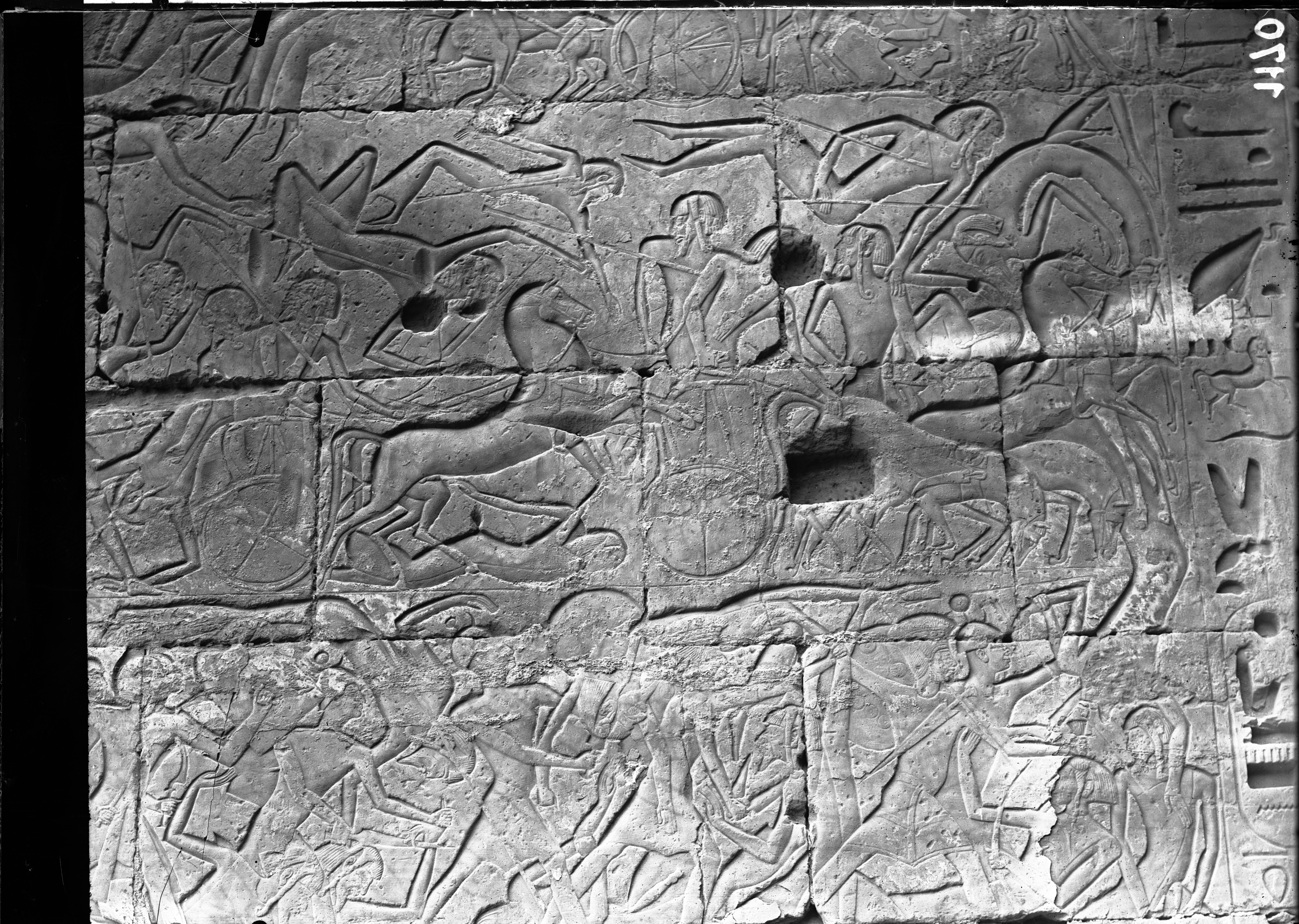 Scena di battaglia tra Ramesse III e i Popoli del Mare sulla facciata esterna del muro nord del tempio di Ramesse III.