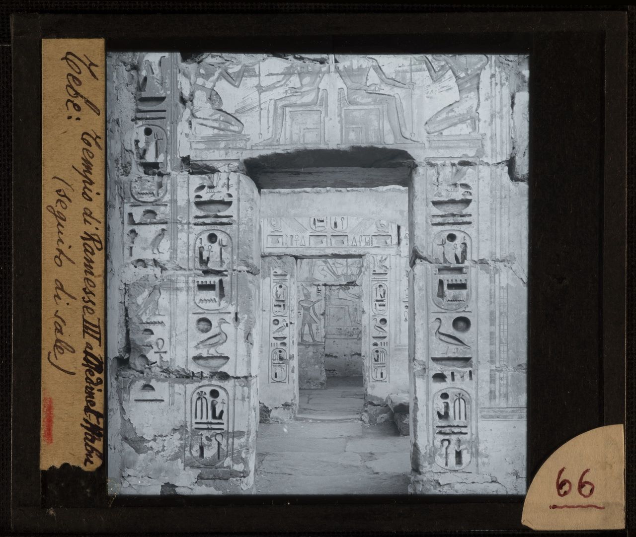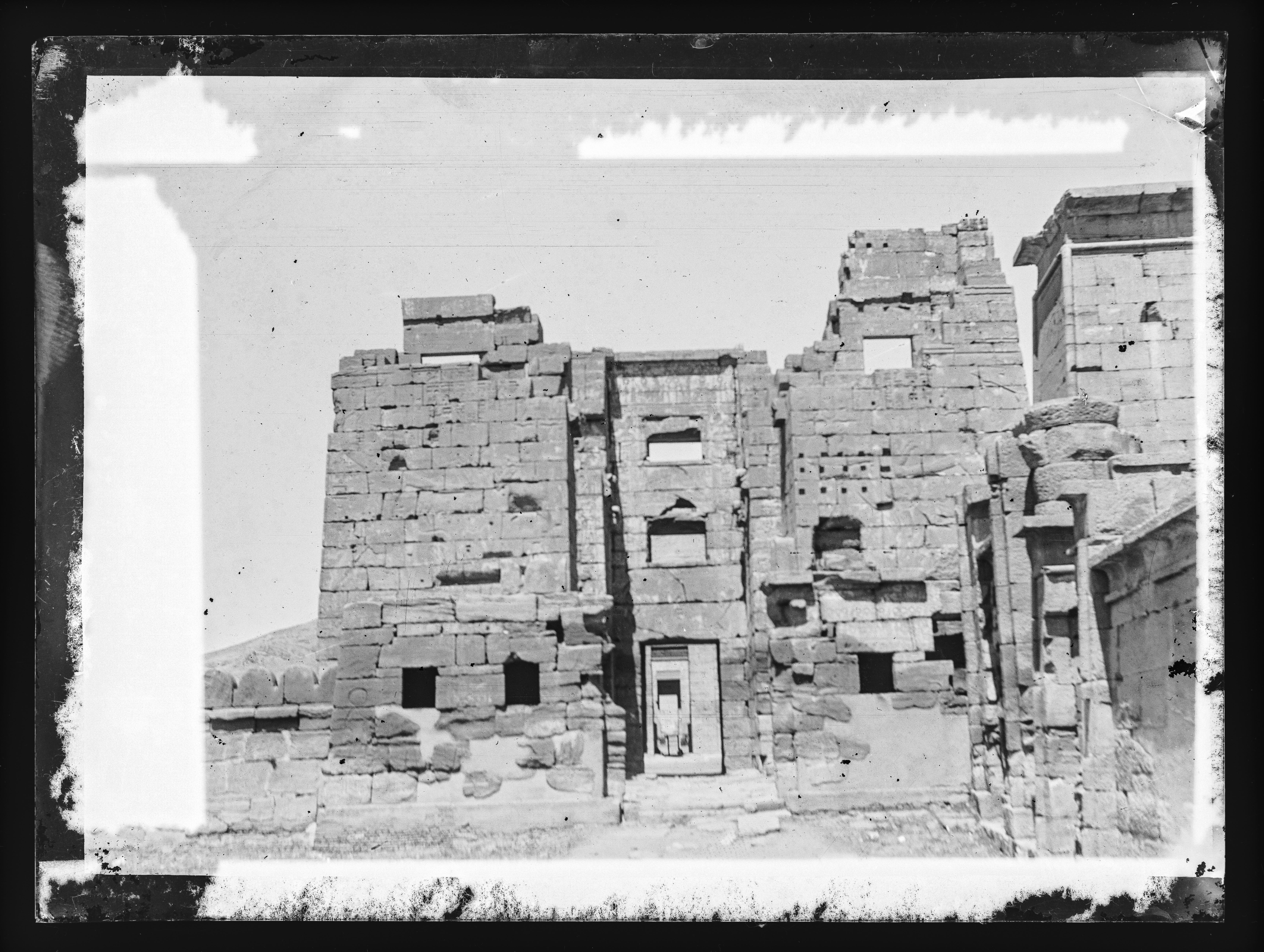Accesso al tempio funerario di Ramesse III a Medinat Habu: il portale presenta le caratteristiche architettoniche del migdol, una fortezza siriana. Fotografia ottocentesca.