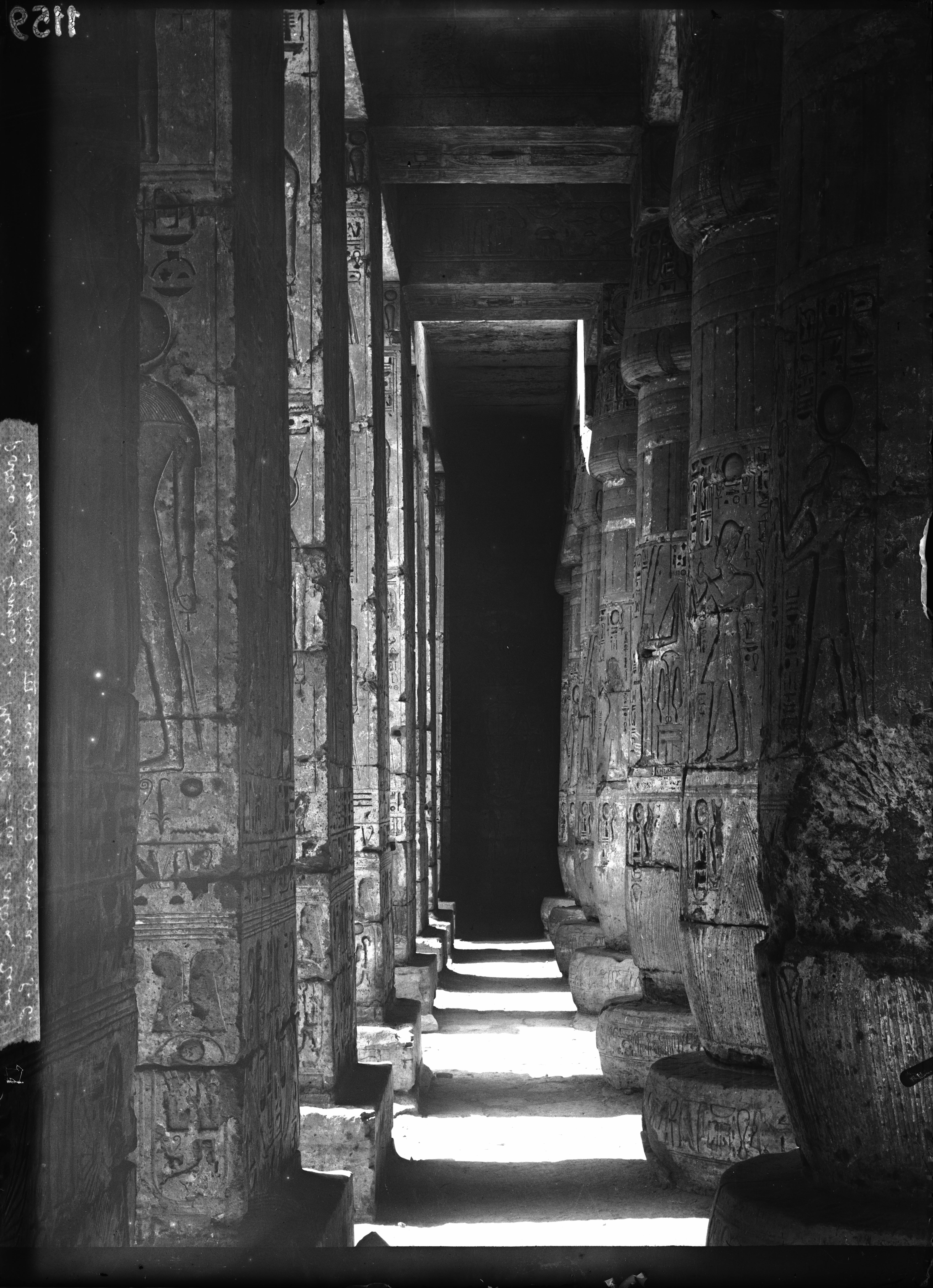Veduta del colonnato, lato sud, parete ovest, nella prima corte del tempio di Ramesse III.