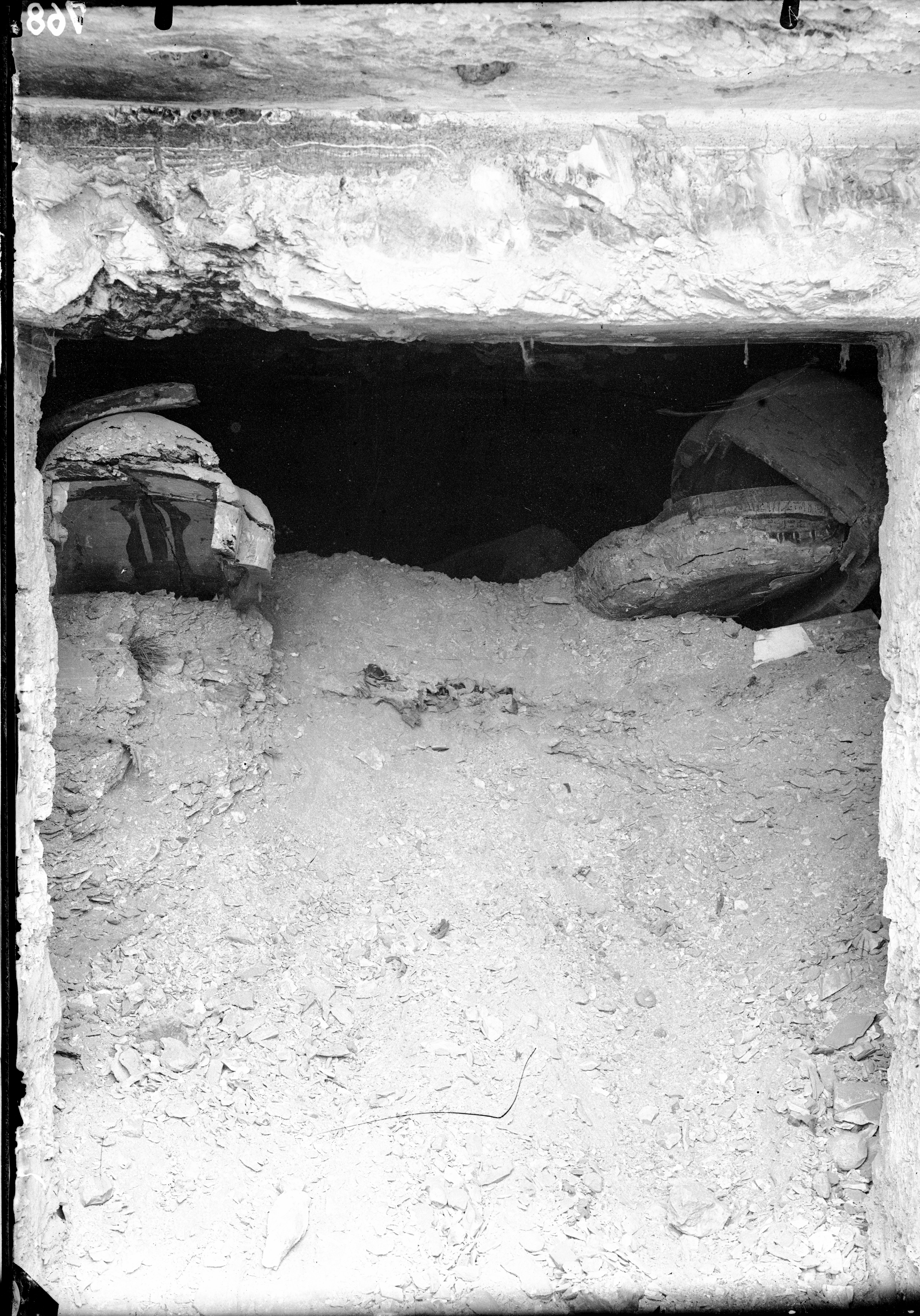 L’ingresso alla tomba del principe Sethherkhepeshef (QV43) al momento del rinvenimento, con il consistente deposito di schegge di calcare e sabbia progressivamente trasportato all’interno del passaggio da ripetuti episodi alluvionali. Sulla superficie superiore sono ben visibili resti di sarcofagi che potrebbero essere giunti anch’essi insieme ai depositi alluvionali, oppure (più probabilmente) derivare dal riutilizzo di questa tomba in epoche successive. Scavi Schiaparelli.