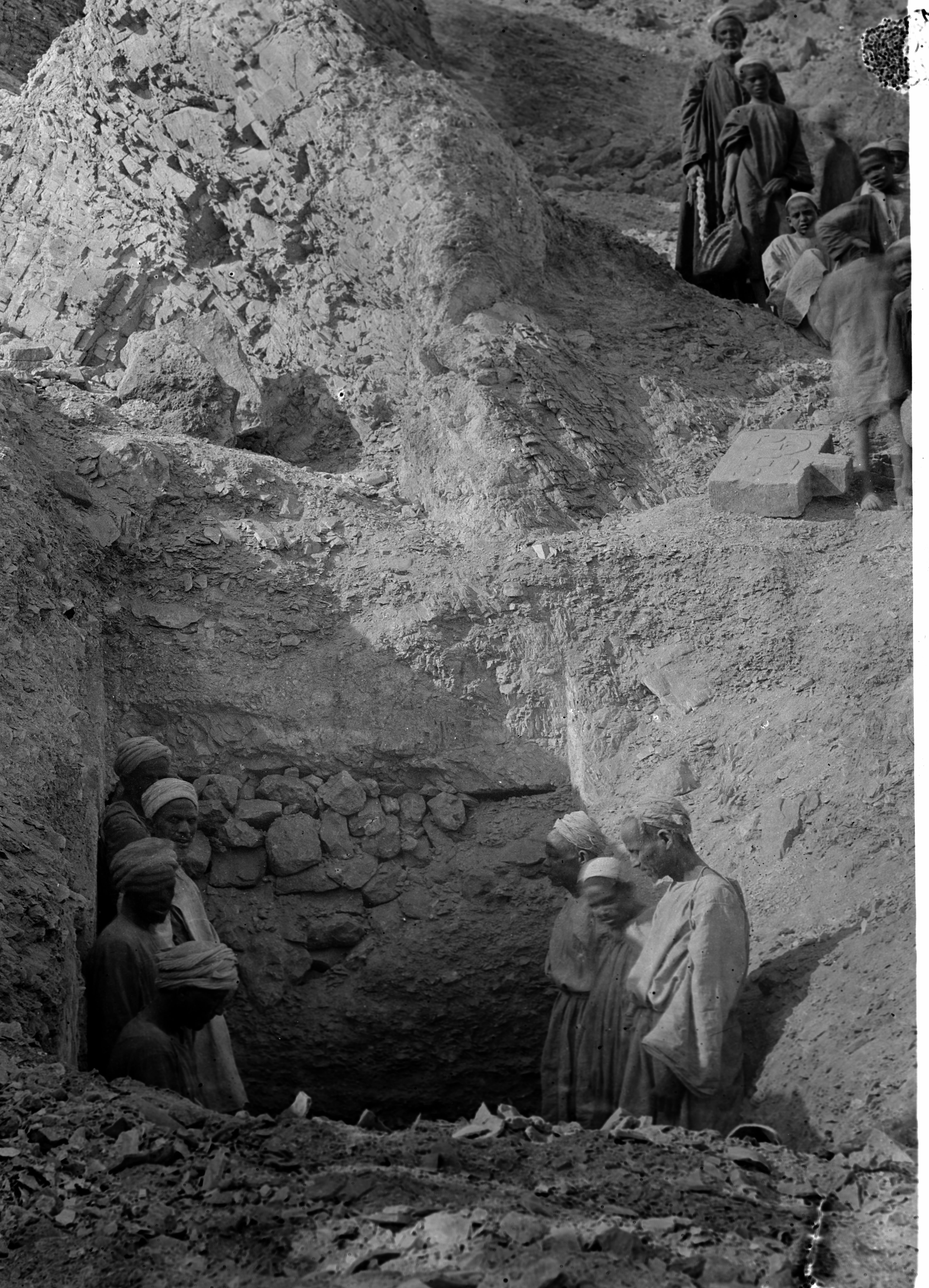 Momento di scavo per accedere alla tomba del principe Sethherkhepeshef (QV43). Scavi Schiaparelli. (Didascalia originaria: Scoperta della tomba del principe Setirchopeshfu).