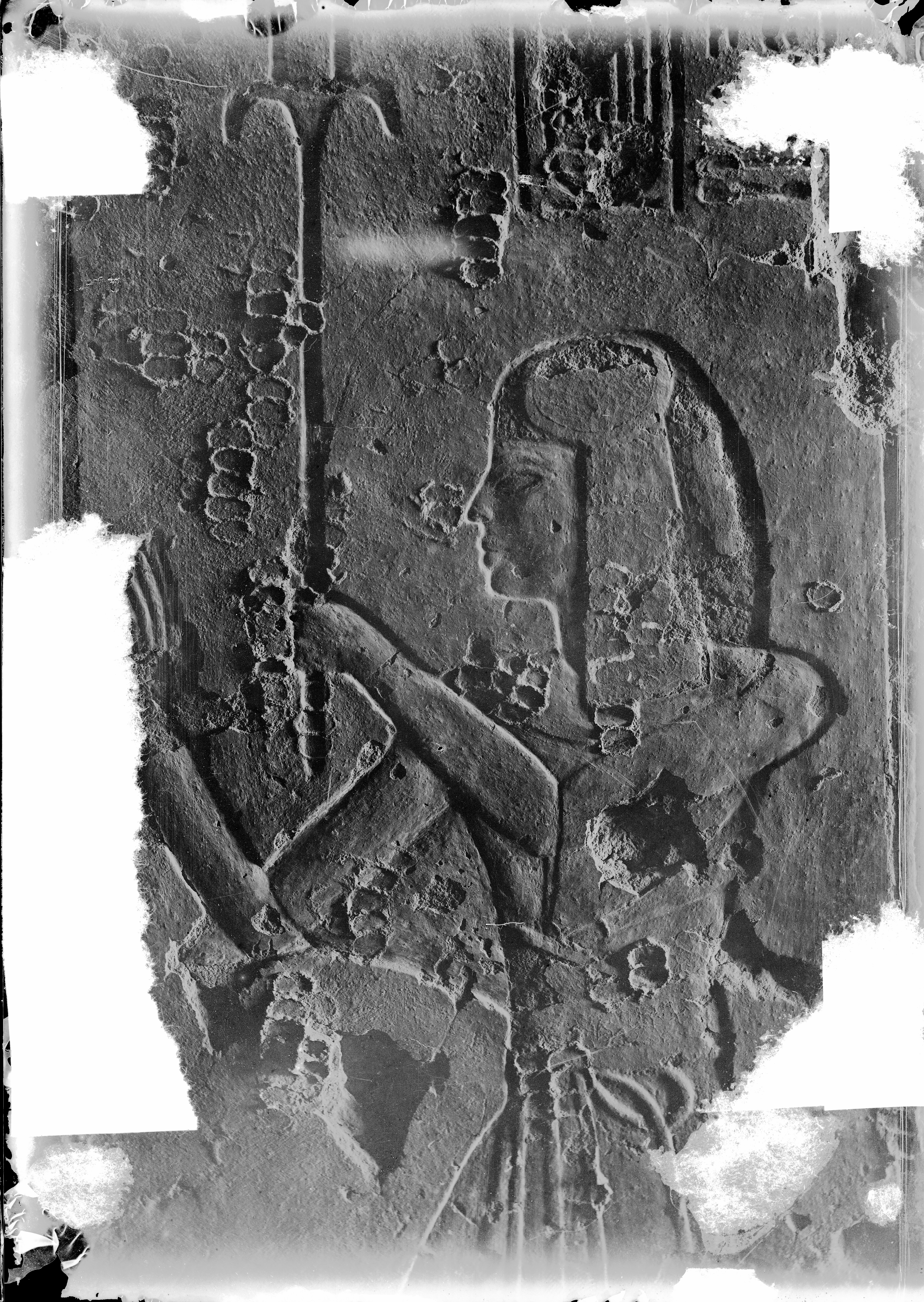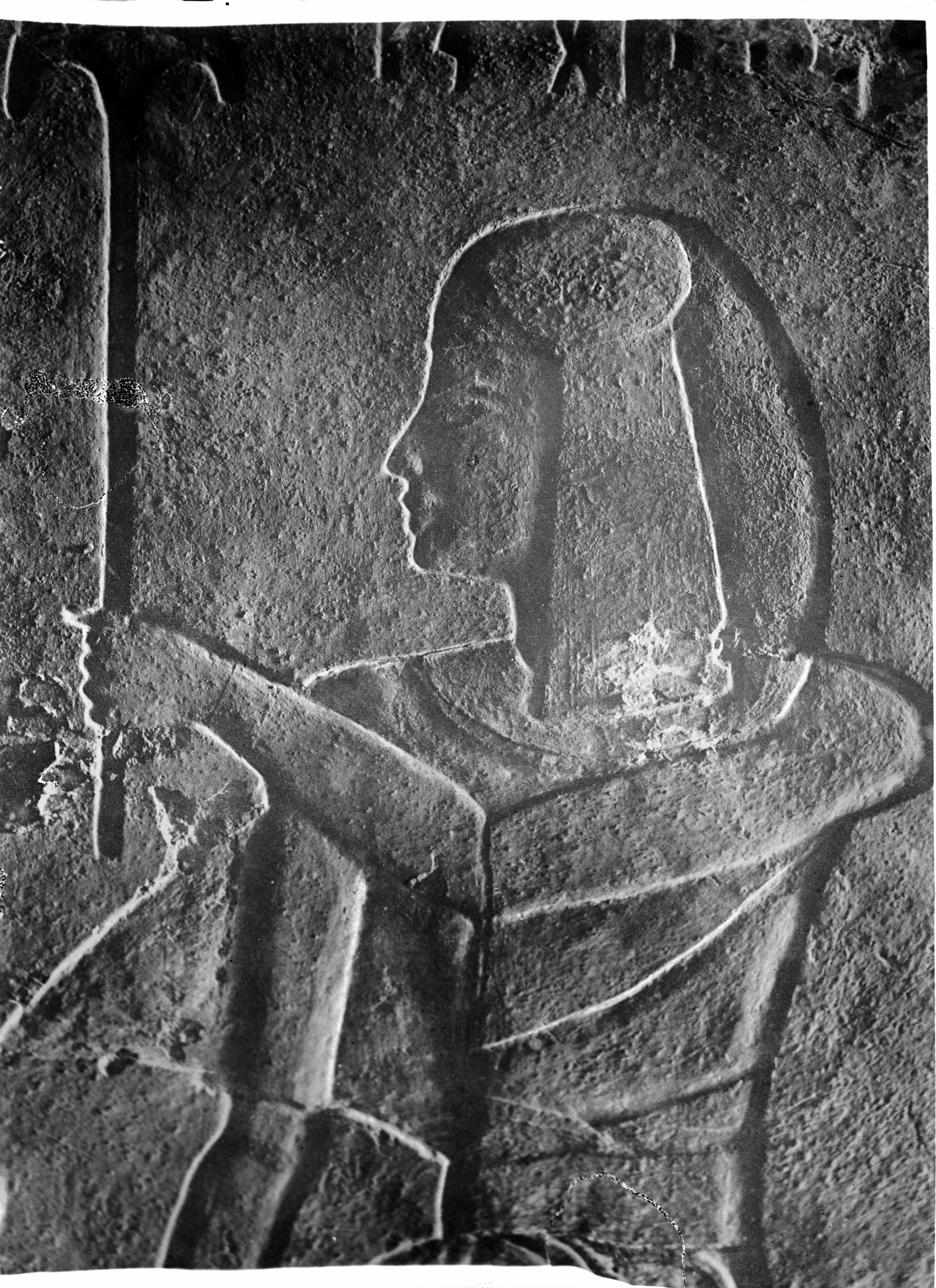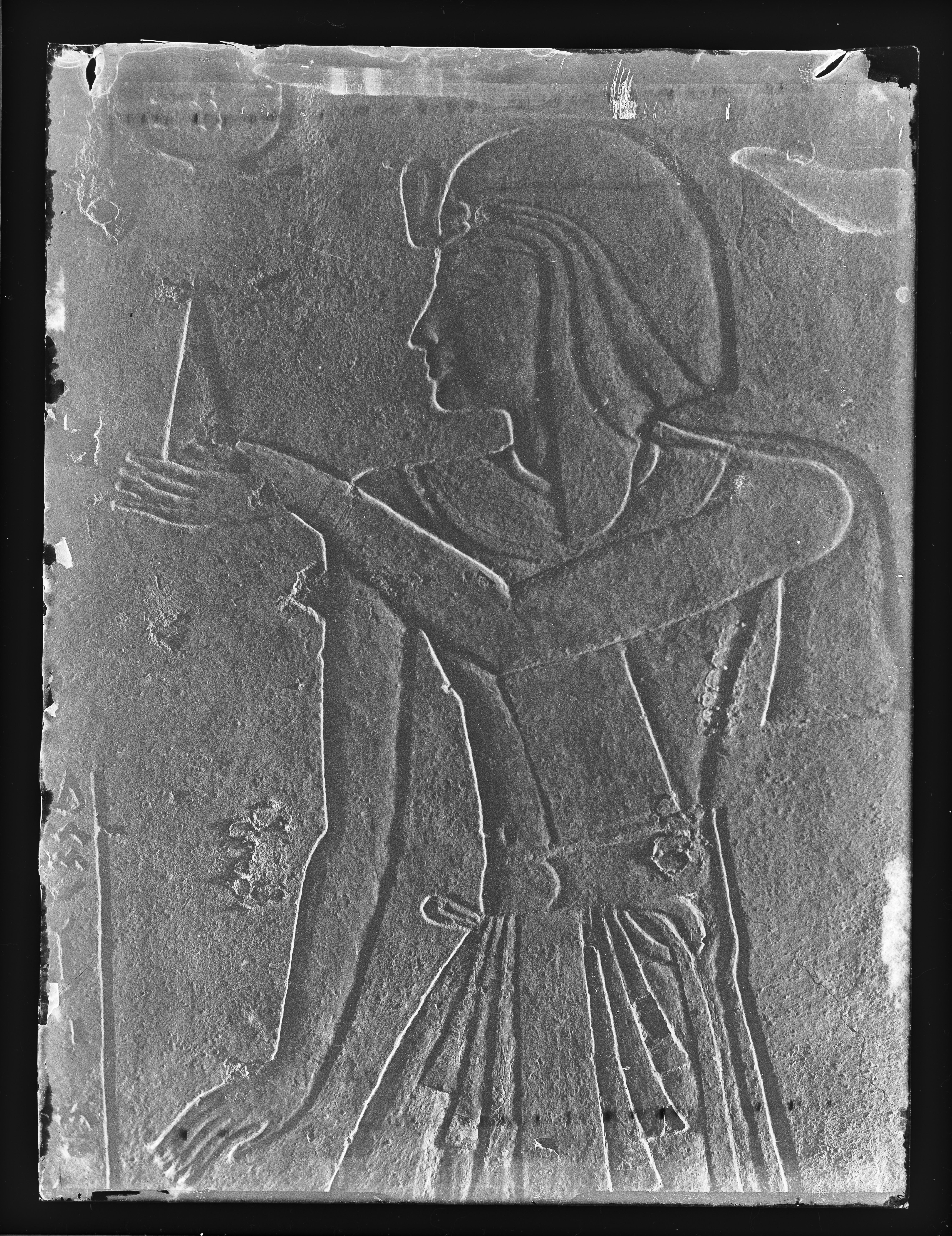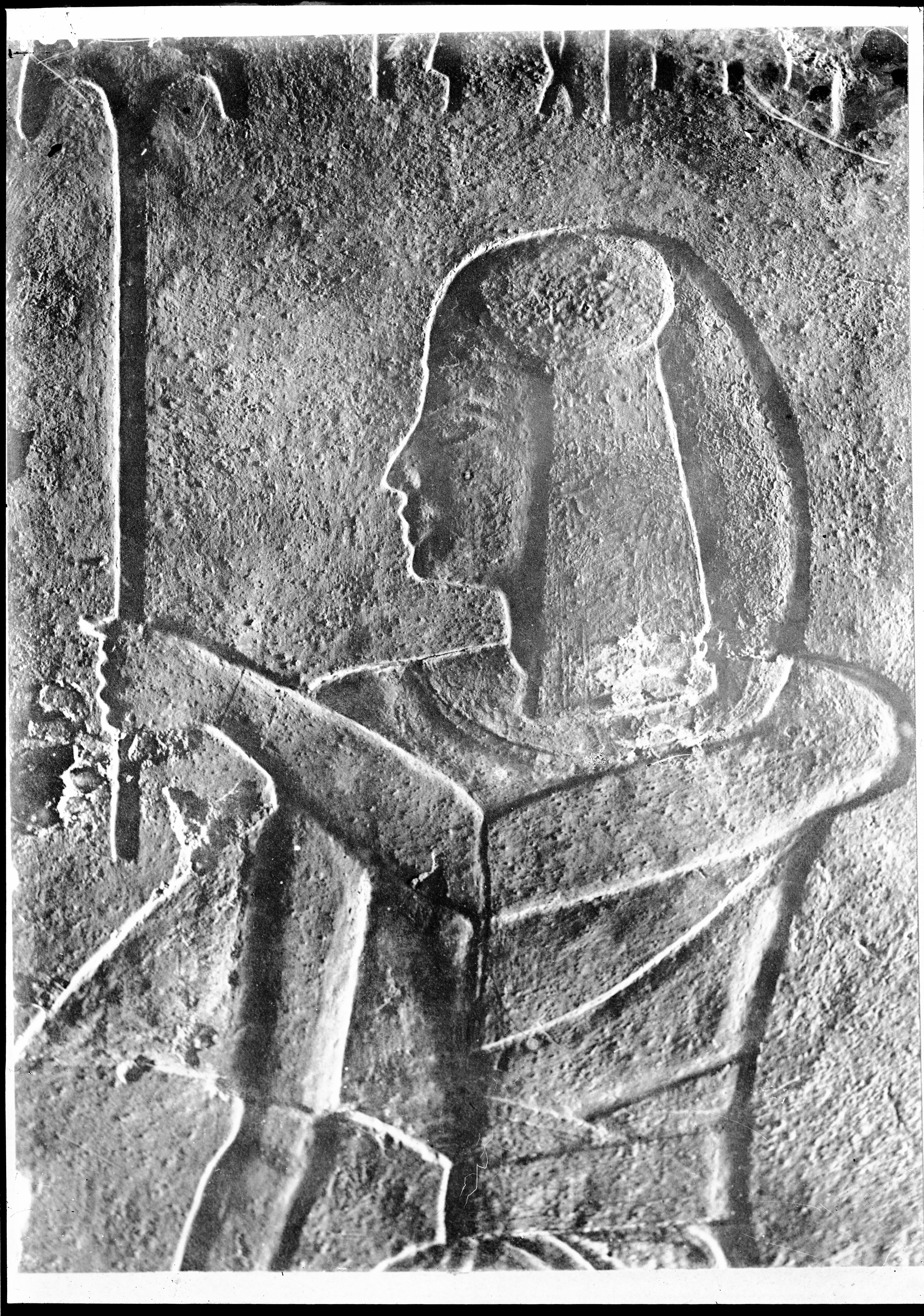 Rappresentazione del principe Sethherkhepeshef posta sulla parete ovest del primo corridoio, all’interno della sua tomba (QV43). Il principe tiene in mano un grande ventaglio di piume, non visibili in questa fotografia. Scavi Schiaparelli.