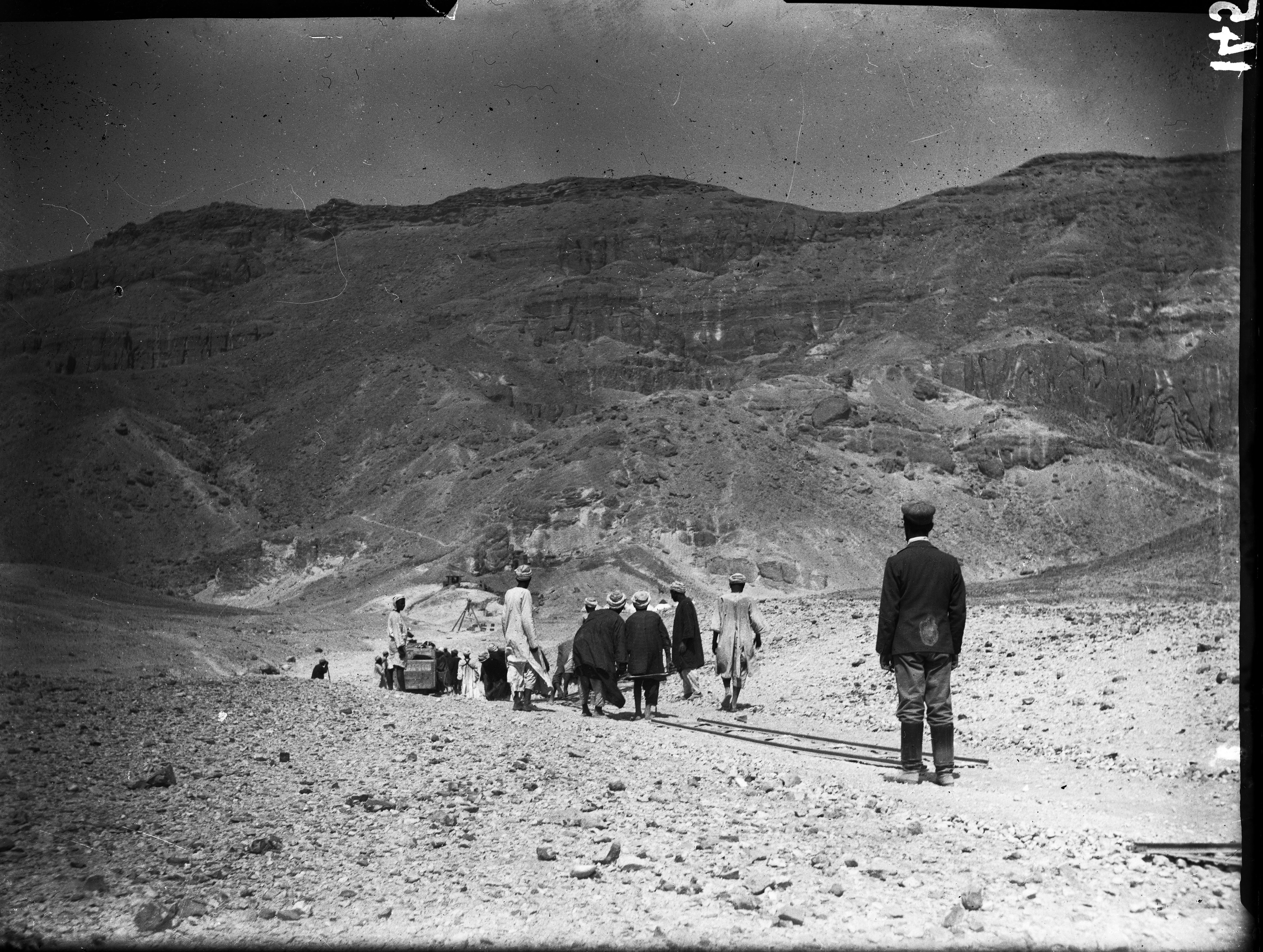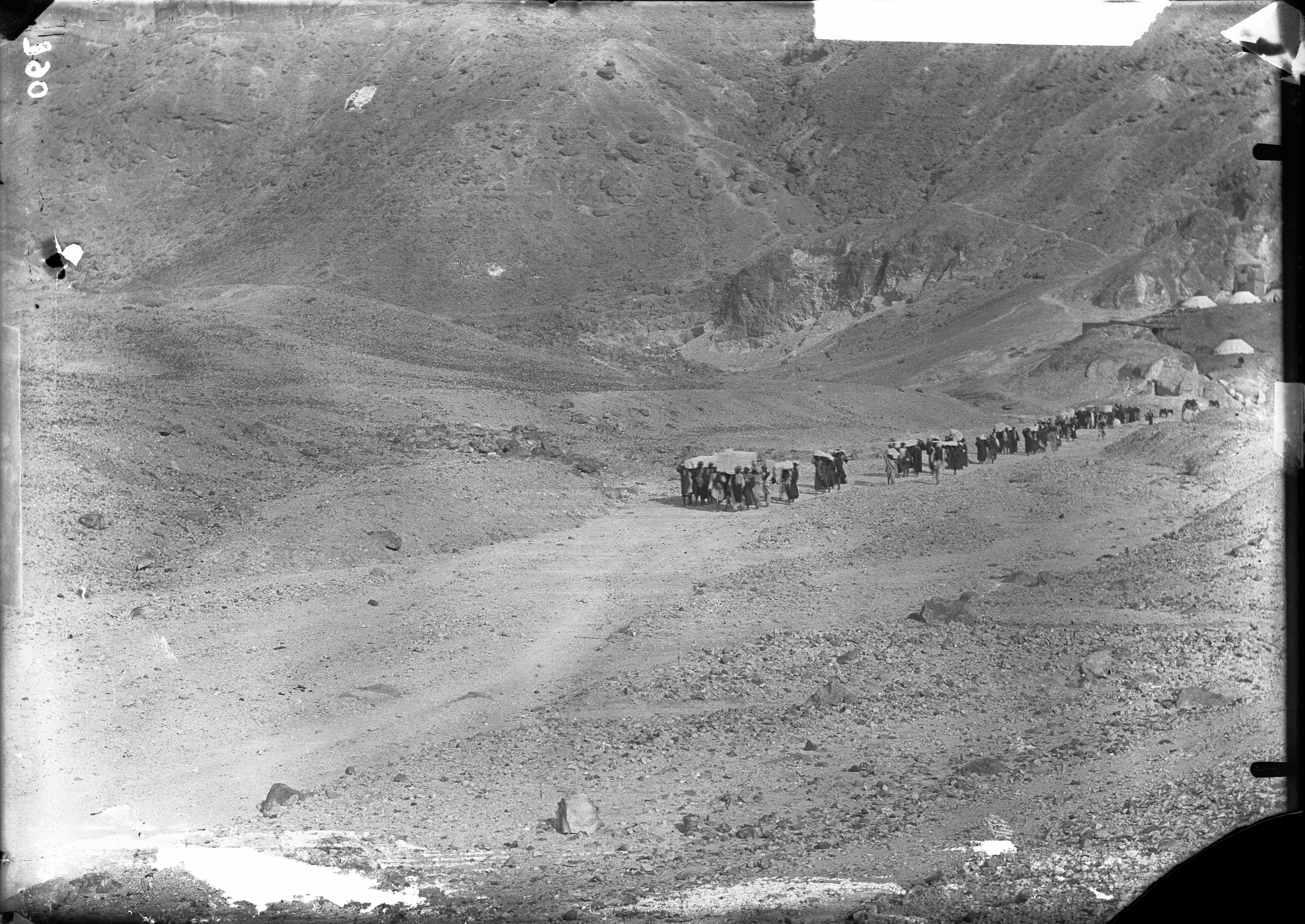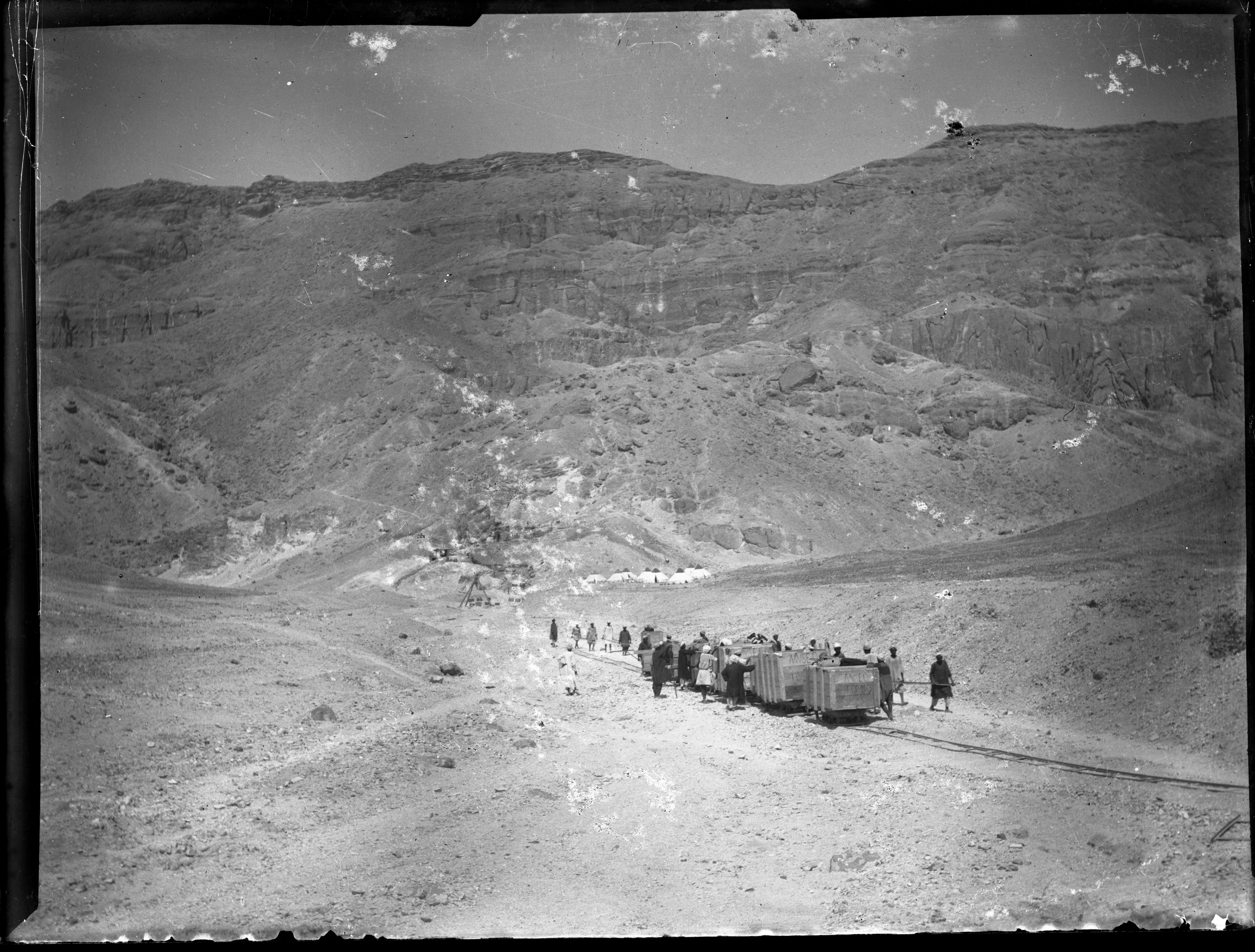 Trasporto di casse dall’accampamento della Valle delle Regine, sullo sfondo, al Nilo, durante le fasi di chiusura dello scavo. Da notare, sulla destra, una macchina fotografica coperta da un telo. Scavi Schiaparelli.