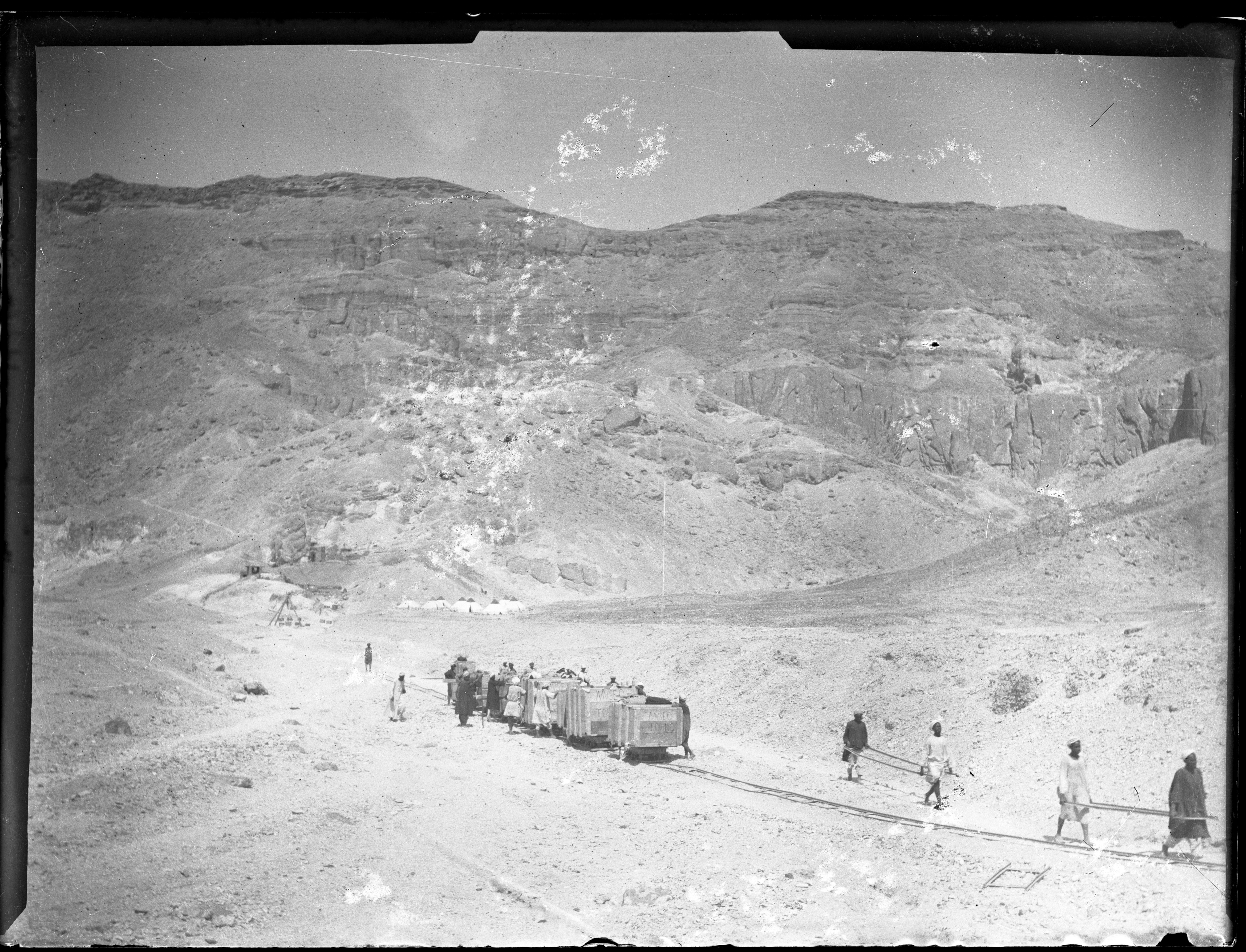 Trasporto di casse, contenenti antichità, attraverso rotaie per decauville grazie alla manodopera di operai egiziani, nella Valle delle Regine, presumibilmente nel 1906, quando la missione, pur scavando a Deir el-Medina, aveva ancora il campo base nella Valle, quell’anno con ben nove tende. Scavi Schiaparelli.