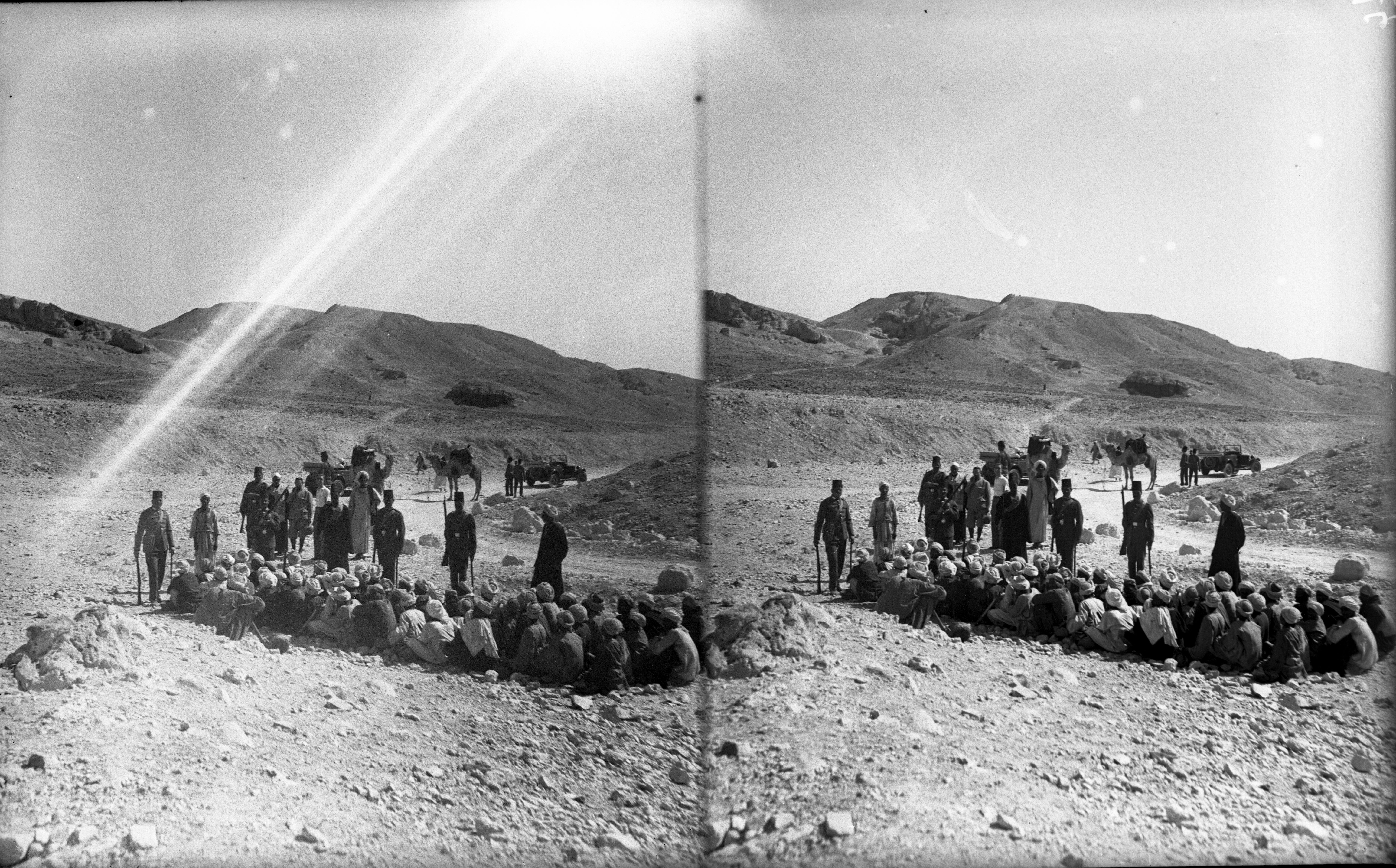 Fotografia scattata nella Valle delle Regine, durante gli scavi del 1903. Al centro, Francesco Ballerini, mentre alla sua destra, con il fucile, il dragomanno Bolos Ghattas. Sullo sfondo a destra sono riconoscibili i resti del convento copto di Deir Rumi. Archivio Angelo Sesana.