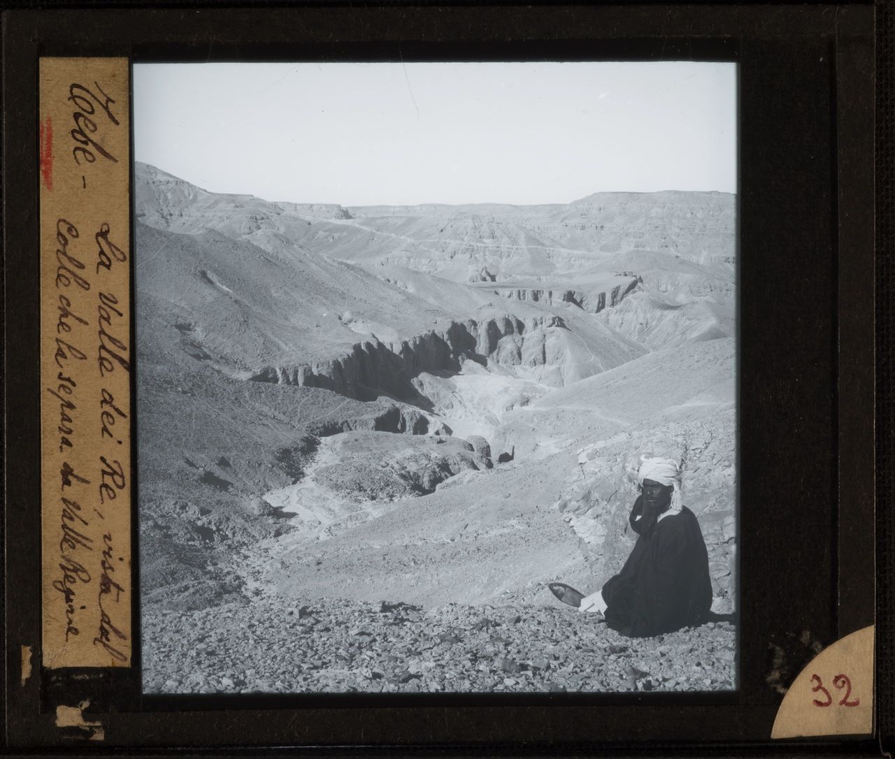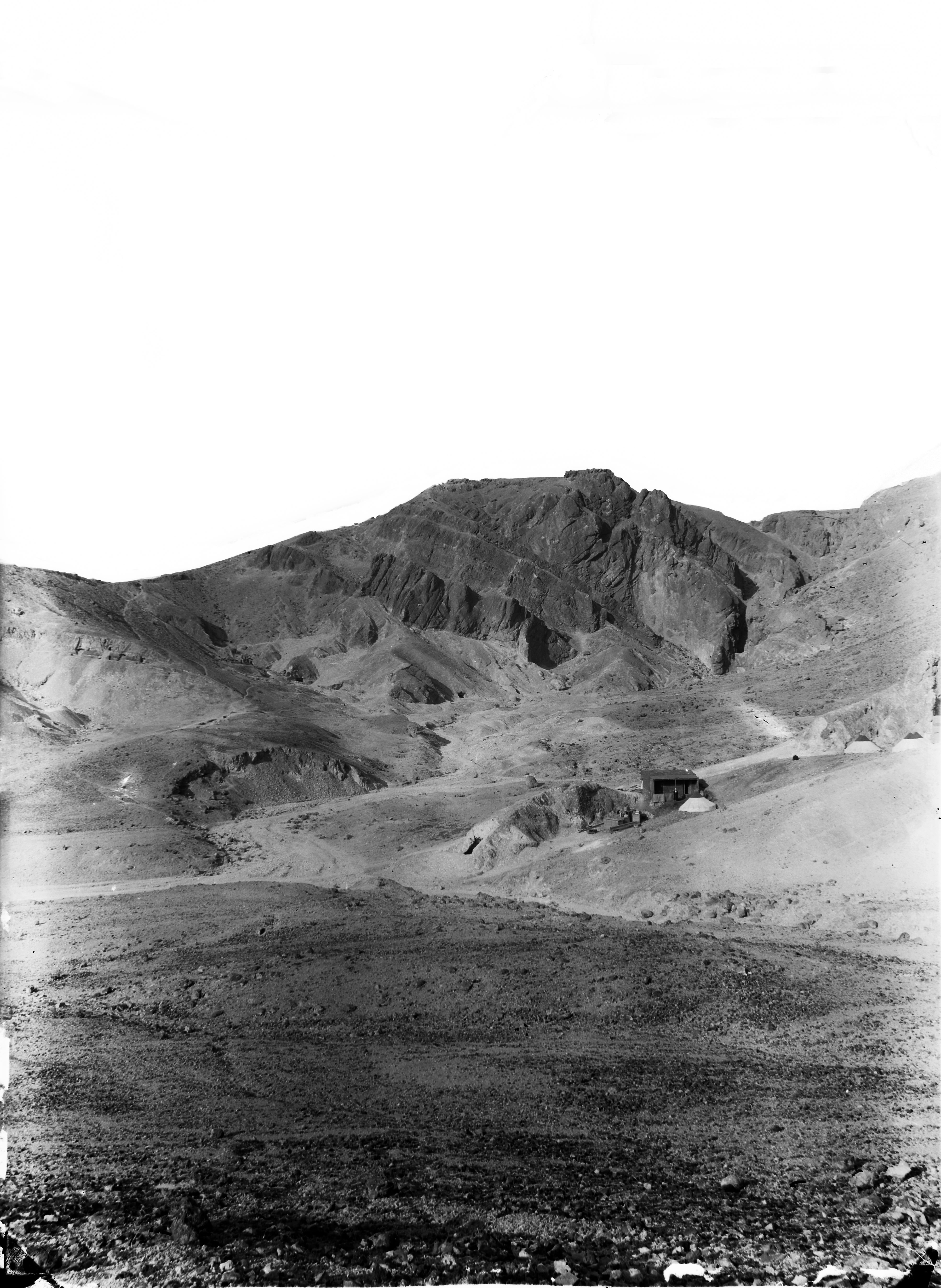 Veduta generale della Valle delle Regine. Sulla destra è possibile osservare l’accampamento della missione, con la presenza di una casupola in mattoni (oltre che aduna seconda struttura sempre in mattoni), tre tende coniche e una tenda grande bianca, presumibilmente quella citata in alcuni documenti del 1904. Scavi Schiaparelli