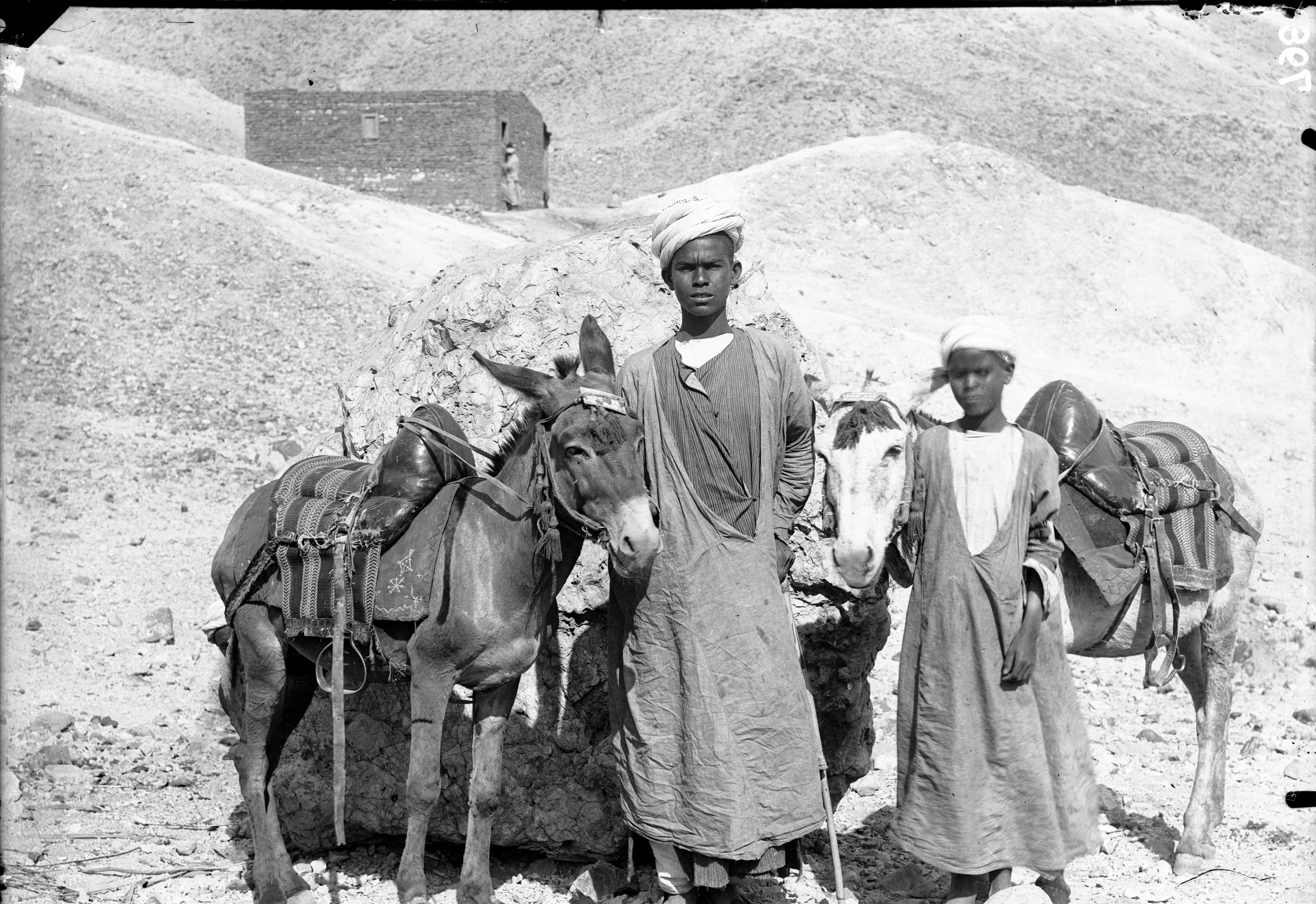 Primo piano di due giovani membri della missione italiana, insieme a due muli. Sullo sfondo, la struttura in mattoni costruita per la missione archeologica. Scavi Schiaparelli. (Didascalia originaria: asinai del vicino villaggio di Gurnah addetti al servizio della Missione Archeologica).
