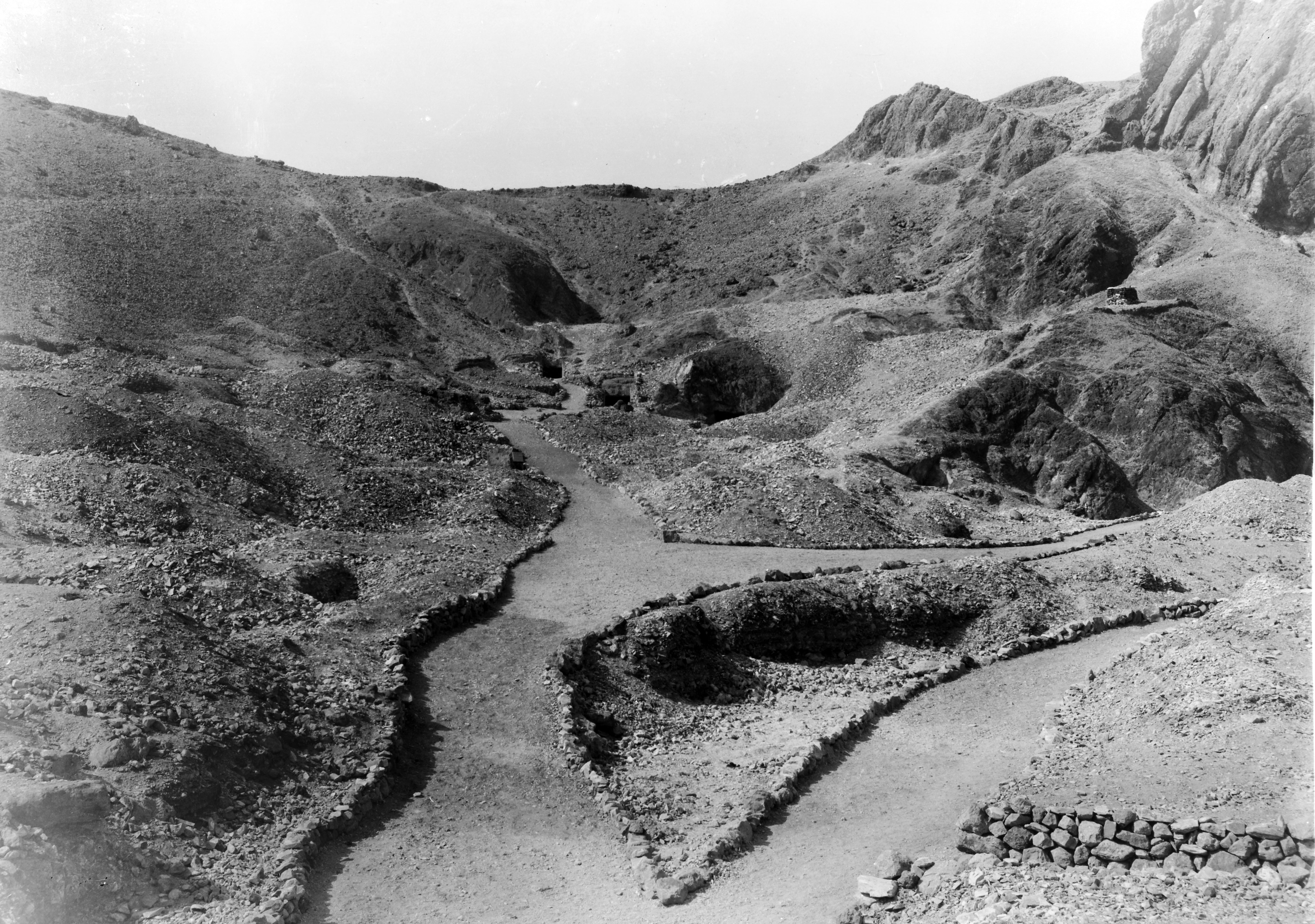 Veduta della parte finale della Valle delle Regine. Si vedono, da destra a sinistra, gli ingressi delle tombe QV44 (del principe Khaemuaset) e QV43 (del principe Sethherkhepeshef). Lungo il sentiero si intravede la targa commemorativa degli scavi italiani nella Valle, a cui segue, poco visibile, il pozzo della QV47, della principessa Ahmose. Scavi Schiaparelli.