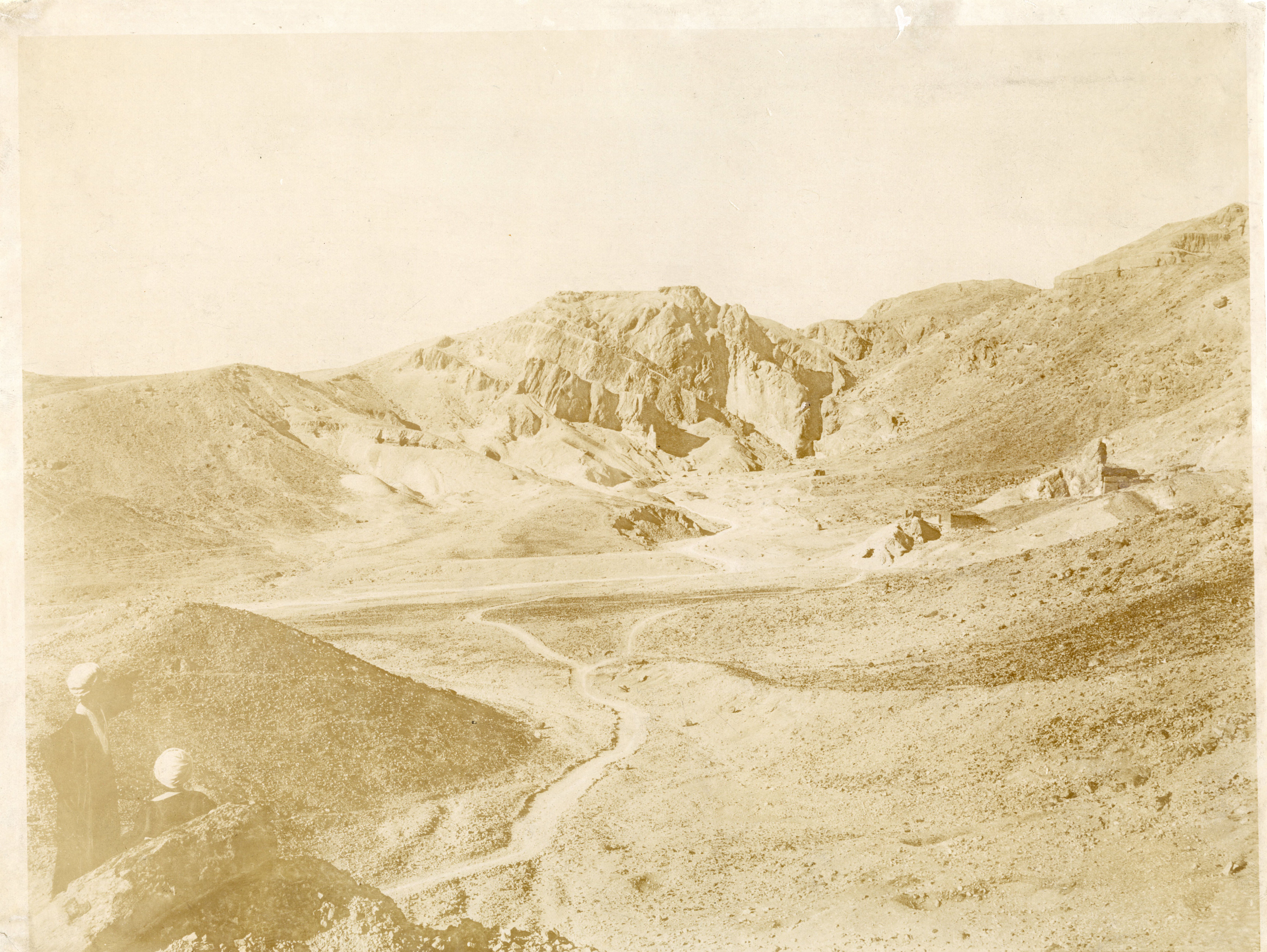 Veduta della parte finale della Valle delle Regine. Al centro, è visibile la struttura in mattoni eretta dalla Missione Archeologica Italiana per proteggere l’ingresso della tomba QV55, di Amenherkhepeshef. Accanto, vi è una tenda conica, forse un punto di appoggio per i primi lavori conservativi, ad opera del restauratore Fabrizio Lucarini. Scavi Schiaparelli.