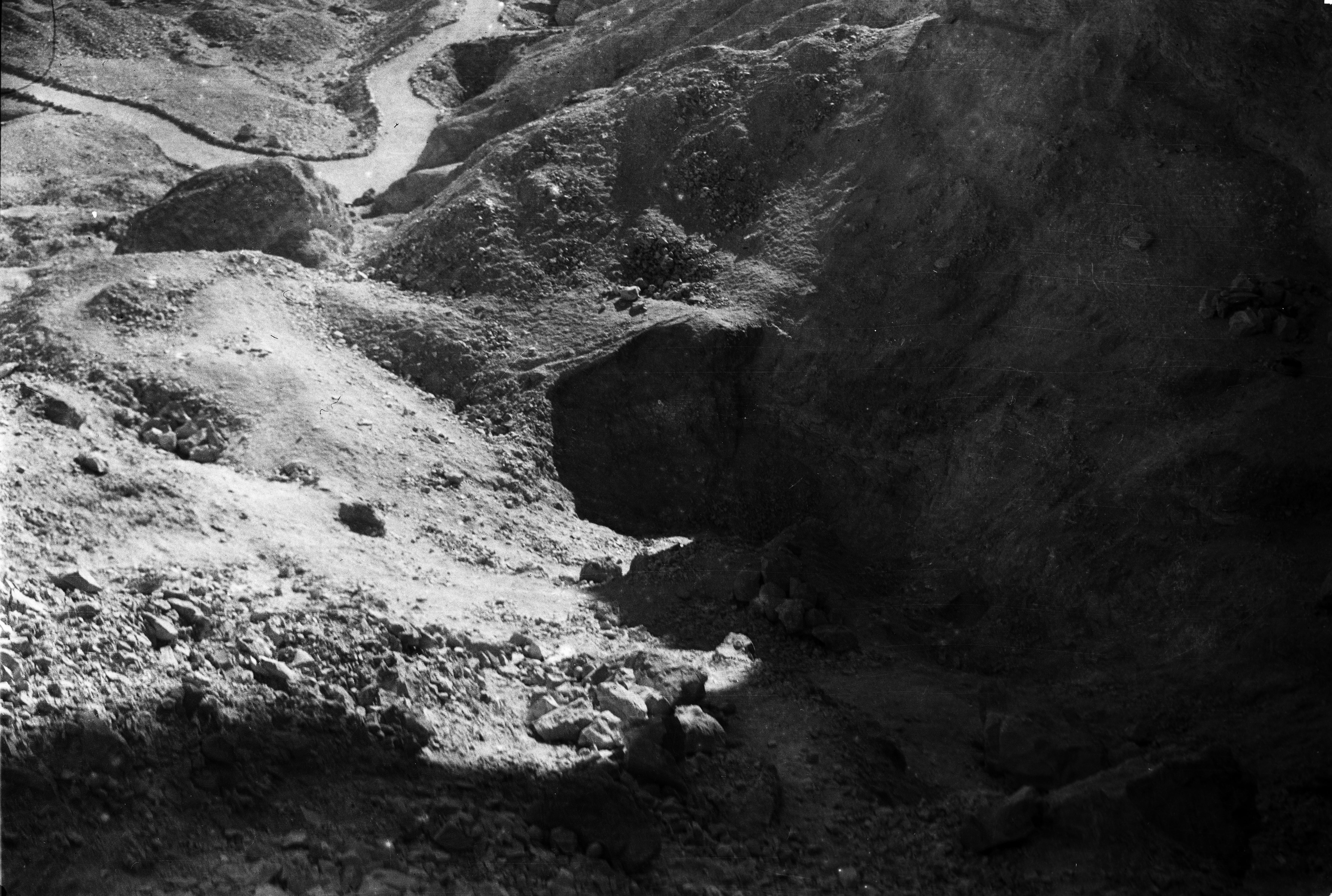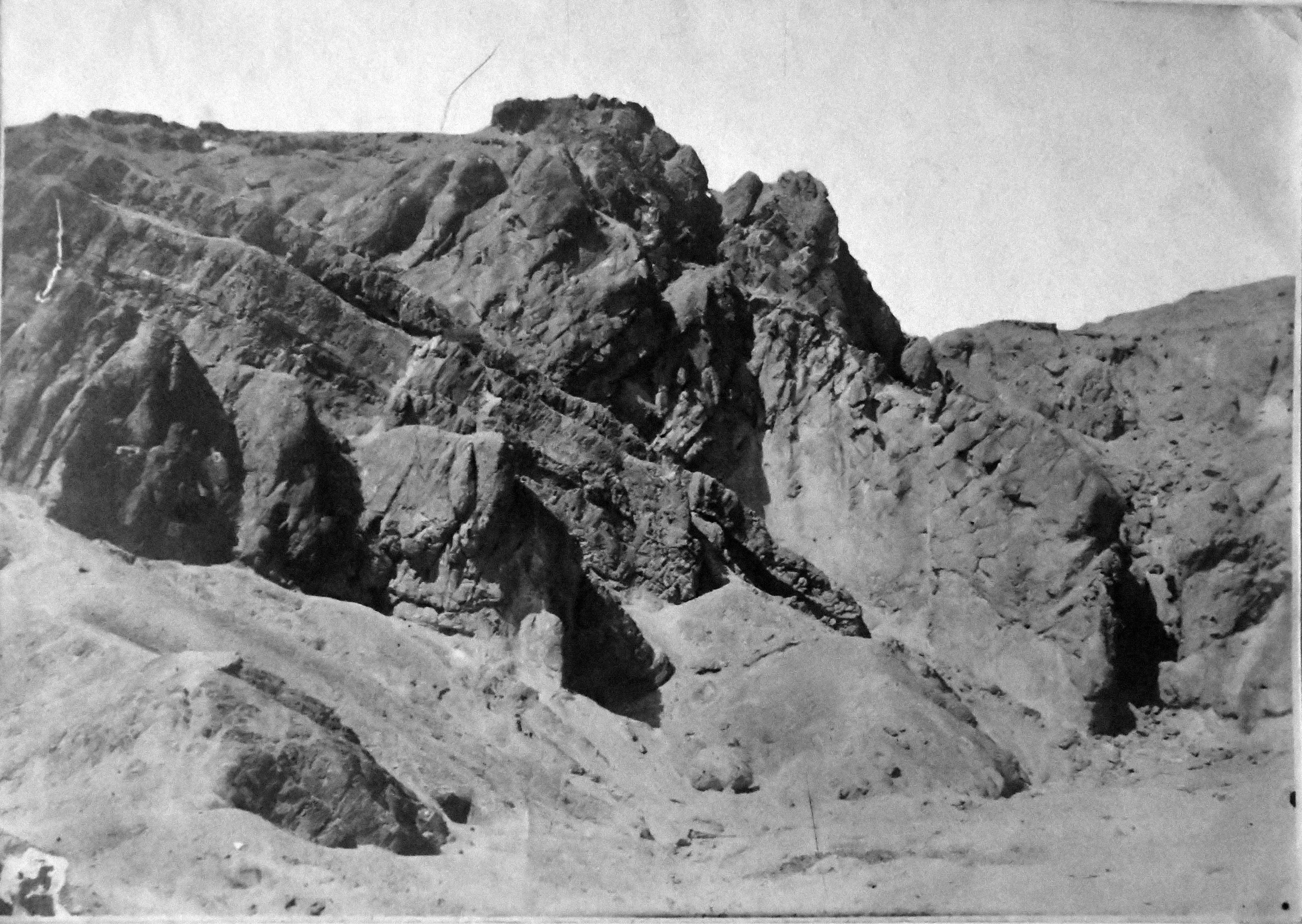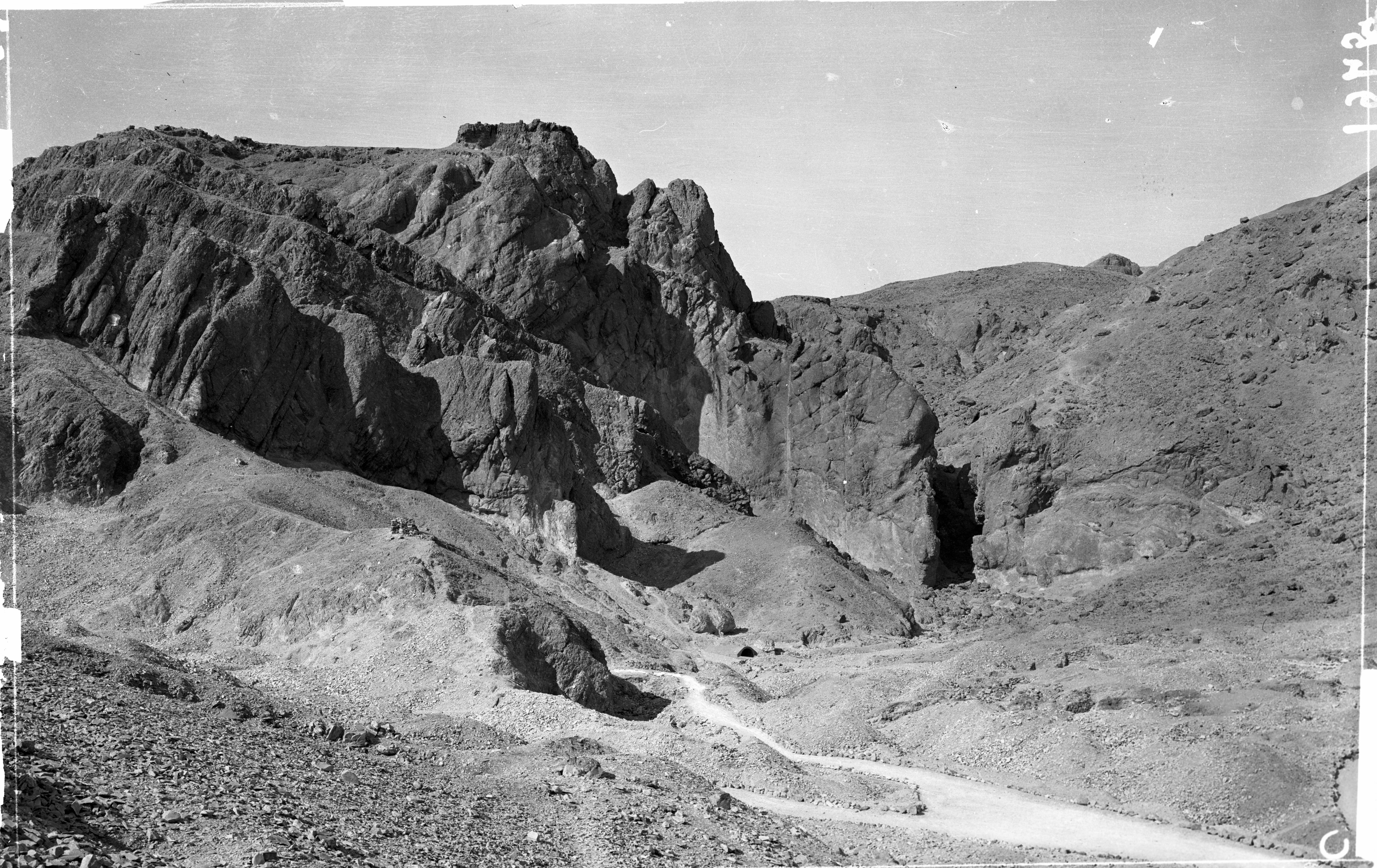 Imboccatura del sentiero che conduce al tempio rupestre di Ptah e Meretseger, fotografato dalla Valle delle Regine. Scavi Schiaparelli.