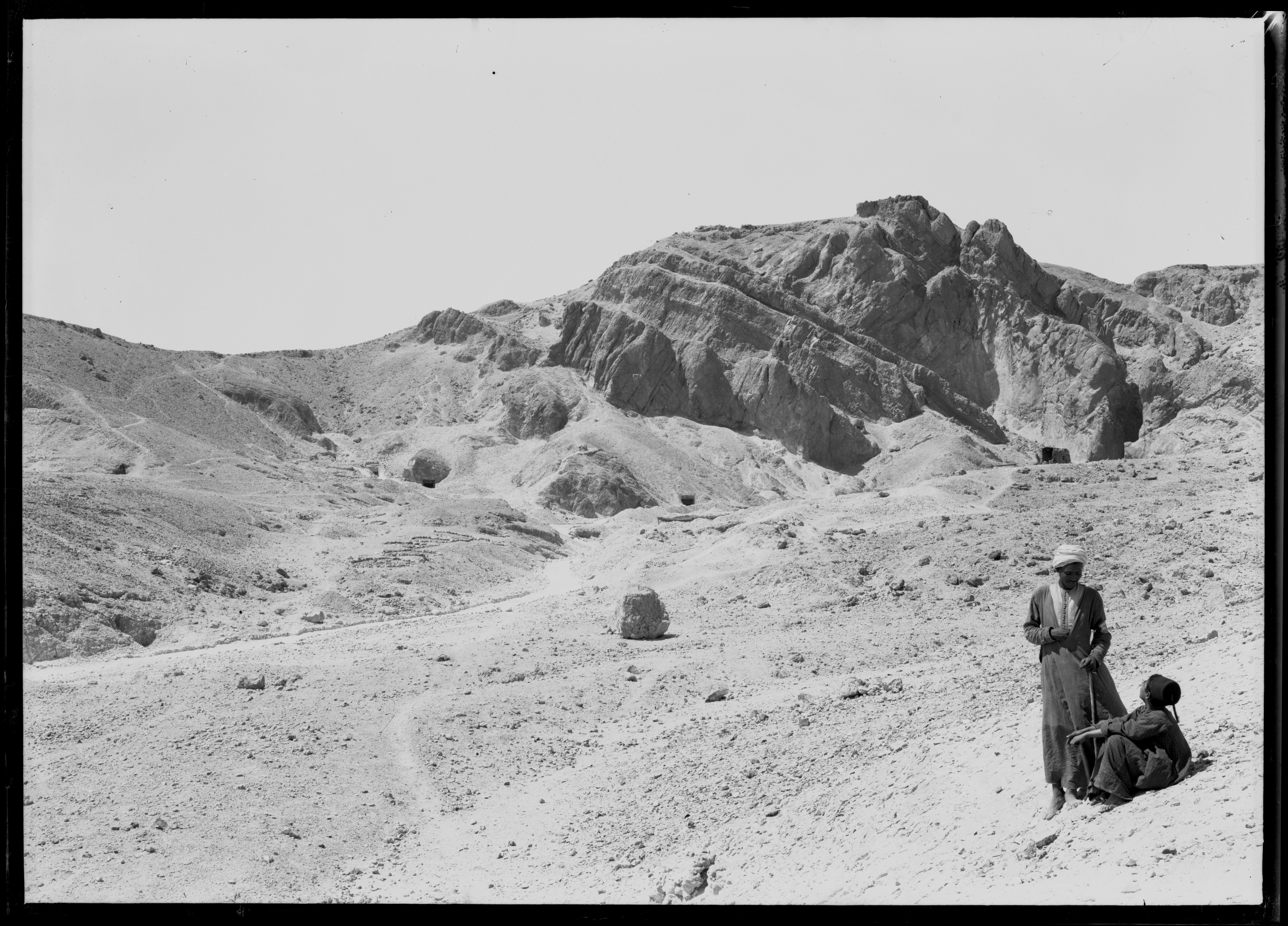 Veduta dell’ingresso della Valle delle Regine. Fotografia con ogni probabilità scattata nella prima metà del Novecento, dalla Missione Archeologica Italiana. In fondo alla Valle, si intravede la costruzione dell'accesso alla tomba di Amenherkhepeshef (QV55).