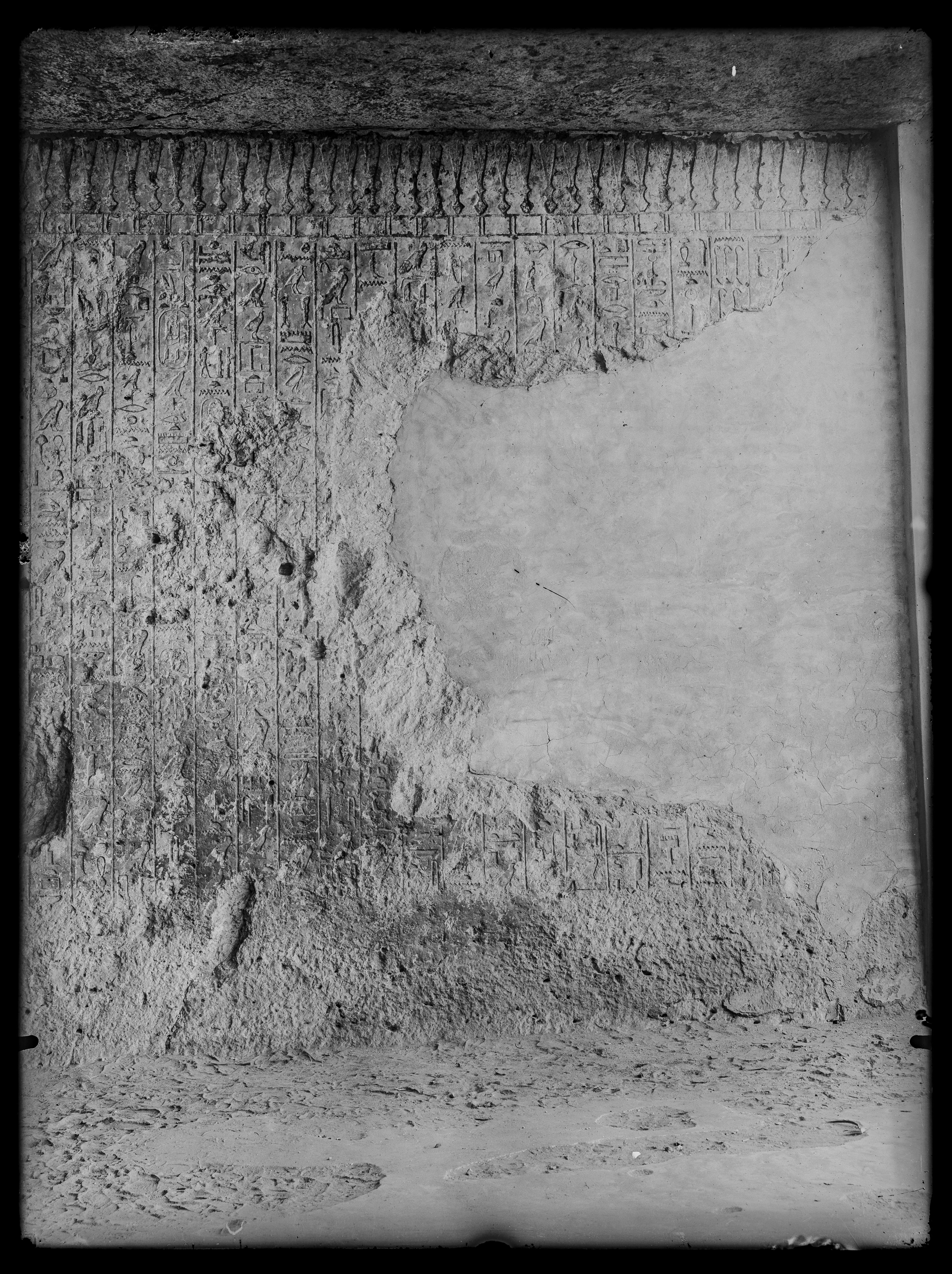 Tomba IV, parete nord, iscrizione autobiografica del nomarca Khety II, governatore di Assiut. Una parte della parete, dove anticamente era stato aperto un passaggio, è già stata murata. Scavi Schiaparelli.
