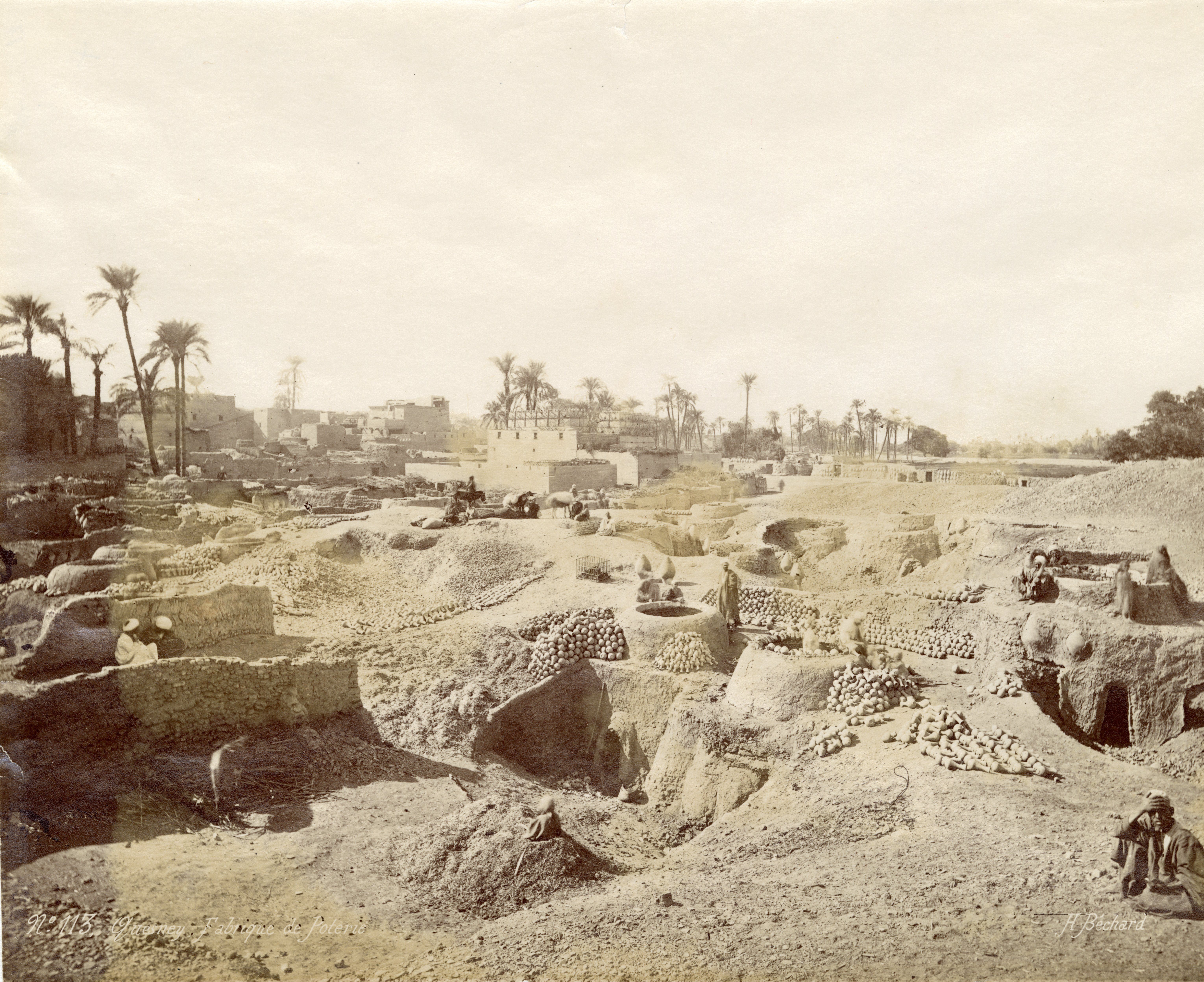 Nella fotografia sono rappresentati alcuni vasai al lavoro nel laboratorio a cielo aperto in un sobborgo sulla riva occidentale nei pressi di Qena, in un’area prossima al tempio di Hathor a Dendera, di cui è riconoscibile una parte sullo sfondo. In basso a destra, la firma dell’autore.