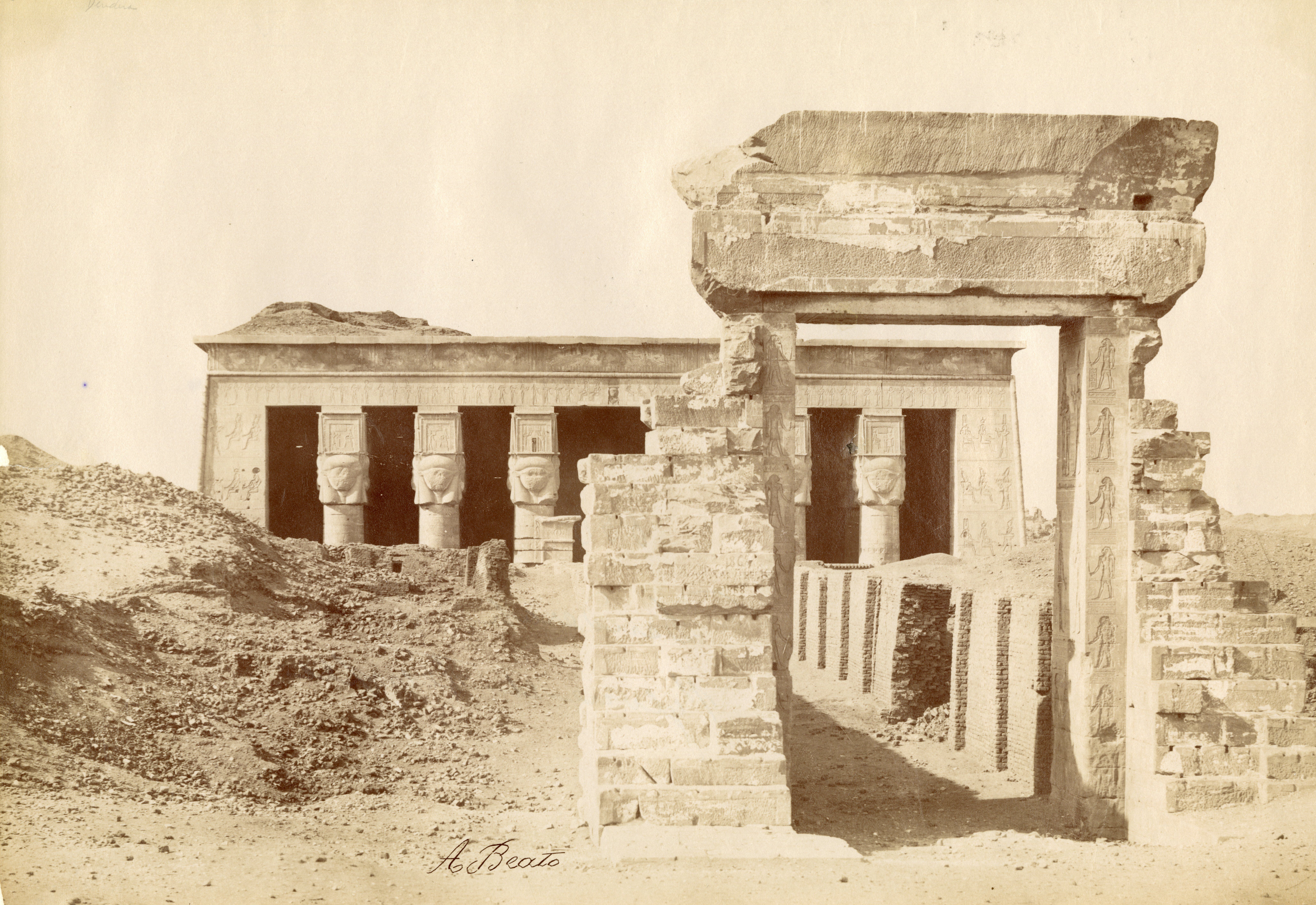 Fotografia dell’accesso (pronao) del tempio di Hathor a Dendera, nel quale si vedono i caratteristici capitelli hathorici (capitelli con la testa della dea Hathor scolpita in rilievo su ogni lato), ma anche delle strutture antistanti in mattoni crudi. La firma dell’autore si trova in basso a destra.