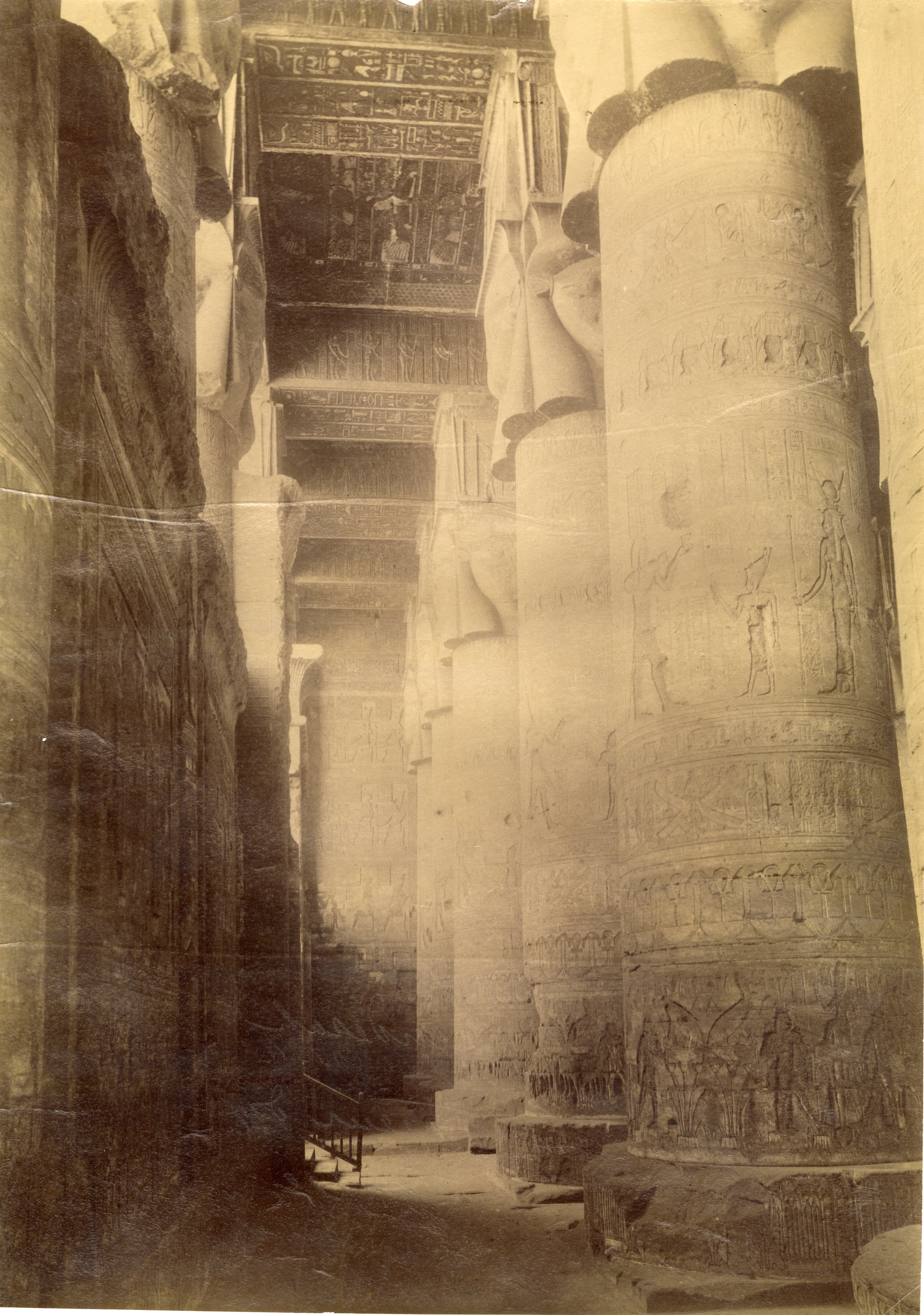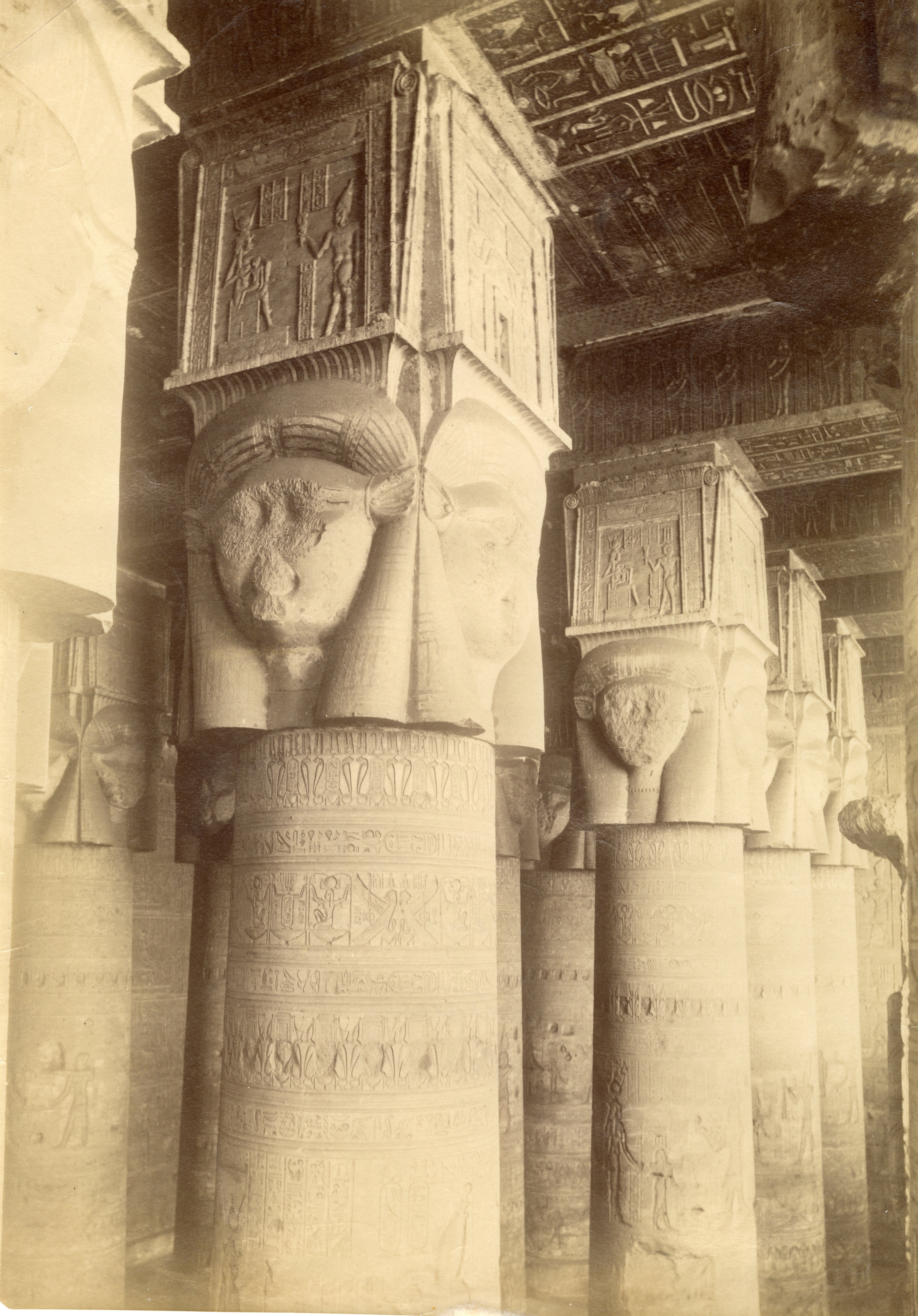 La fotografia ritrae il colonnato della sala ipostila, di età romana, del tempio di Hathor a Dendera. Da notare le iscrizioni sul soffitto e i capitelli hathorici (capitelli con la testa della dea Hathor scolpita in rilievo su ogni lato) ulteriormente decorati con scene sacre. Lo scatto è attribuibile ad Antonio Beato.