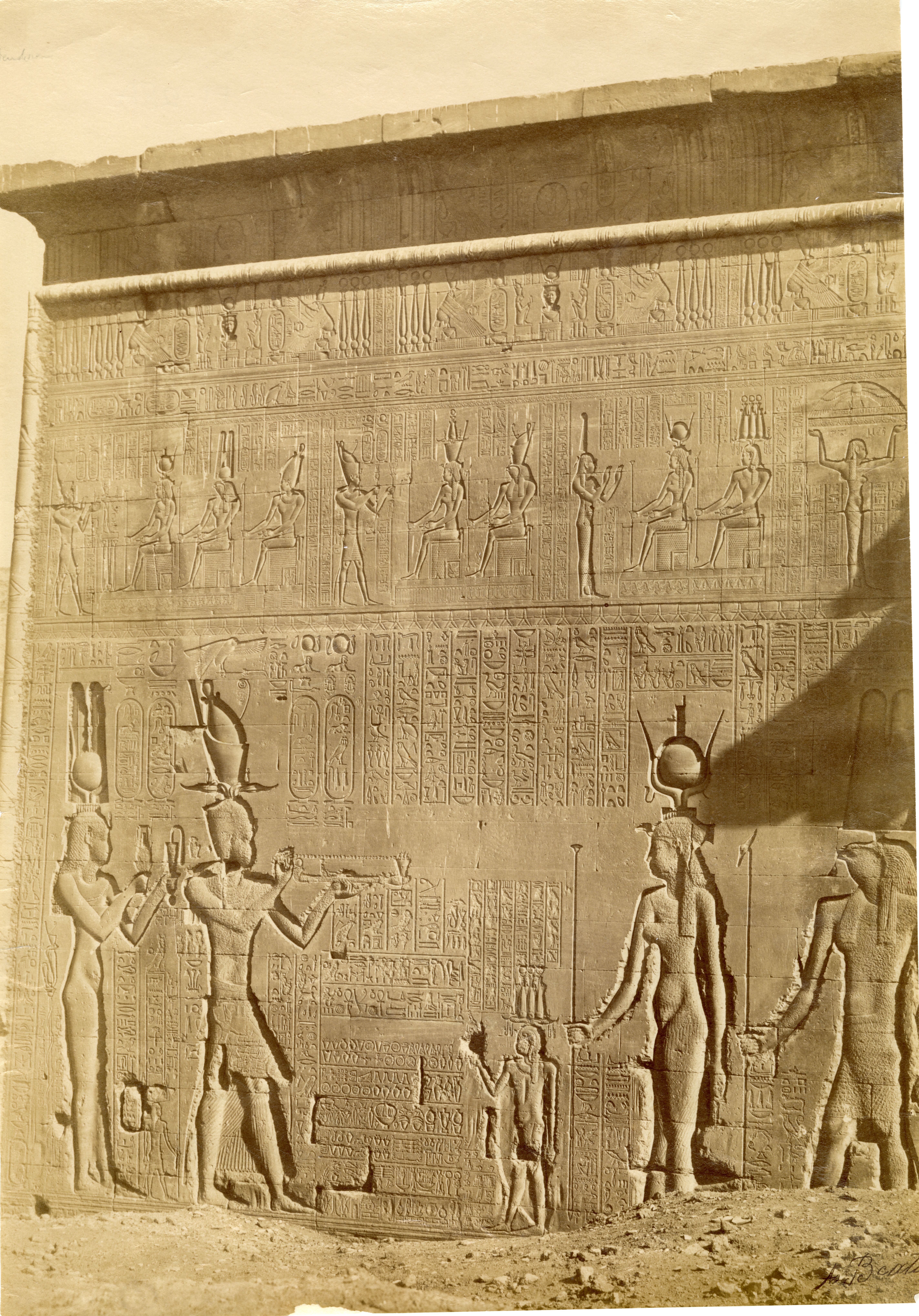 Veduta di una scena sacra sulla parete esterna (meridionale) del tempio di Hathor a Dendera, nella quale Cleopatra VII e Tolemeo XV Cesarione (a sinistra) compiono dei rituali in onore degli dei Harsomtu (in dimensioni minori), Iside, Harsomtu e di altre divinità non visibili in questo scatto. La firma dell'autore è apposta in basso a destra.