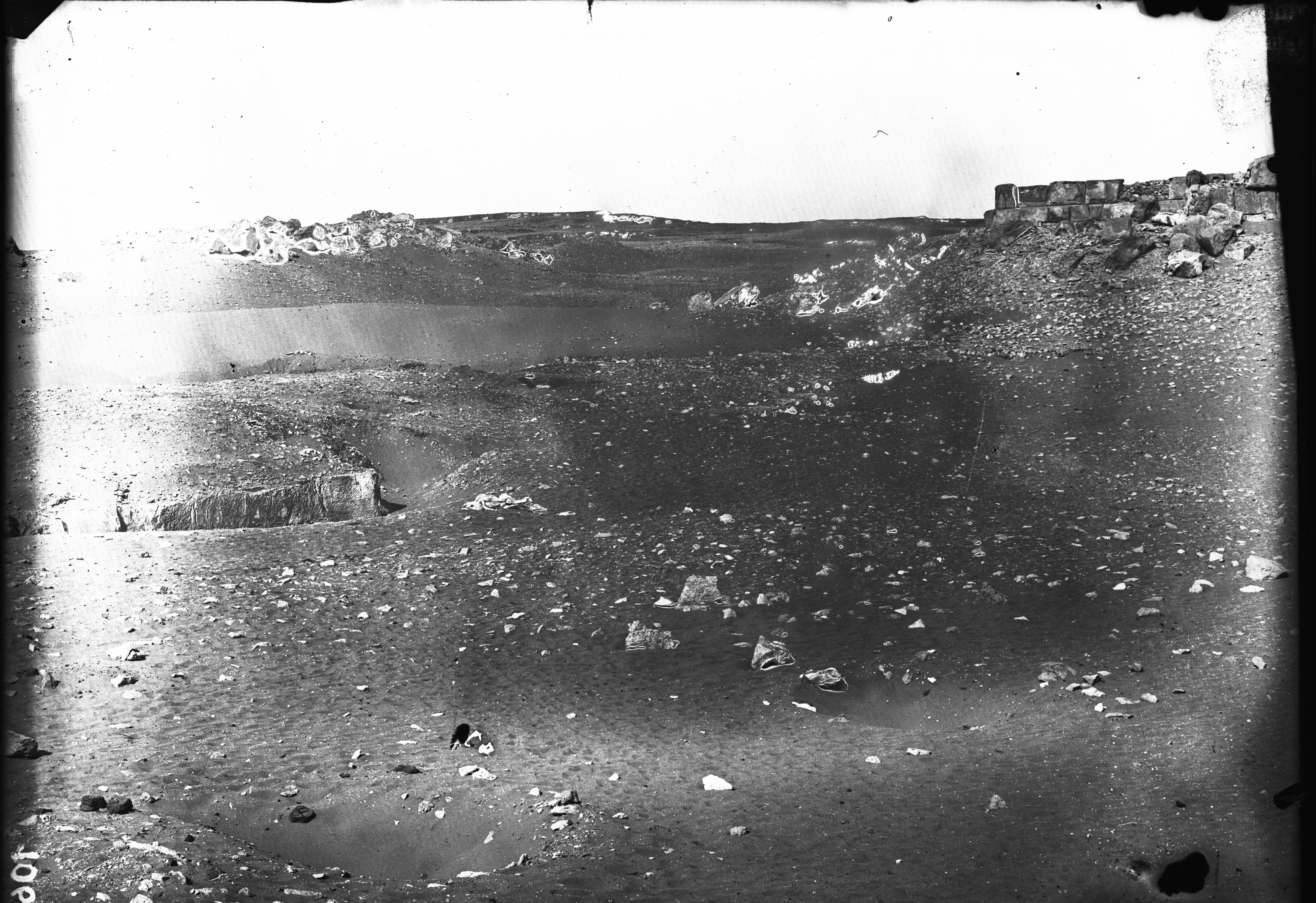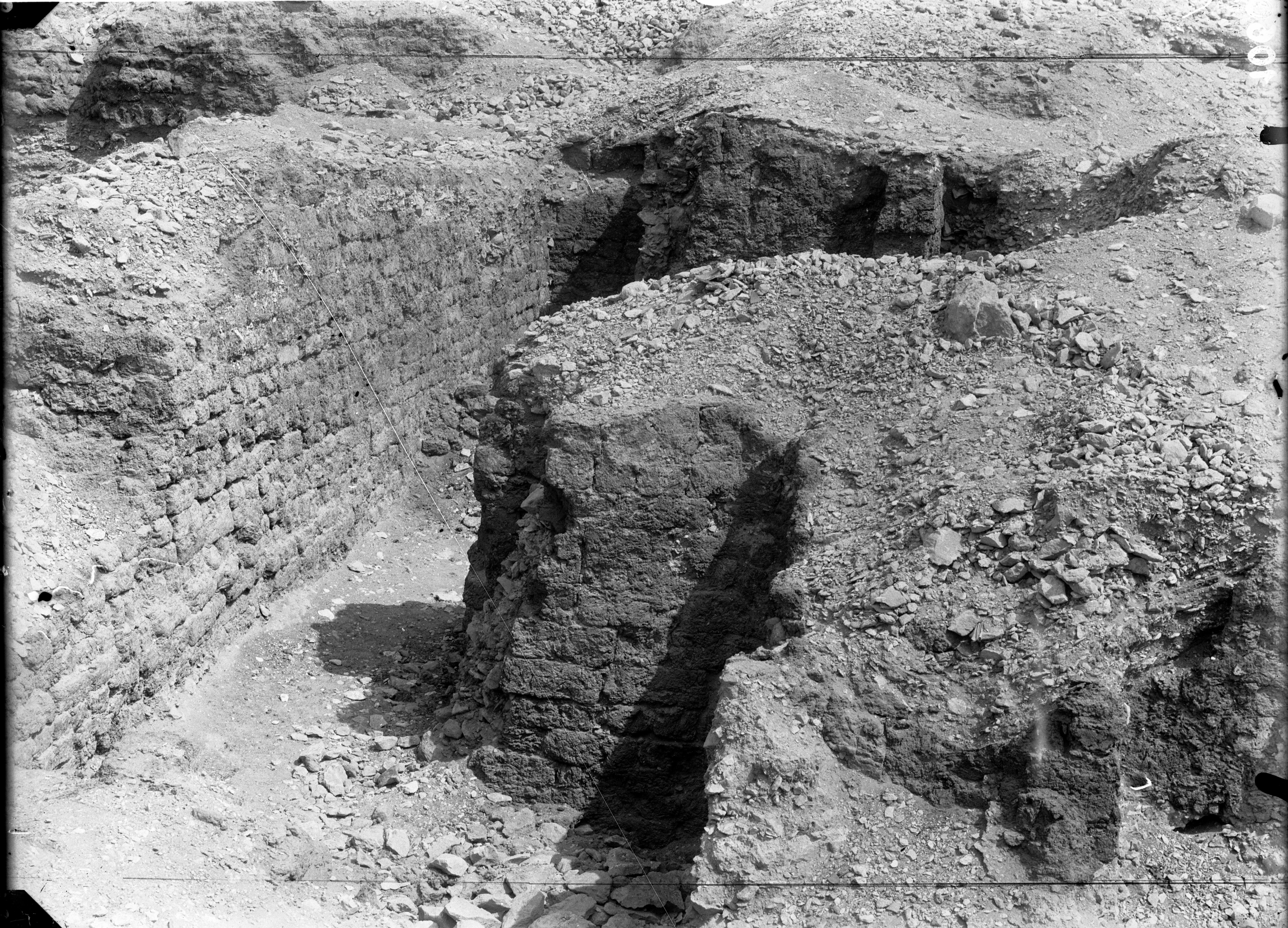 Veduta dei resti di una struttura davanti ad una tomba a mastaba appena scavata, della quale si riconosce la muratura sulla destra della fotografia. Purtroppo nessun elemento ci permette di poter localizzare né identificate i soggetti rappresentati. Scavi Schiaparelli.