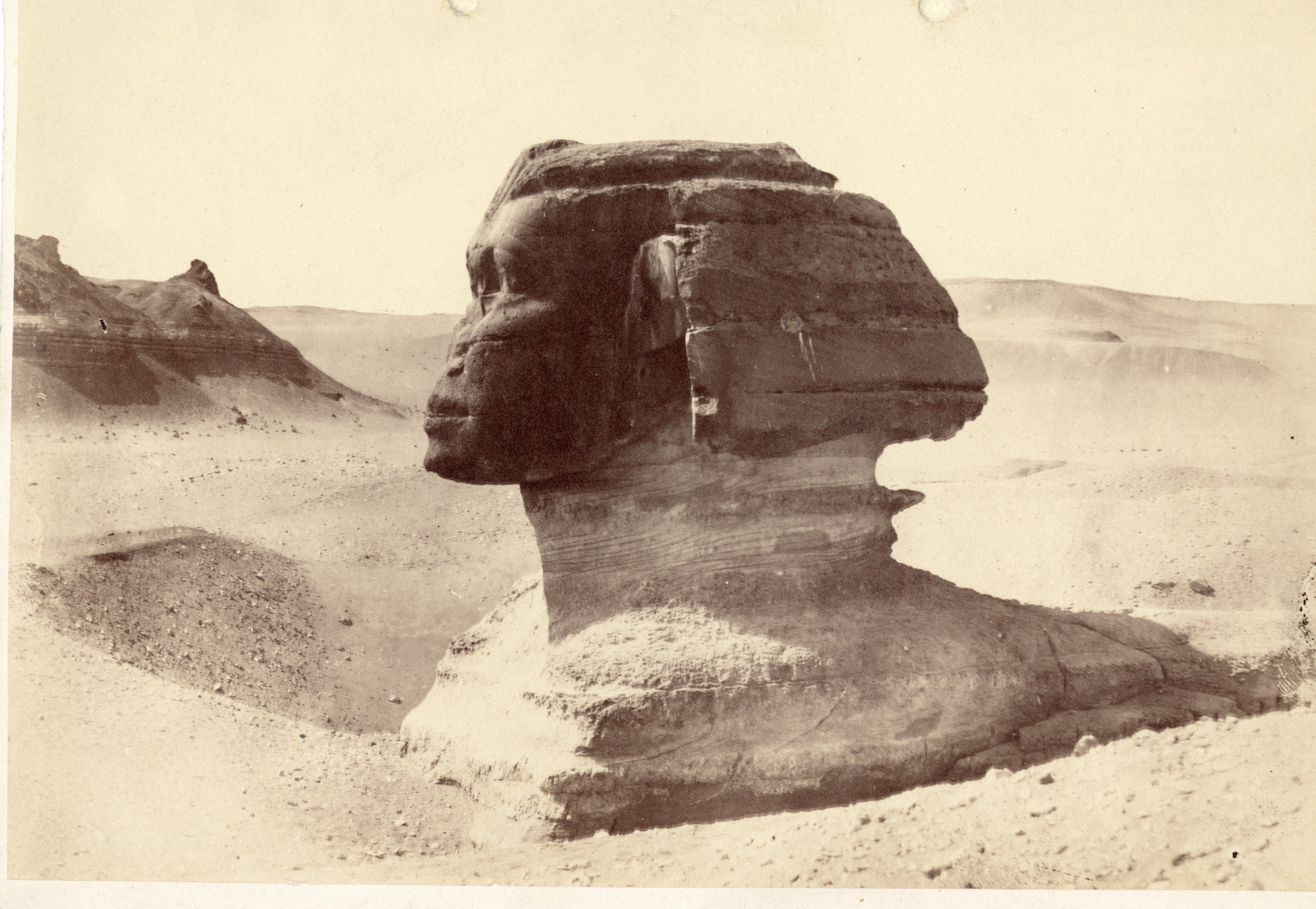 Fotografia della Sfinge nella piana di Giza vista lateralmente (da nord). Il monumento è ancora parzialmente sepolto dalle sabbie del deserto. In base allo stile della fotografia, si potrebbe attribuire lo scatto a V. R. Lanzone.