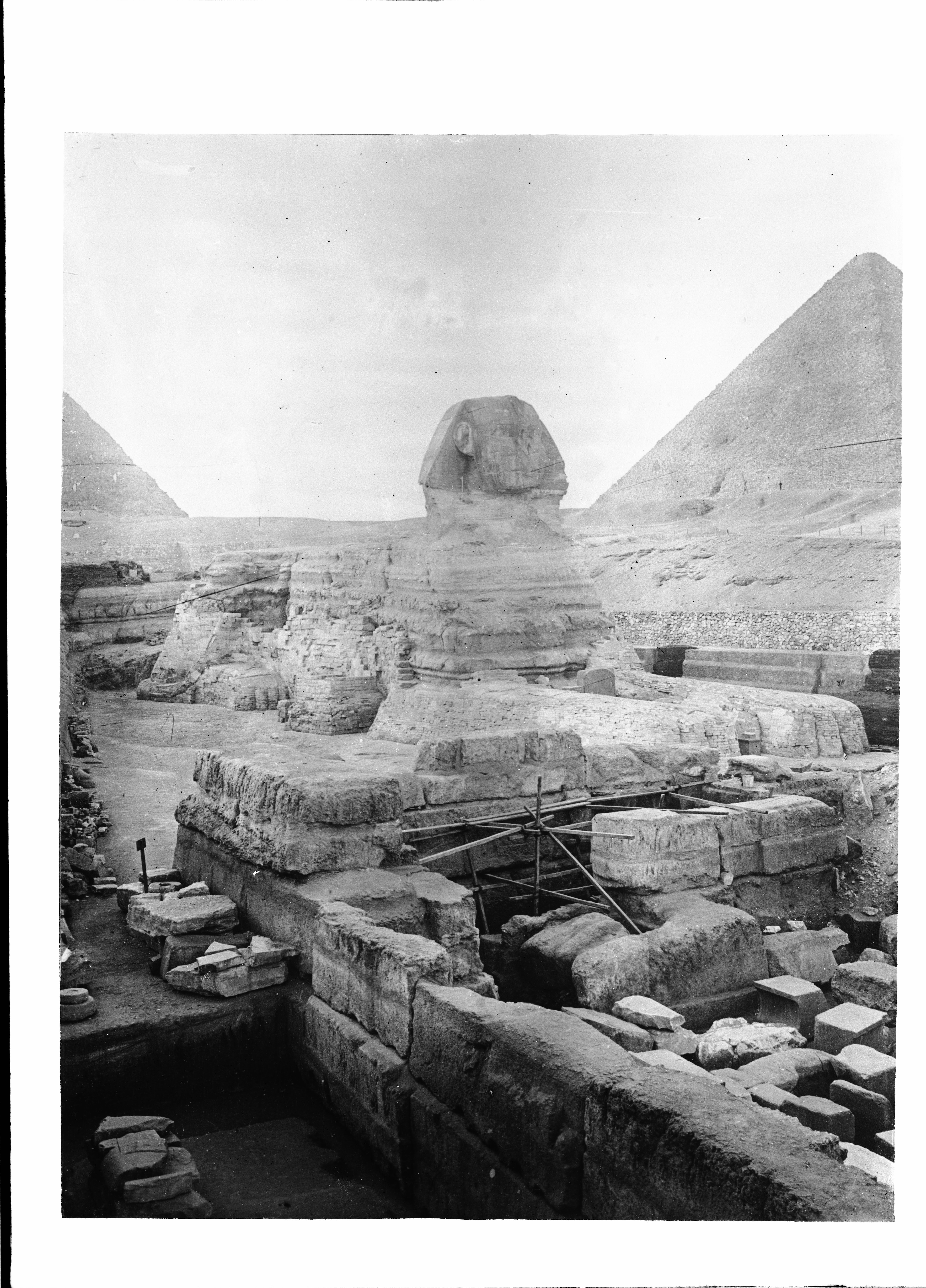 Veduta della Sfinge, a destra: la piramide di Cheope; a sinistra: la piramide di Chefren. In primo piano: i resti del tempio funerario di Chefren. Scavi Schiaparelli.