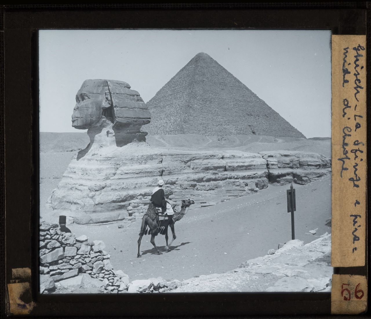 Uomo sul cammello davanti alla Sfinge, che risulta solo parzialmente liberata dalla sabbia. Sullo sfondo si riconosce la piramide di Cheope. É probabile che si tratti di una foto ottocentesca. Fotografia da riflettere sul quadro orizzontale.