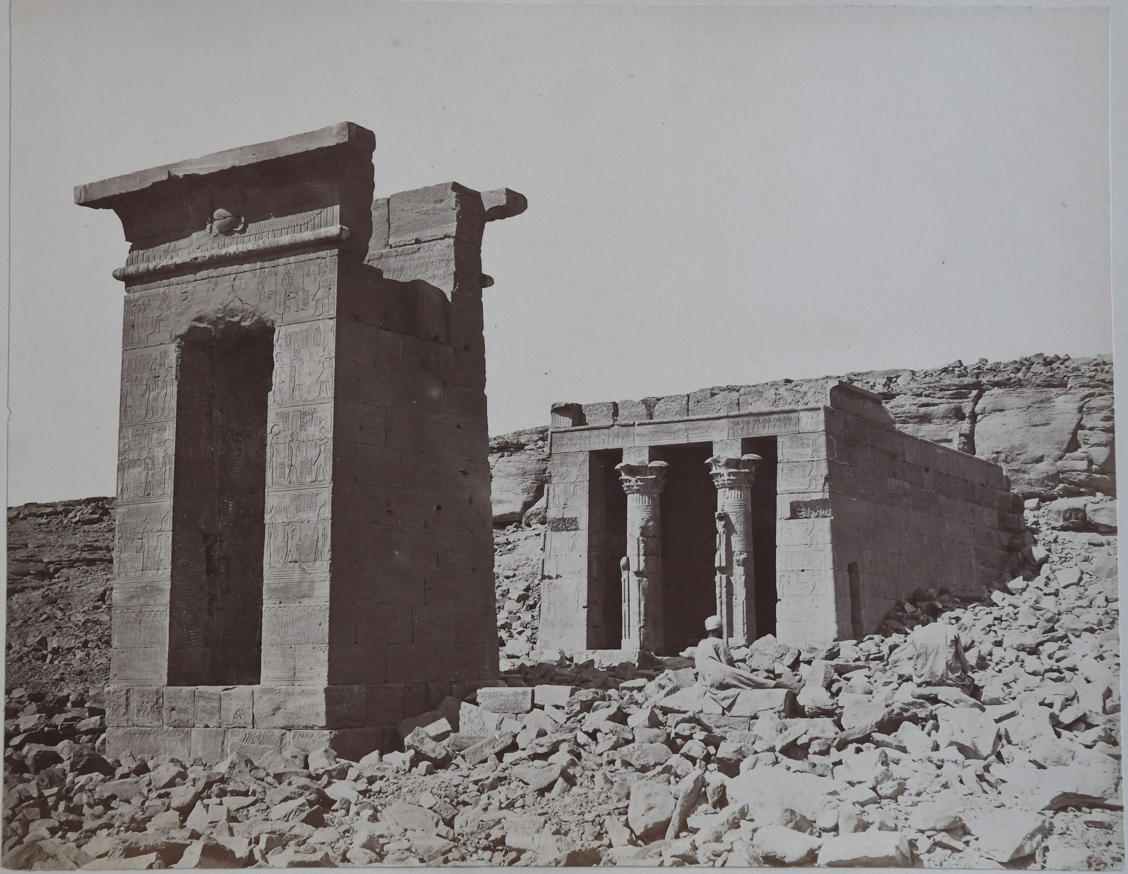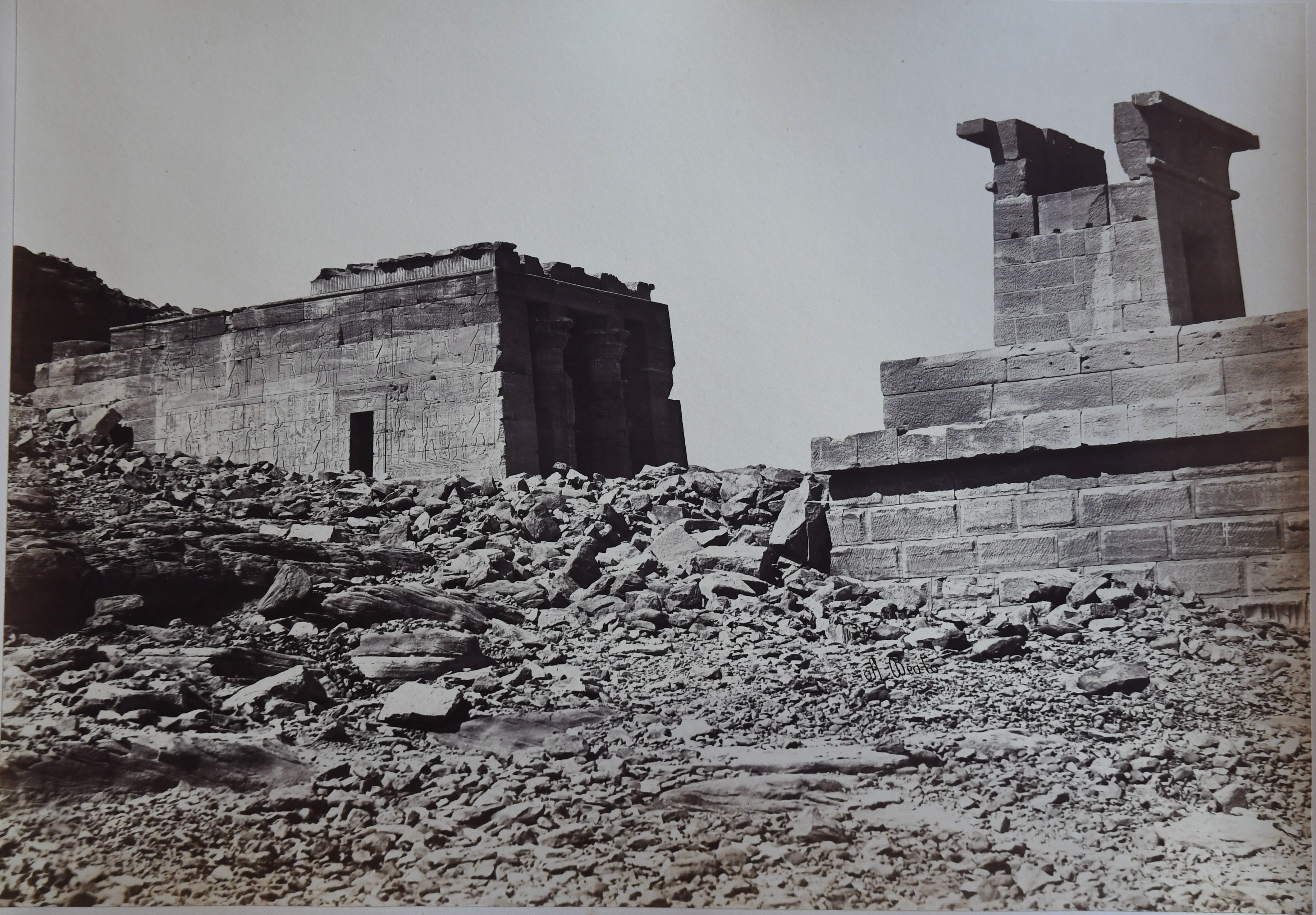 Veduta dei resti del tempio romano di Dendur, nella sua posizione originaria, dedicato a Iside, Osiride e a due figli divinizzati di un capo nubiano locale, Pihor e Pediese. Il tempio, a rischio sommersione in seguito alla costruzione della diga di Assuan e al nascente lago Nasser, venne rimosso nel 1963 e poi donato dal Governo Egiziano agli Stati Uniti per il loro aiuto e assistenza nell’opera di salvataggio dei templi nubiani e documentazione del territorio. Oggi si trova all’interno del Metropolitan Museum of Art (The MET), a New York. In basso a destra, la firma dell’autore.
