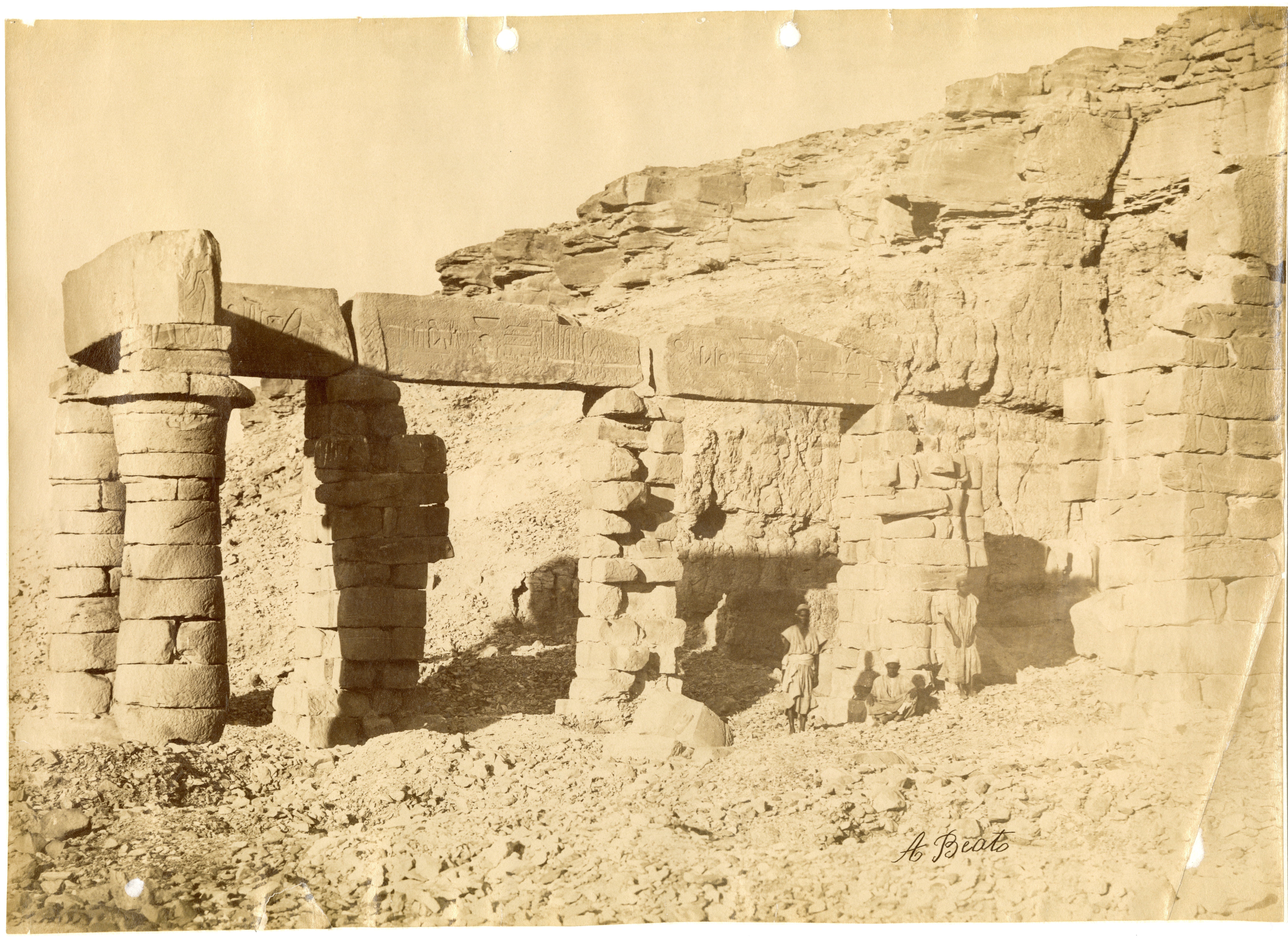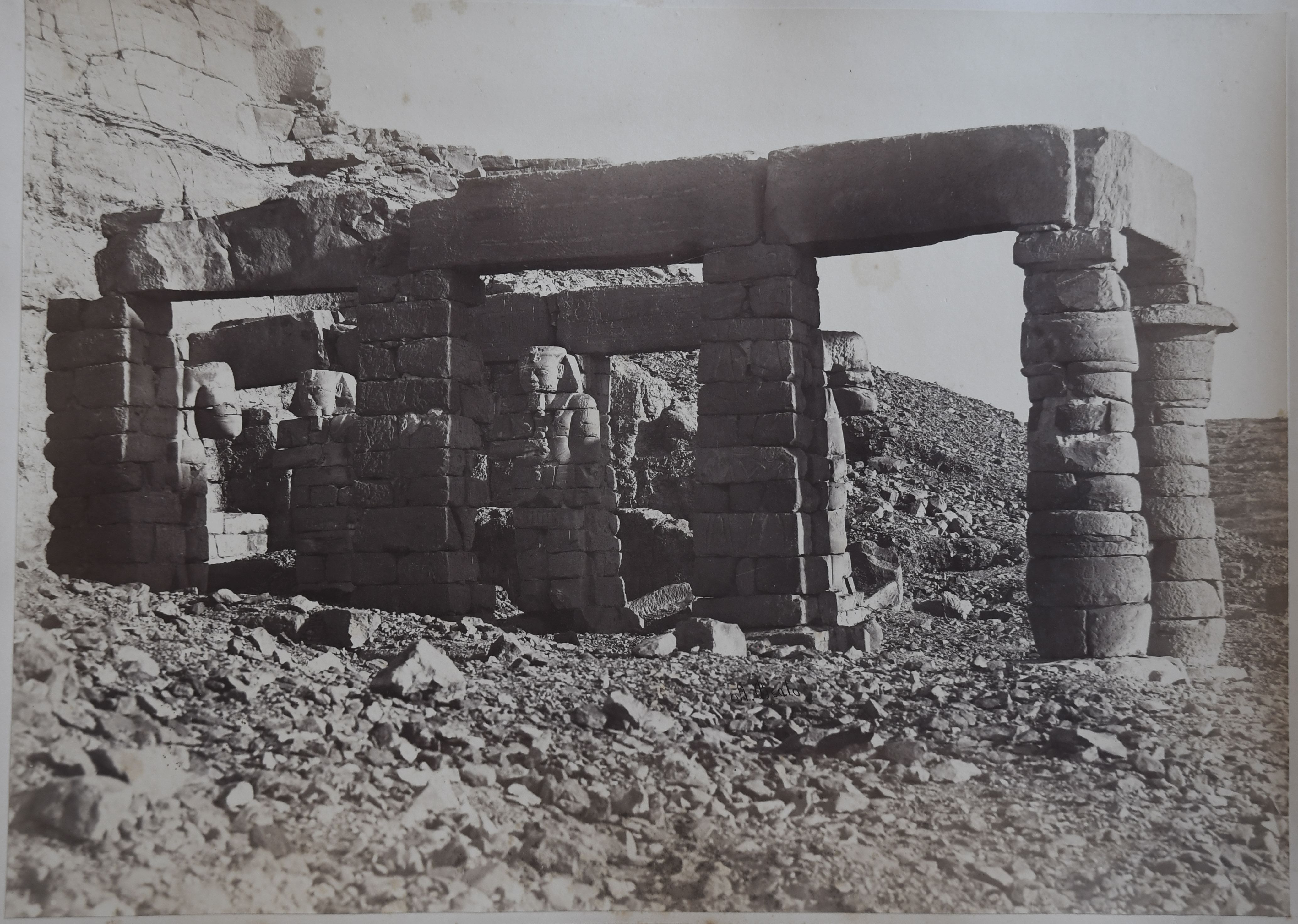 La fotografia mostra le rovine del lato meridionale della sala colonnata del tempio di Gerf Hussein, costruito da Ramesse II in onore di Ptah, con tre abitanti locali in posa. Negli anni '60 del XX secolo (1962-1963) i resti del colonnato furono smontati e trasferiti nei pressi di Nuova Kalabsha, un’altura poco distante da Assuan. La parte scavata nella roccia, invece, è stata sommersa dal Lago Nasser. La firma dell'autore è apposta in basso a destra.